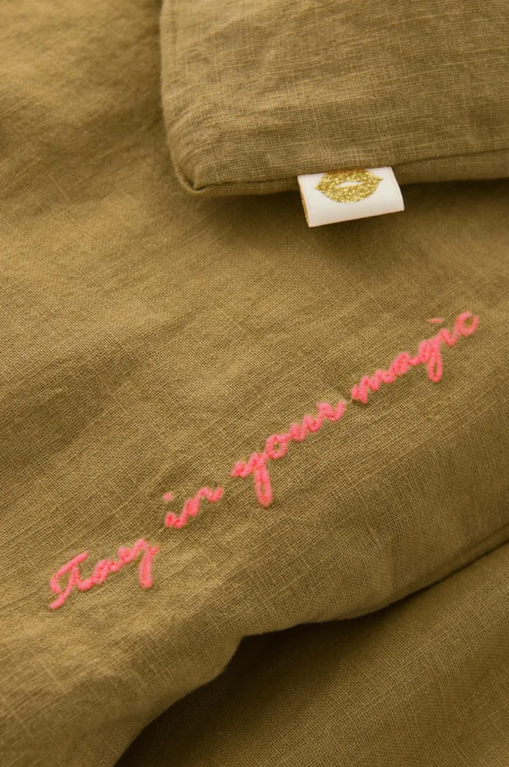 • Dynebetrækket har den broderede tekst “Stay in your magic” på forsiden.