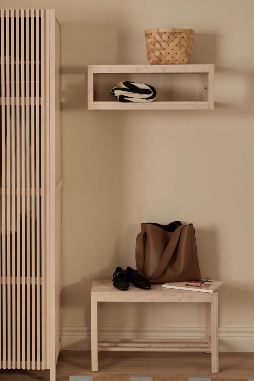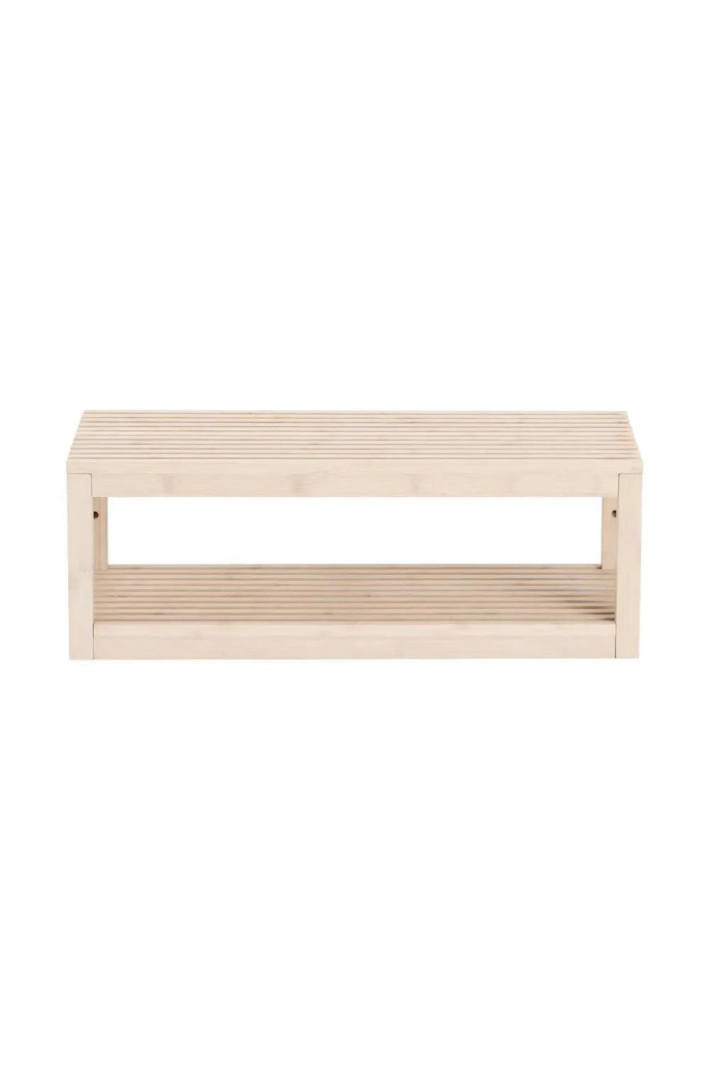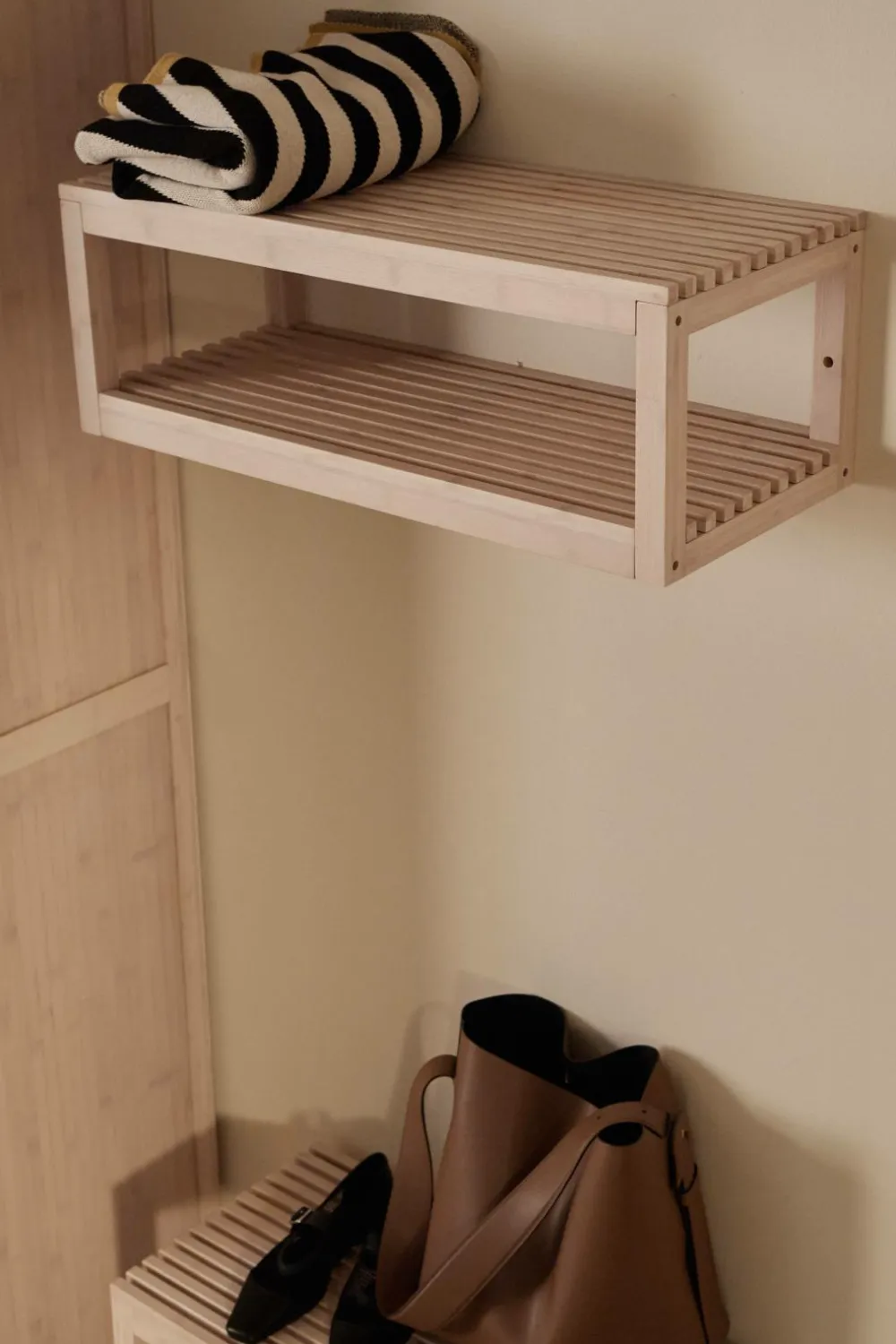En hylde med 2 hylder, der kan bruges som både hattehylde og skohylde. Kan placeres på gulvet eller hænges op på væggen.