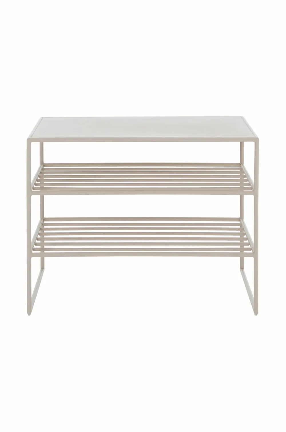 Skoreol/bænk i pulverlakeret metal. 2 hylder under toppladen. Højde mellem hylderne 14/16,5 cm. Frihøjde under hylden 17 cm. Maks. vægtbelastning på bænken 100 kg. Maks. belastning pr. hylde under bænken 50 kg.
