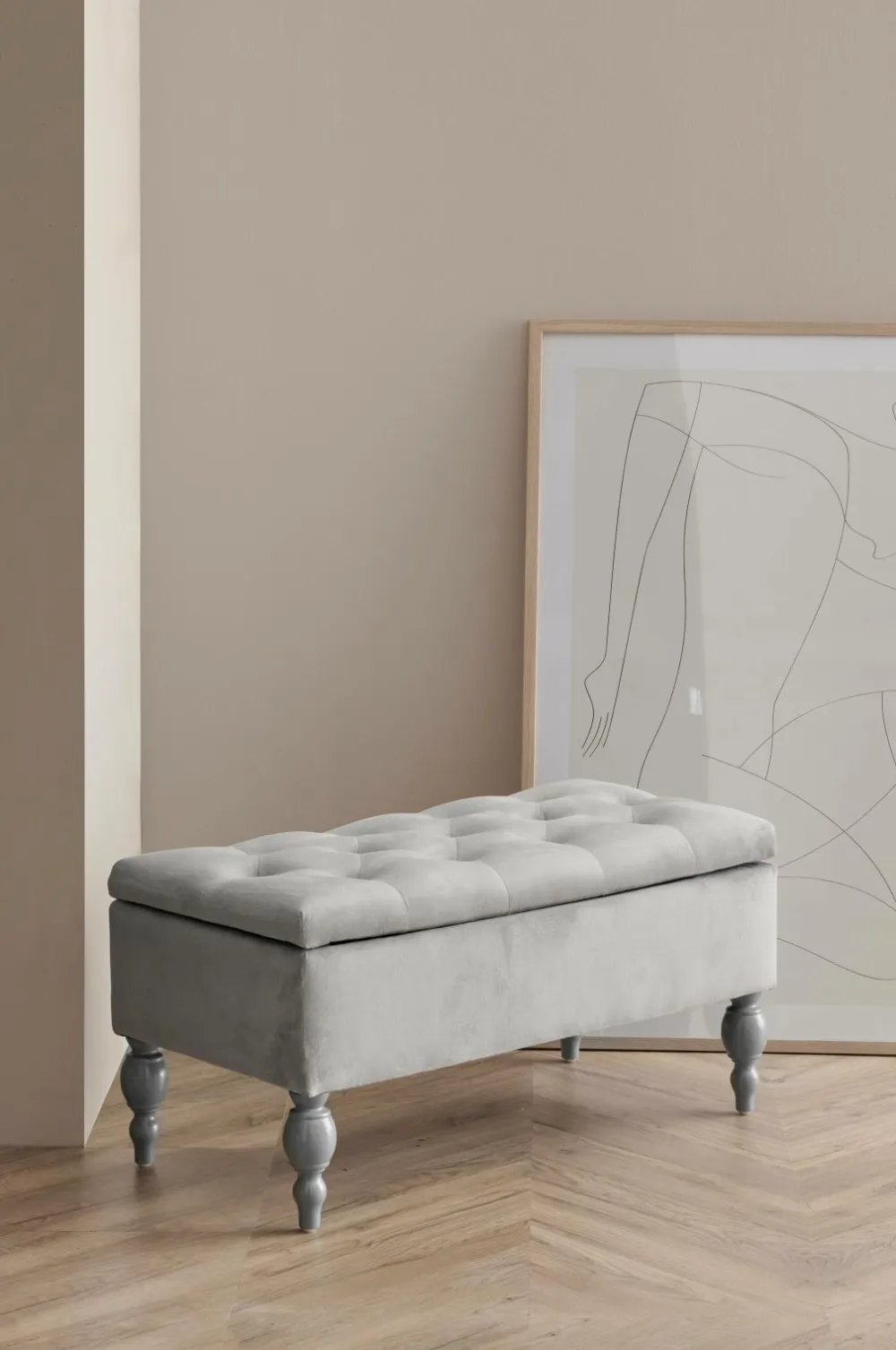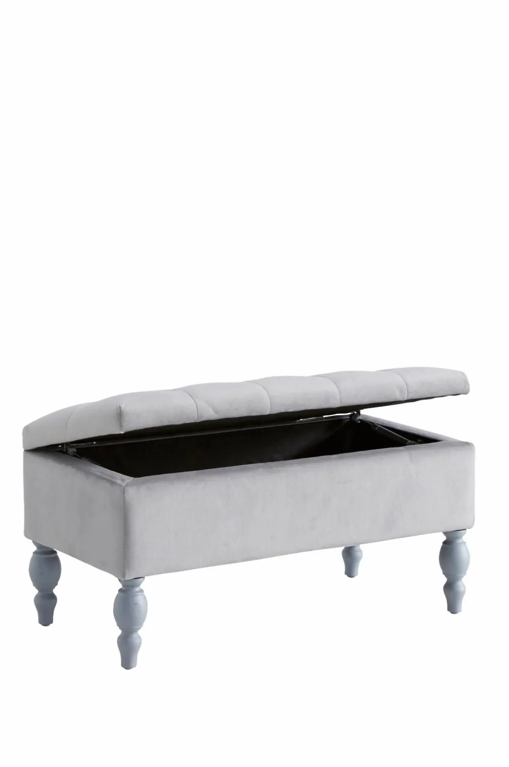Opbevaringsbænk med betræk i polyestervelour. Stel af fyrretræ og plywood. Ben i gummitræ. Polstring af polyether. Opbevaringsrum i bænken, klap, der kan vippes op med hængsel og gasfjedre, der gør, at klappen åbnes og lukkes blidt og dæmpet uden klemmerisiko. Bredde 80 cm, dybde 40 cm, højde 40 cm. Mål indvendigt: 30×70 cm. Frihøjde 16 cm. Maks. belastning 130 kg. Lev. samlet. Produktet indeholder FSC-certificeret træ, som er fældet i et ansvarsfuldt skovbrug, der tager hensyn til mennesker og miljø.