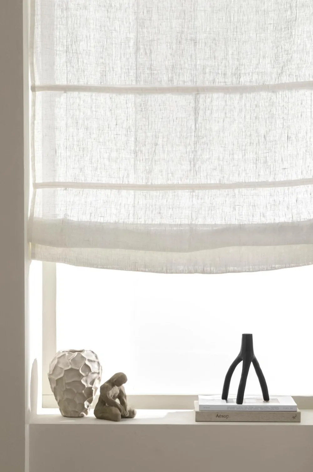 Liftgardin af hør i vasket, tynd vævet kvalitet. Leveres færdigmonteret med træpinde foroven og metalpinde forneden. Længde 160 cm. Findes i flere forskellige bredde.