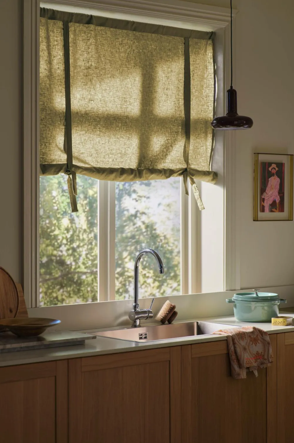 • Hvis du vil have en lige kant, skal du rulle gardinet rundt om en træpind (træpind medfølger ikke).