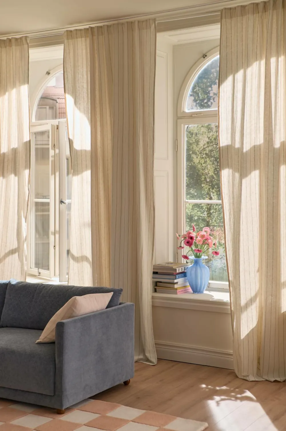 • Multibåndet gør, at du enten kan hænge gardinerne direkte på en gardinstang gennem de skjulte stropper eller anvende ringe, nålekroge eller fingerkroge. Snoren i rynkebåndet gør, at du let kan skabe ensartede, flotte læg.