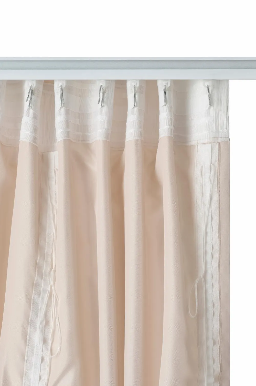 • Gardinet har indsyede lodrette snore, som gør det muligt at trække det op og skabe stilfulde, draperede effekter. Gardinet kan trækkes op til maksimalt ca. 60 cm. Snorene kan skjules i folden i bunden.