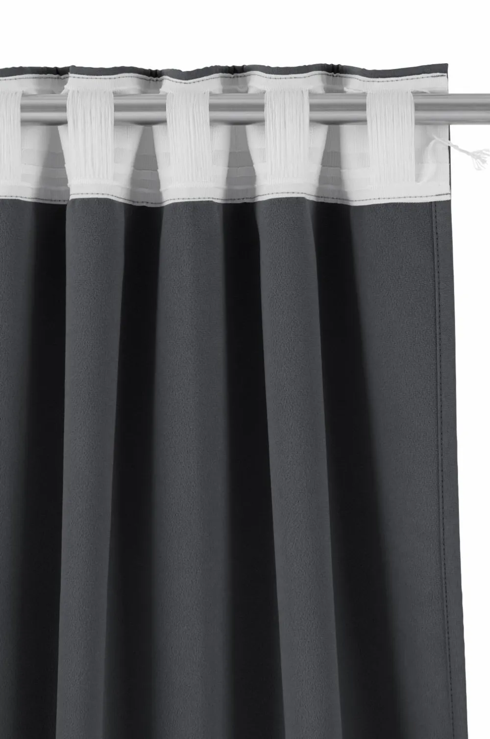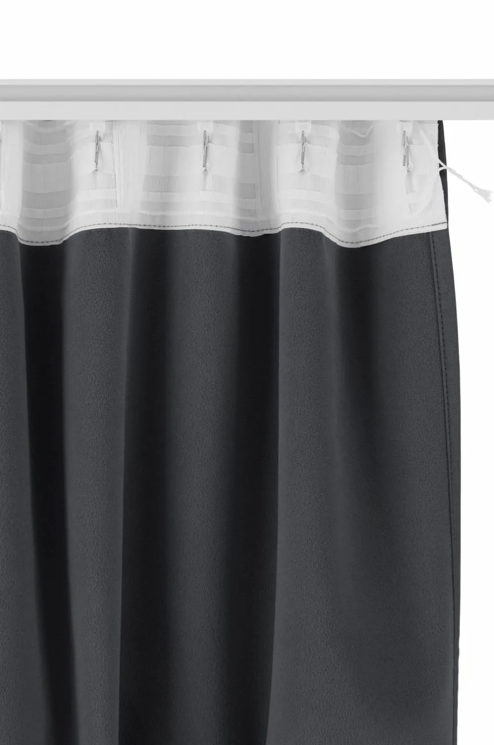 Multibåndslængde i dobbelte lag med høj mørklæggende effekt. Et lag er polyester med vævede tråde og et lag er polyester fleece. Kraftige stoffer i et rum giver også en lyddæmpende effekt.