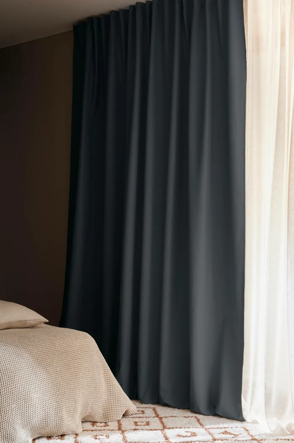 Ekstra bred multibåndslængde i dobbeltlag med høj mørklægningseffekt. Et lag er polyester med vævede tråde og et lag er polyesterfleece. Kraftigt stoffer i et rum giver også en lyddæmpende effekt.