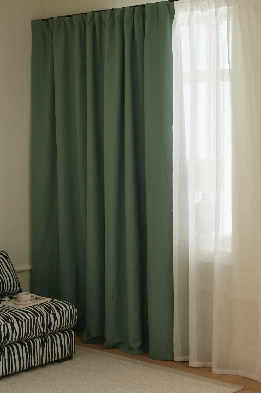 To-lags mørklægningsgardin, et lag i hørblanding og et mørklægningslag i genbrugspolyester.