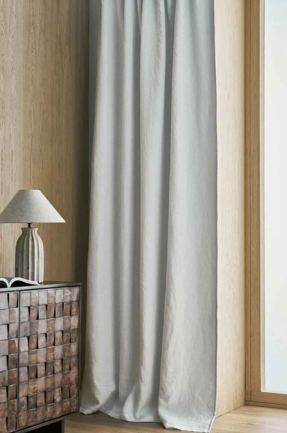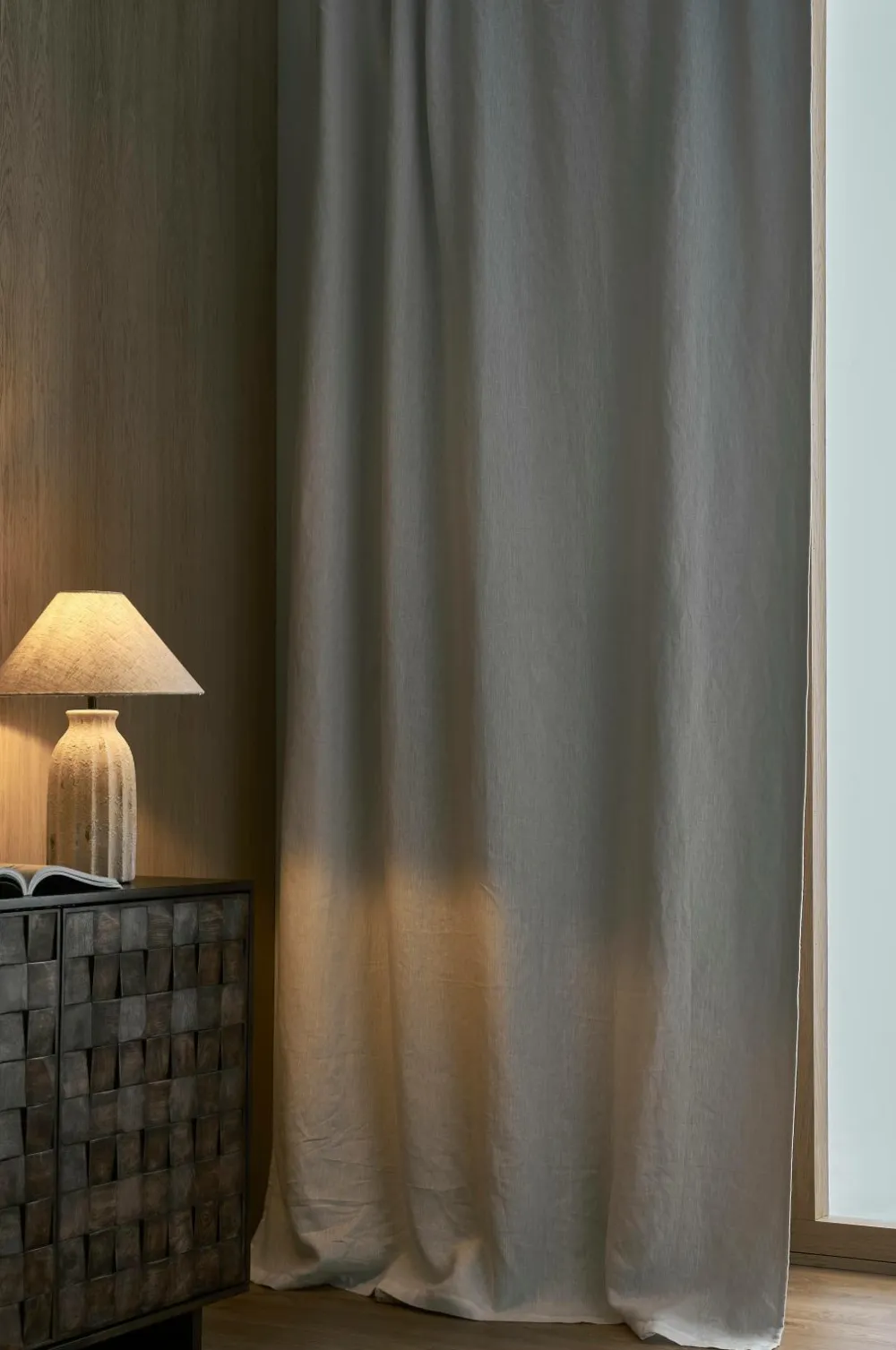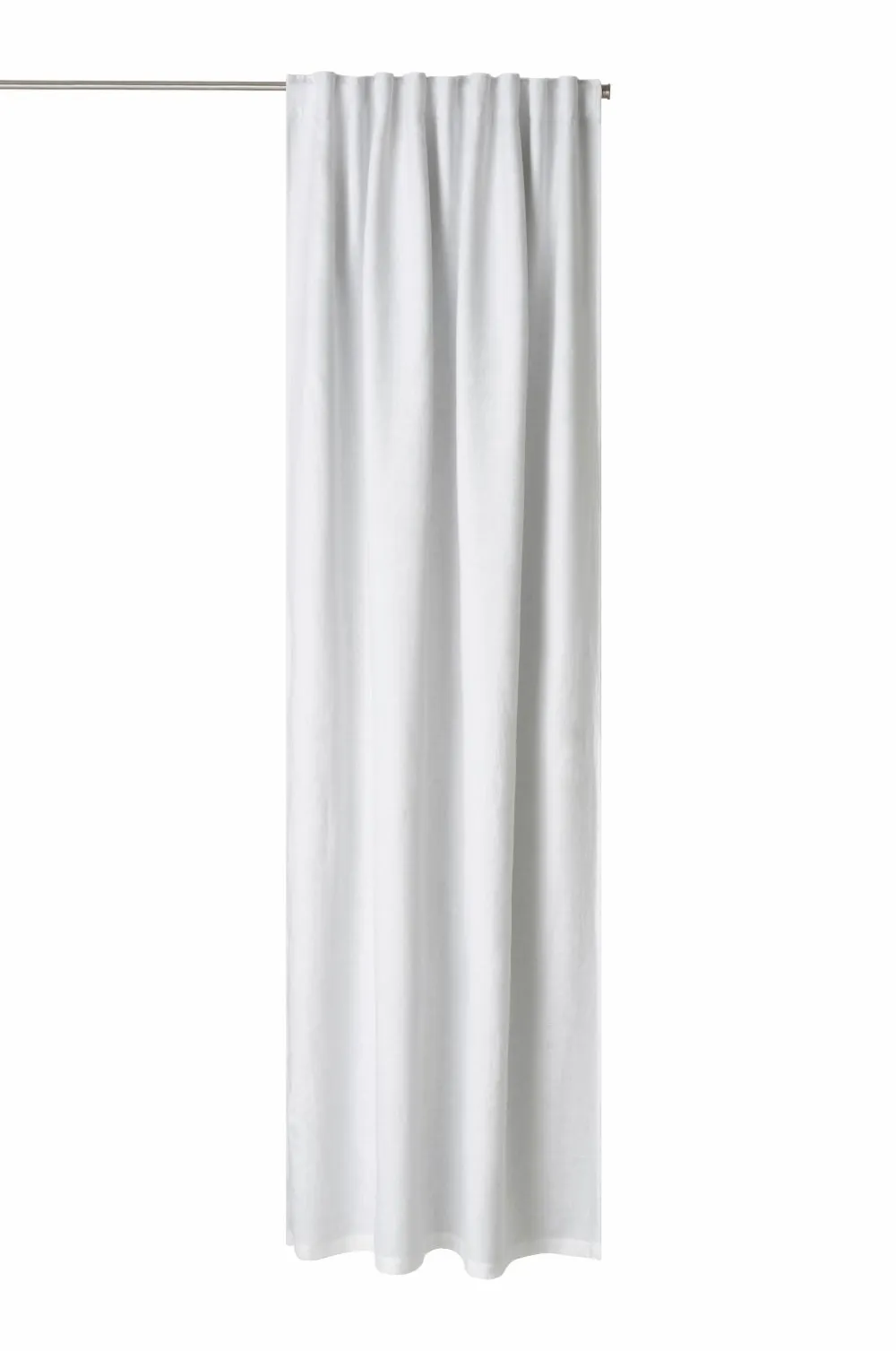 Gardinlængde med rynkebånd i forvasket hørkvalitet. Et vævet mellemlag/for i polyester med indvævede sorte tråde gør, at gardinet lukker lyset ude. Med multibånd som gør, at du enten kan hænge gardinerne direkte på en gardinstang eller anvende ringe og nålekroge eller fingerkroge. Snoren i rynkebåndet gør, at du let kan skabe ensartede, flotte læg. Matchende farve tone-i-tone på bagsiden.