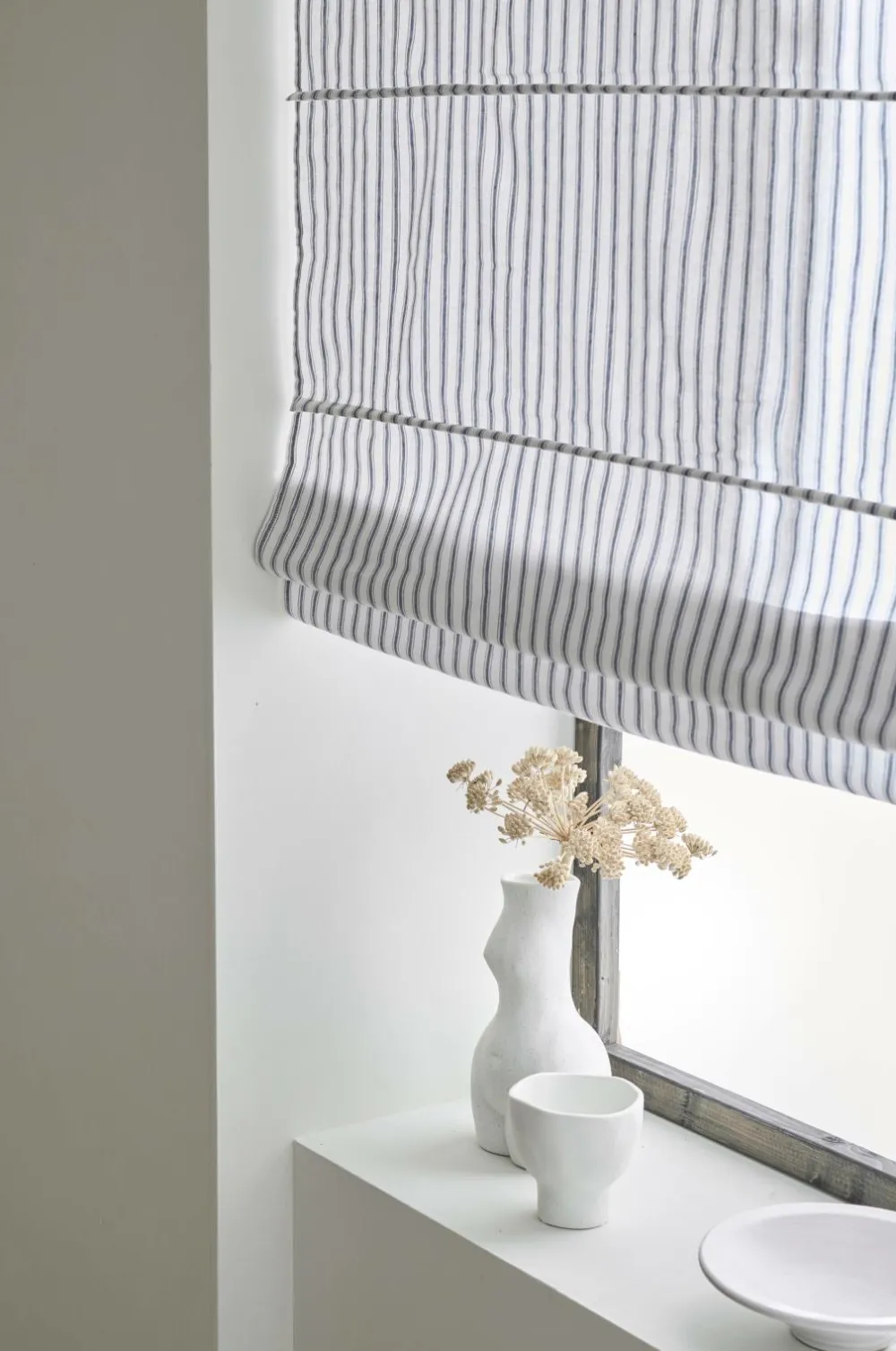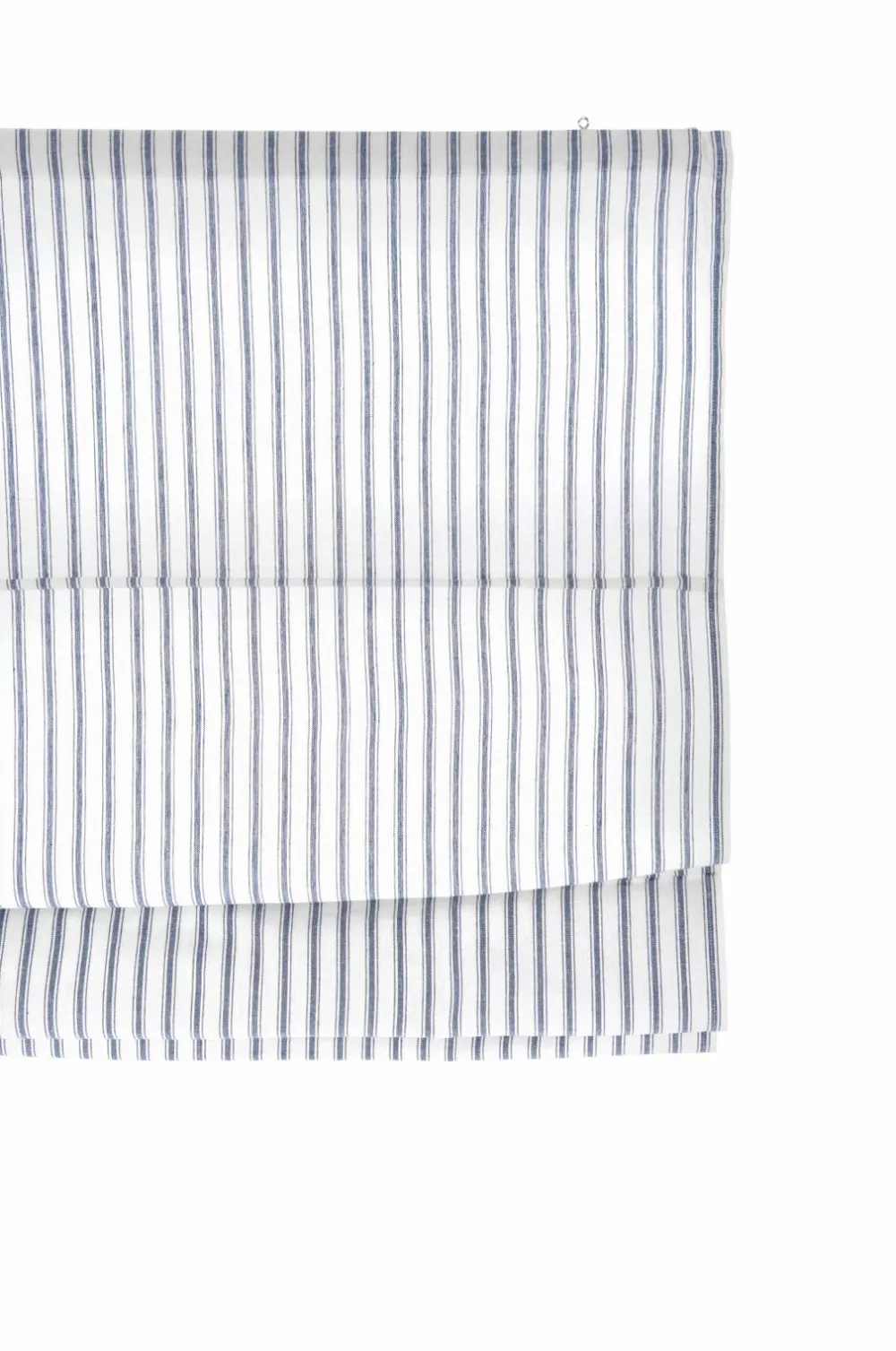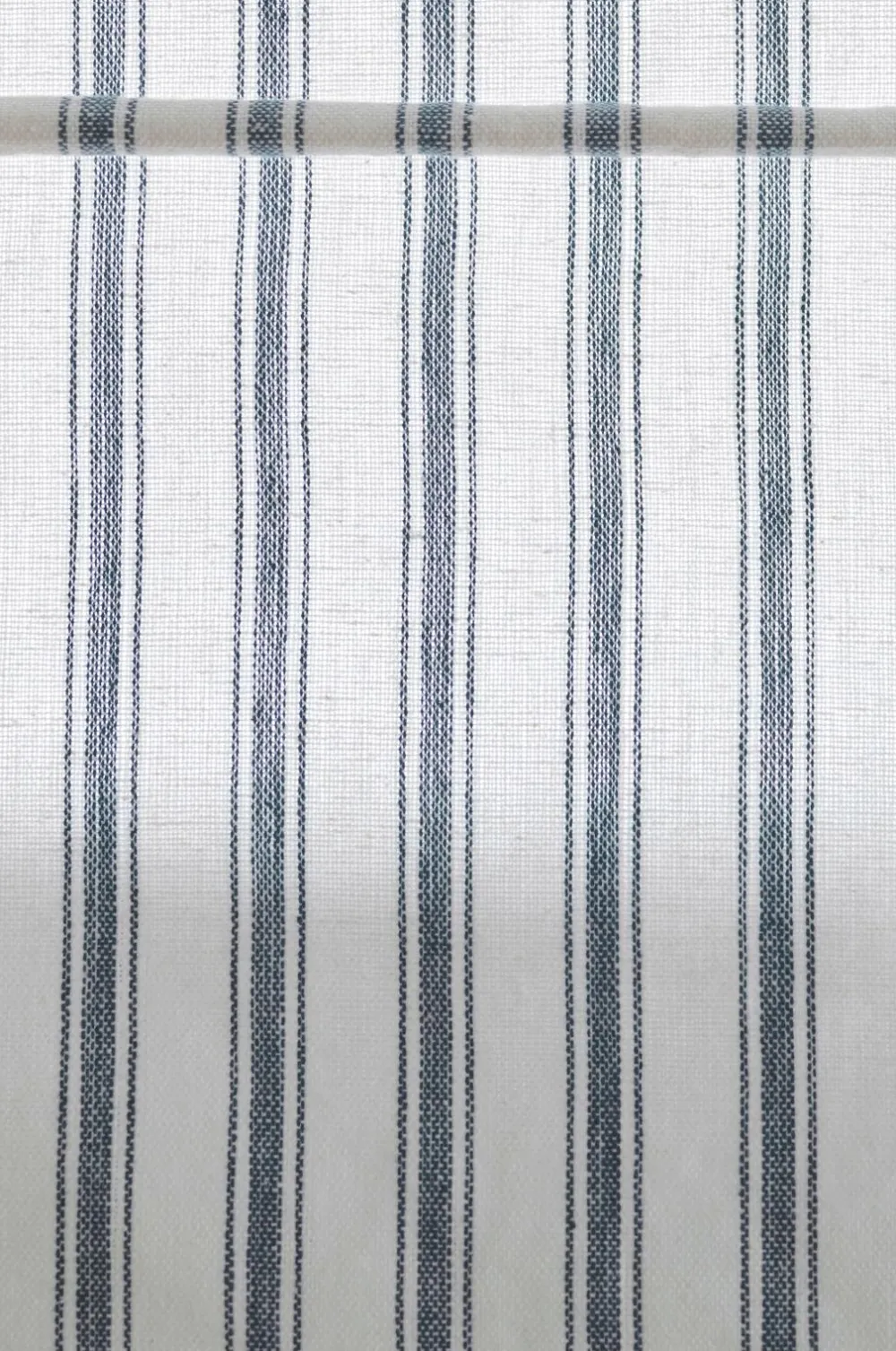 Liftgardin af økologisk bomuld med garnfarvet stribe. Leveres samlet. Stabil konstruktion med træpinde foroven og liner som løber gennem tværgående pinde. Kroge til ophængning medfølger. Længde 160 cm. Findes i flere forskellige bredde.