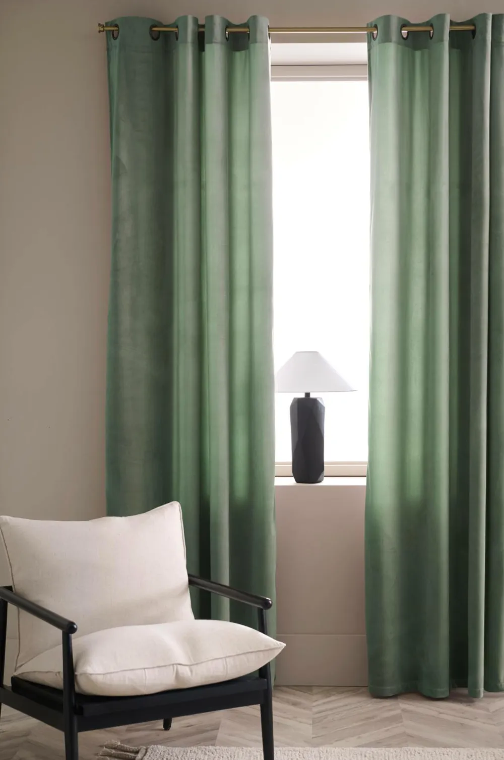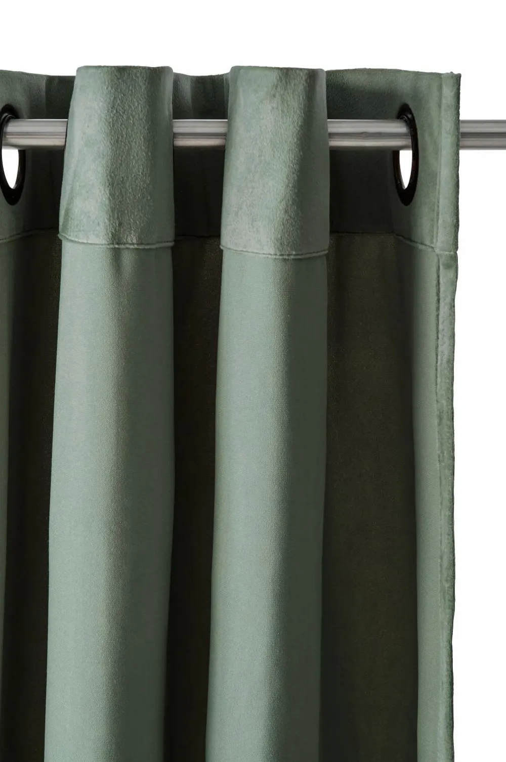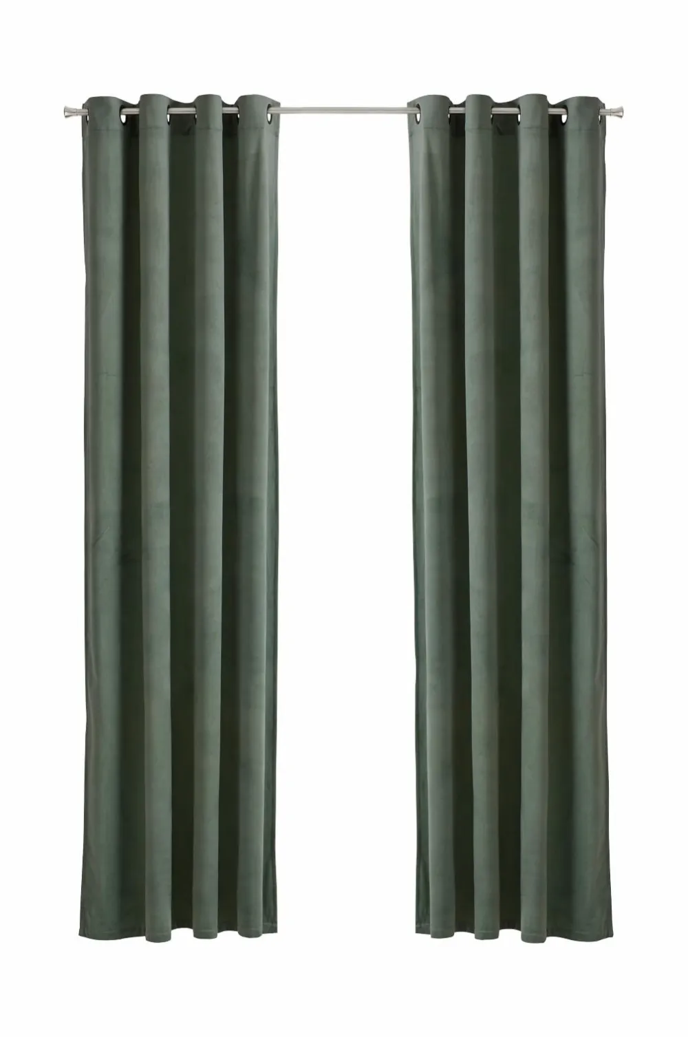 Velourgardiner med fin glans og blødt fald. Sejlringe i antikmessingfarvet metal. Bredde 140 cm. To længder: 220 og 250 cm.