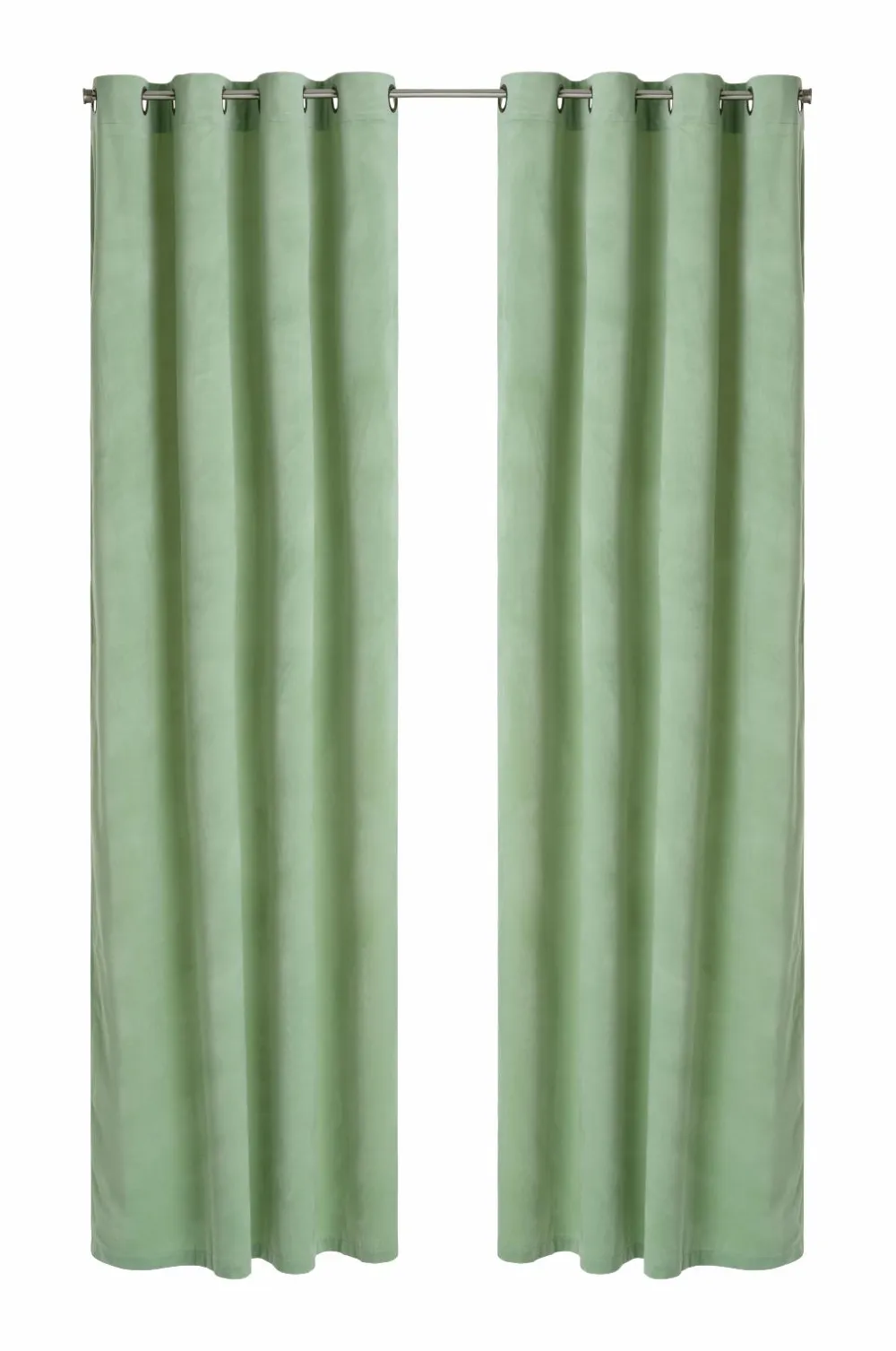 Velourgardiner med fin glans og blødt fald. Sejlringe i antikmessingfarvet metal. Bredde 140 cm. To længder: 220 og 250 cm.