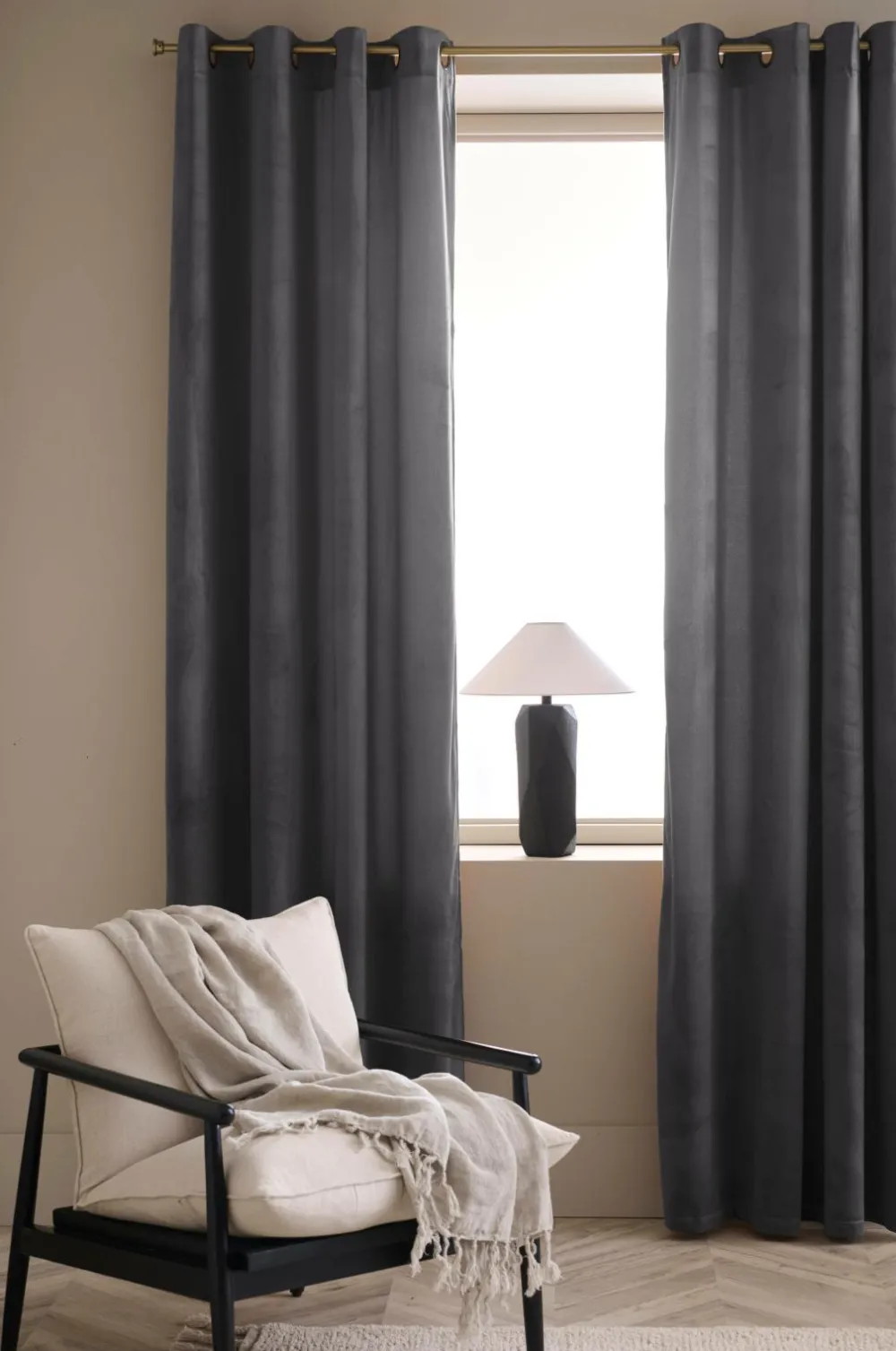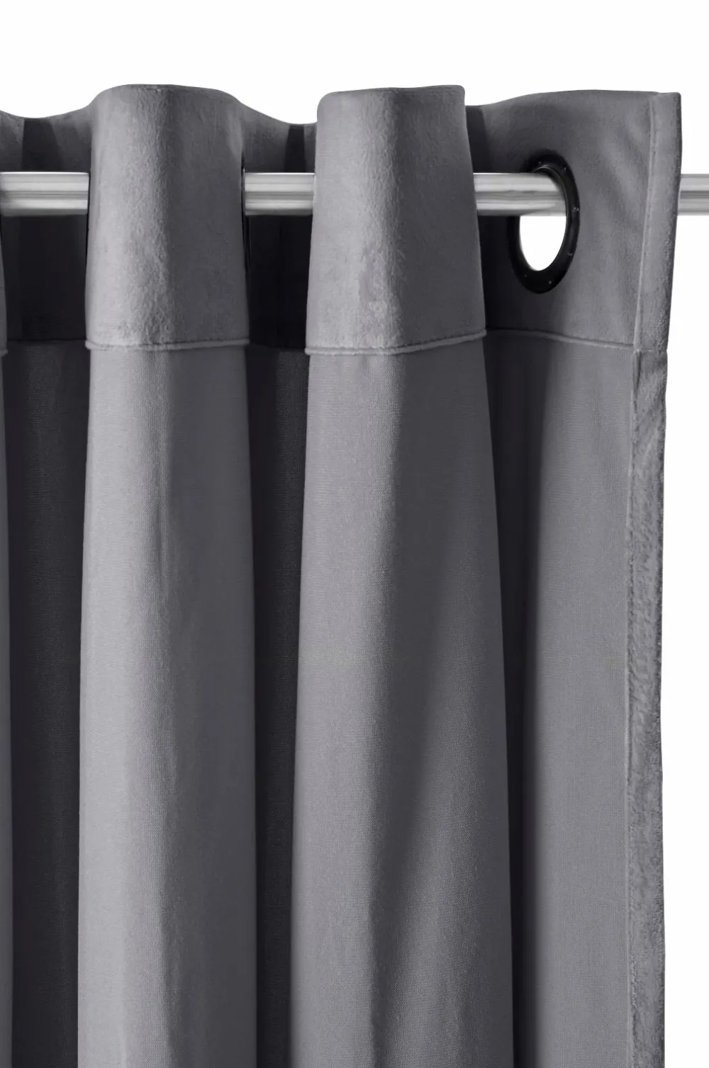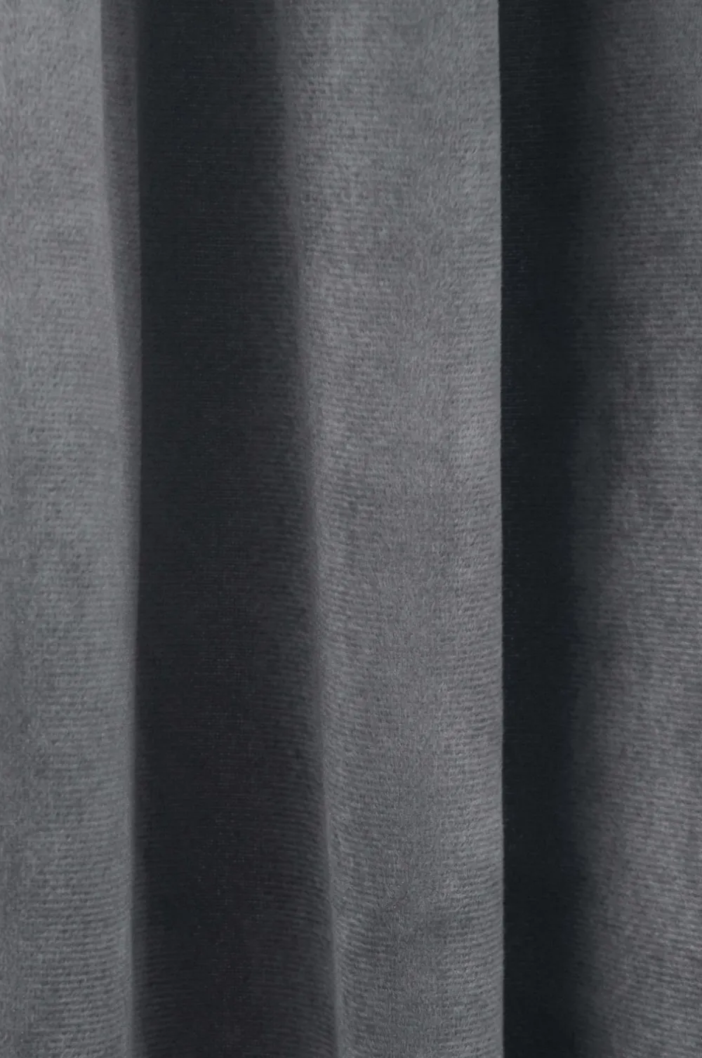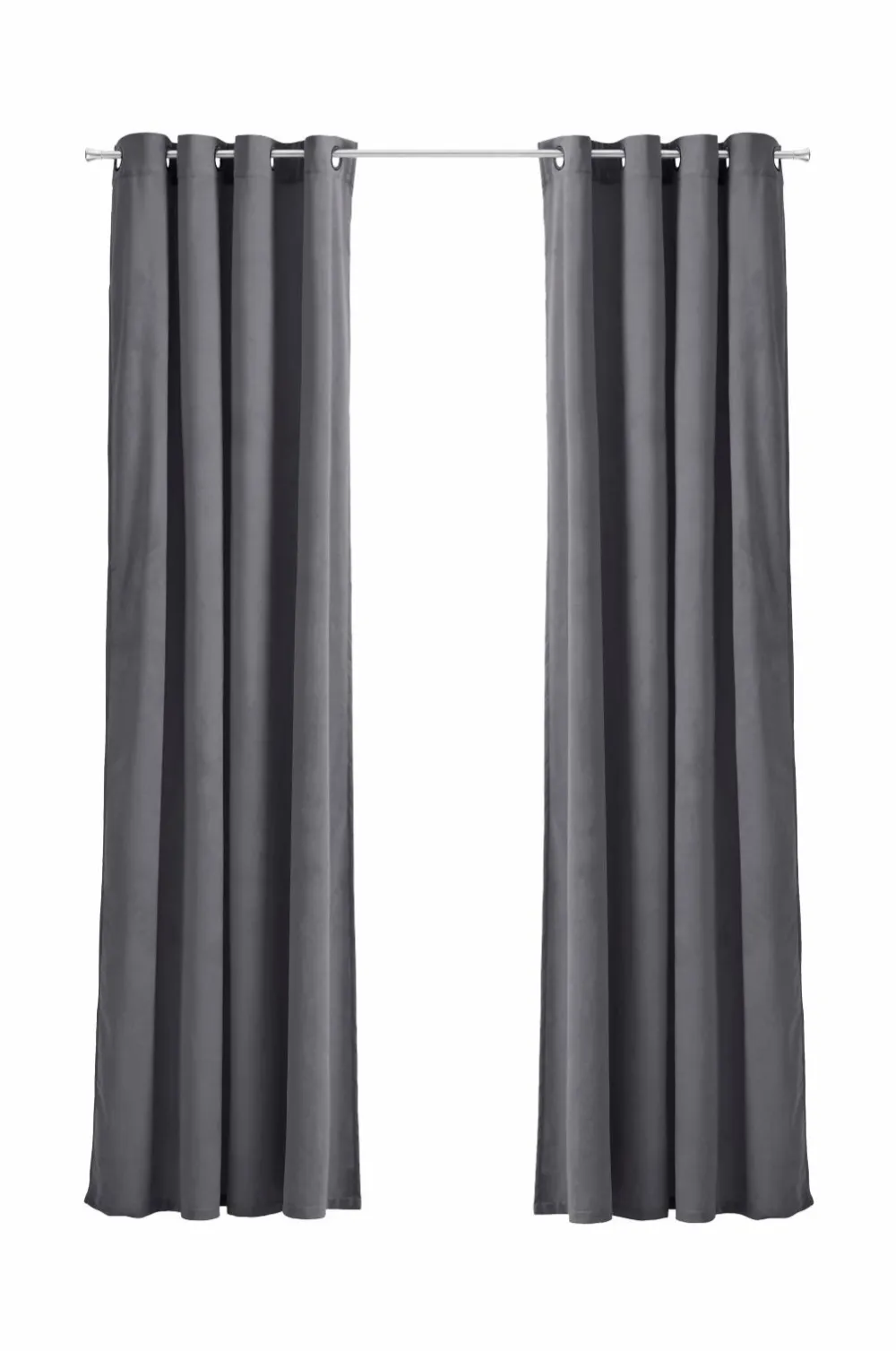Velourgardiner med fin glans og blødt fald. Sejlringe i antikmessingfarvet metal. Bredde 140 cm. To længder: 220 og 250 cm.