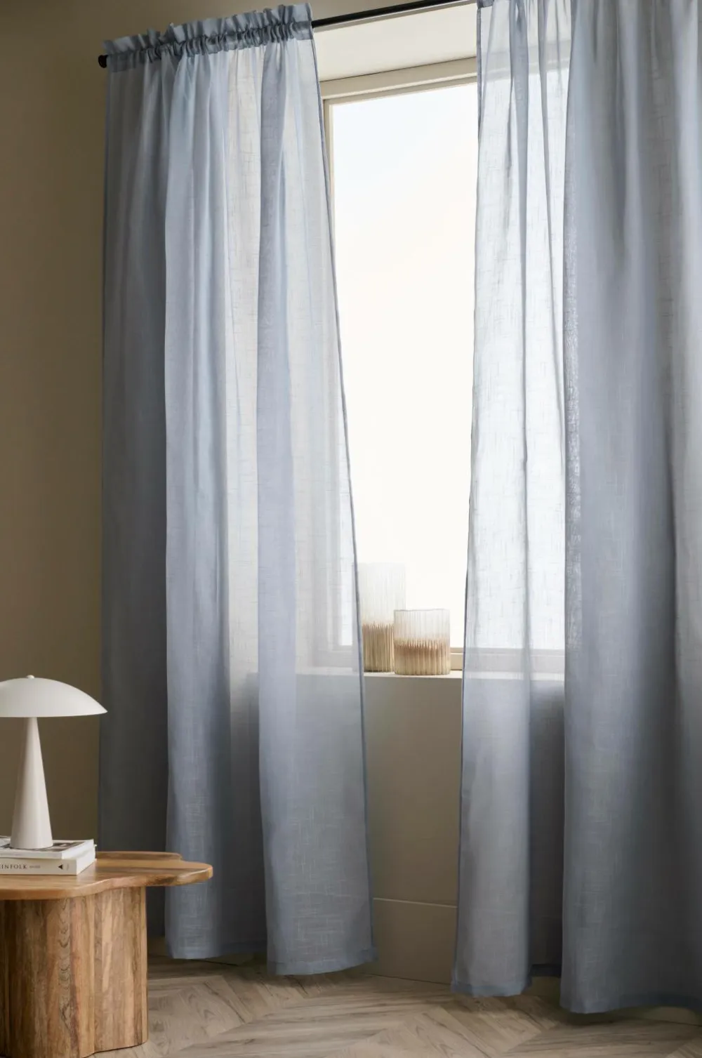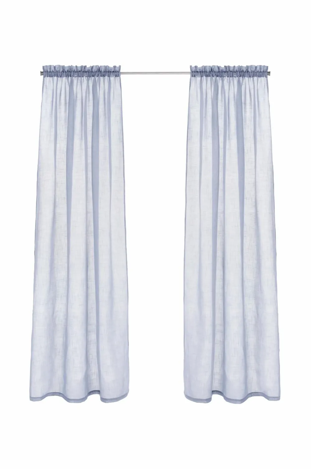 To gardinlængder med løbegang af luftig polyester med struktur i hørlook. 5 cm rynkekant. Bredde 134 cm. To længder: 220 og 250 cm.