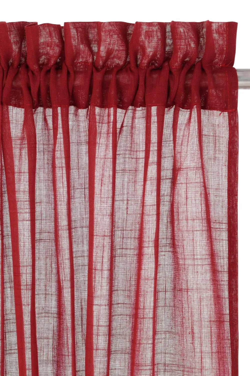 To gardinlængder med løbegang af luftig polyester med struktur i hørlook. 5 cm rynkekant. Bredde 134 cm. To længder: 220 og 250 cm.