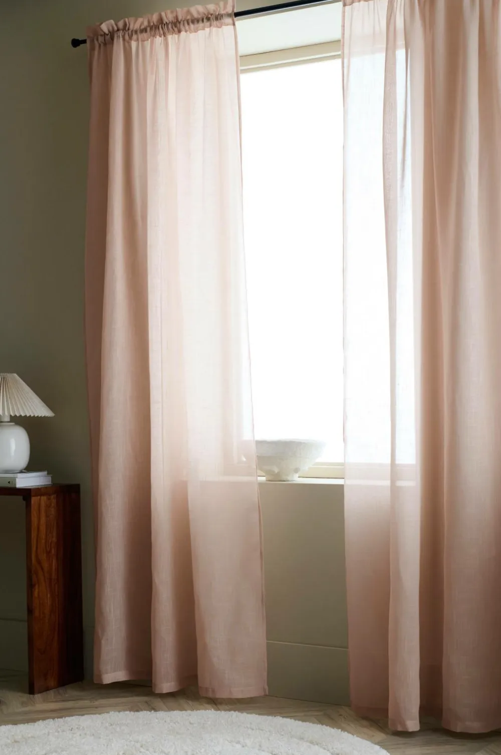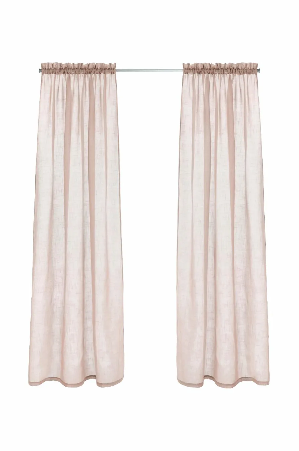 To gardinlængder med løbegang af luftig polyester med struktur i hørlook. 5 cm rynkekant. Bredde 134 cm. To længder: 220 og 250 cm.