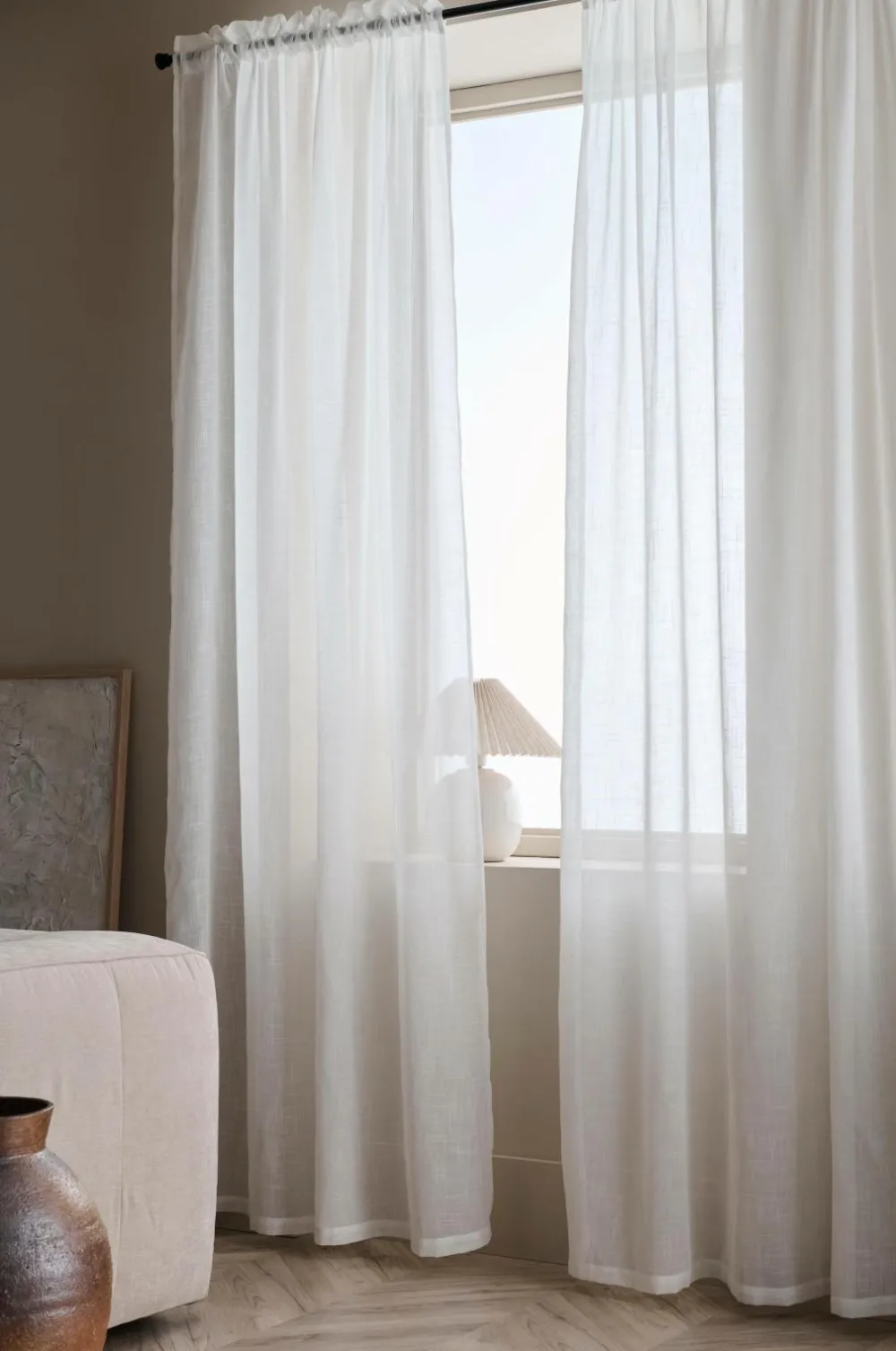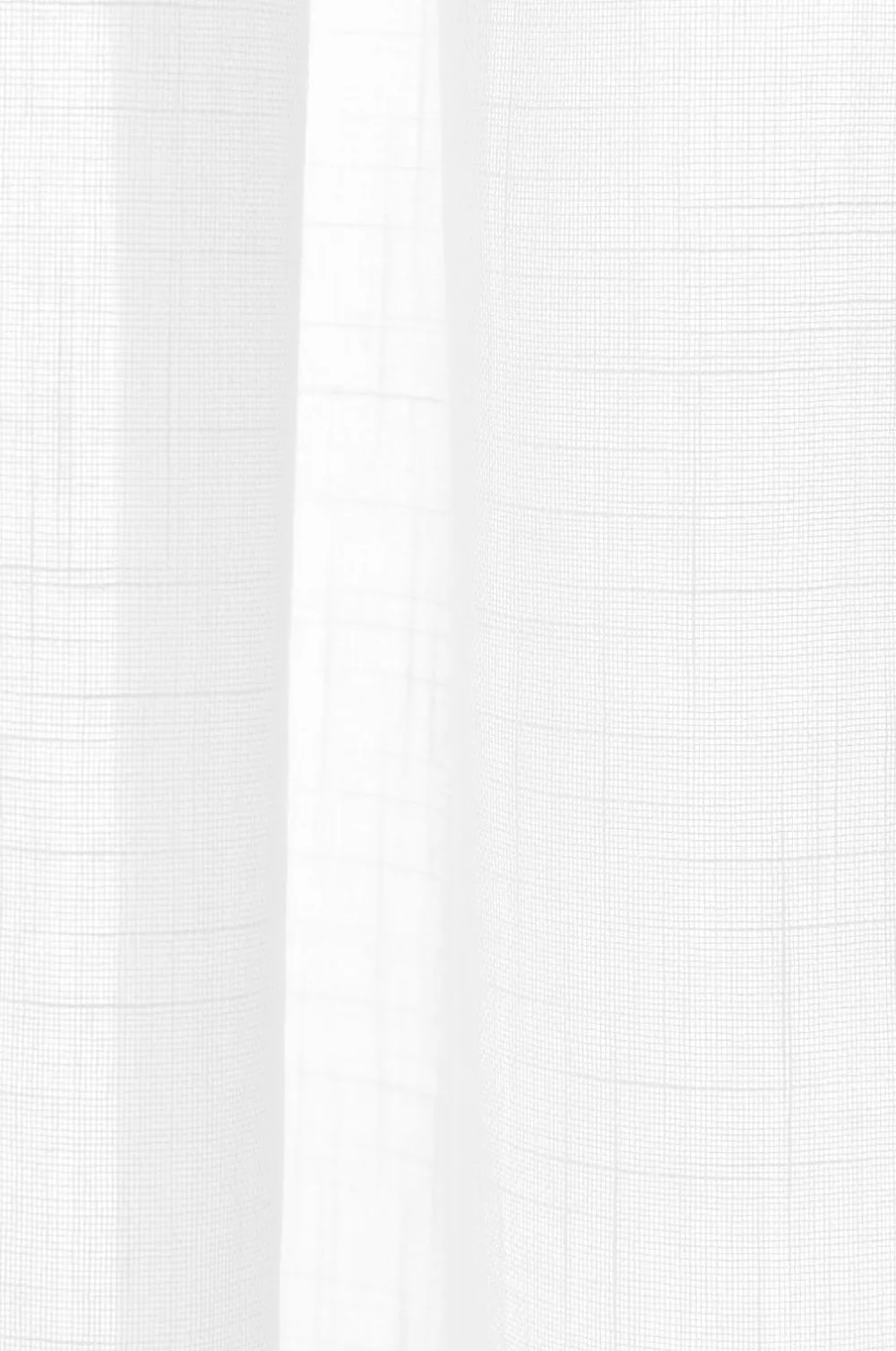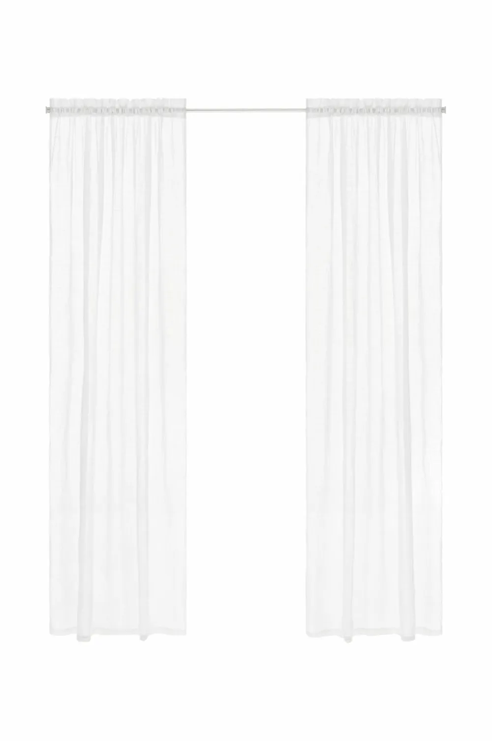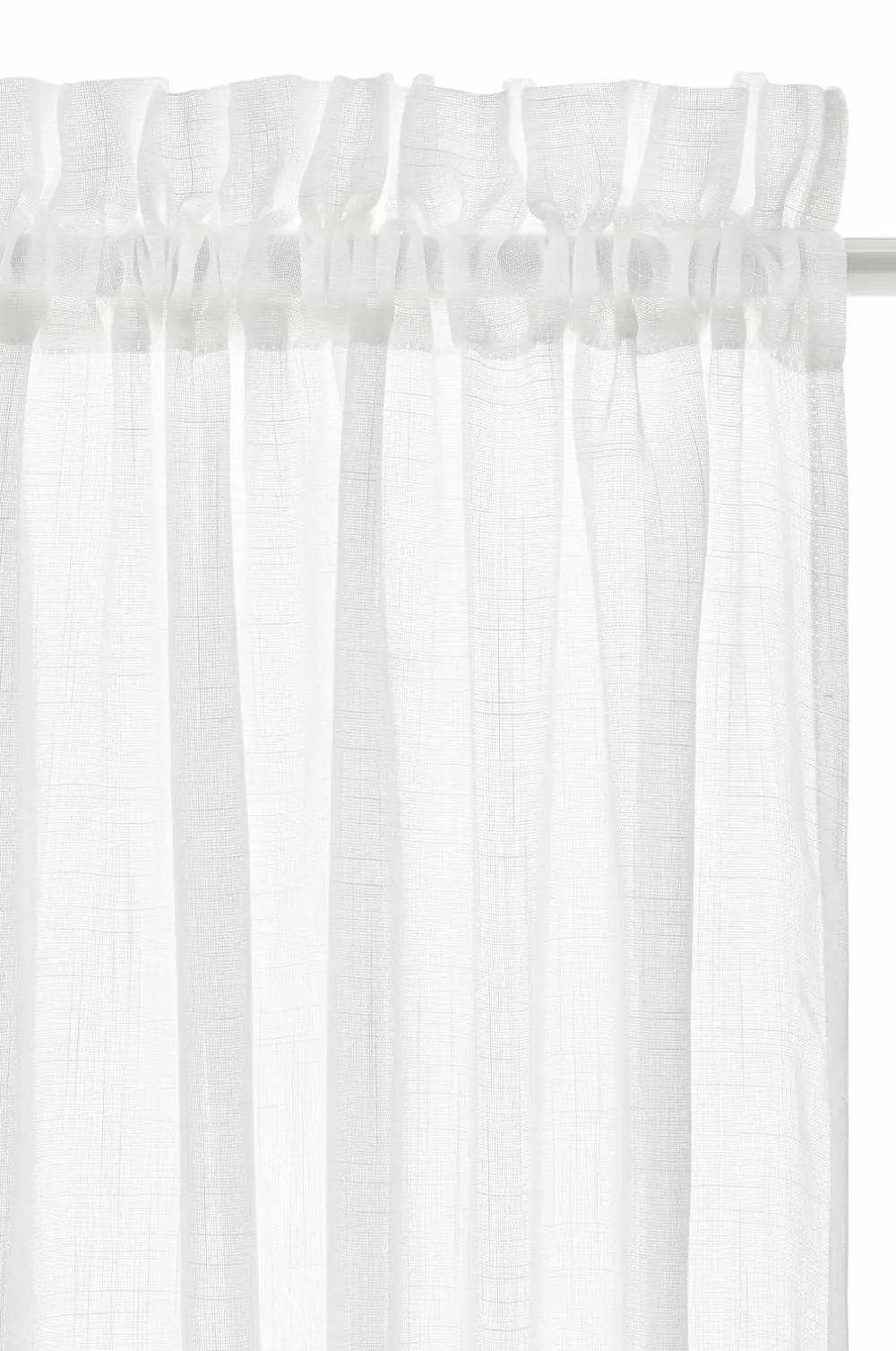 To gardinlængder med løbegang af luftig polyester med struktur i hørlook. 5 cm rynkekant. Bredde 134 cm. To længder: 220 og 250 cm.