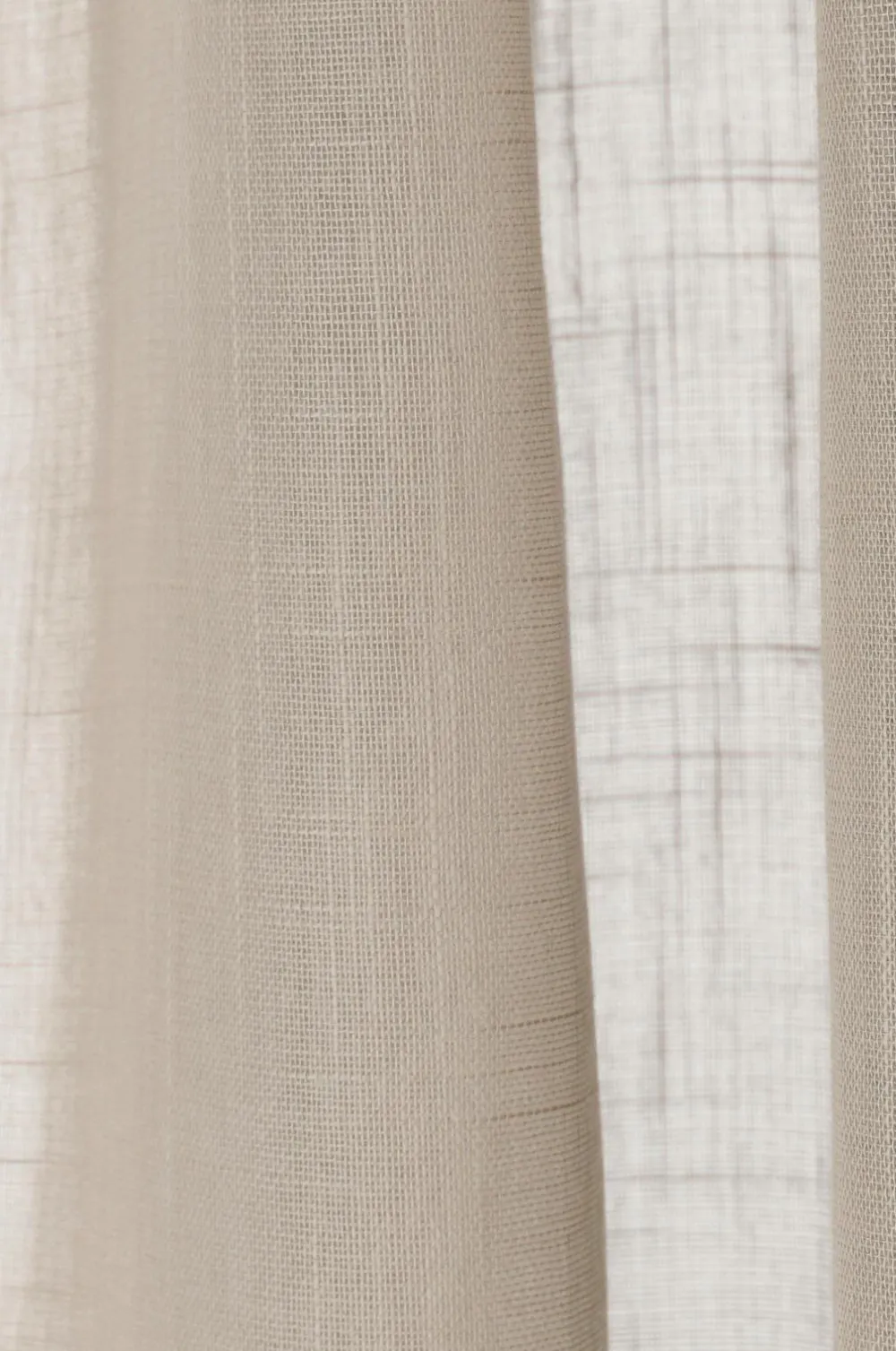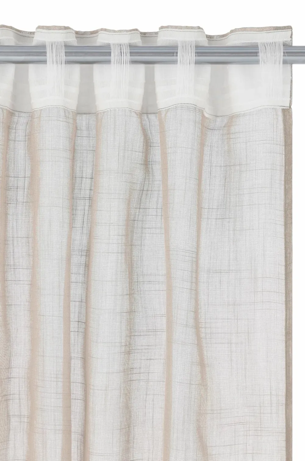To gardiner med multibånd i luftig kvalitet med let struktur i hørlook. Multibåndet gør, at du enten kan hænge gardinerne direkte på en gardinstang gennem de skjulte stropper eller anvende ringe, nålekroge, rynkebåndskroge eller fingerkroge. Snoren i rynkebåndet gør, at du let kan skabe ensartede, flotte læg. Bredde 134 cm. Tre længder: 220, 250 og 300 cm.