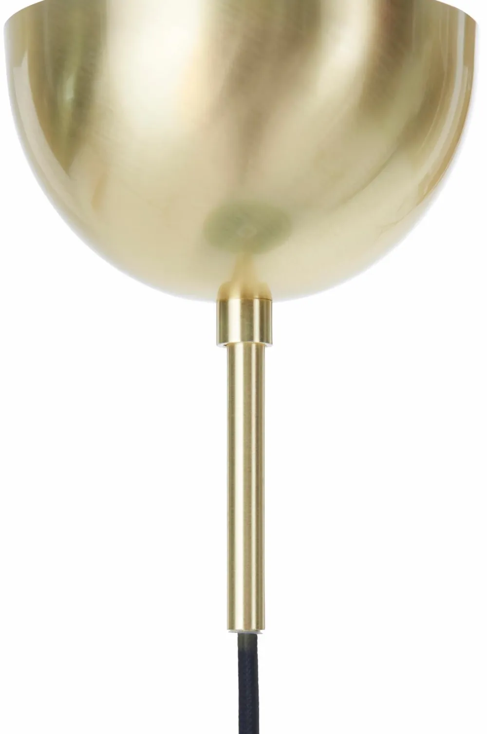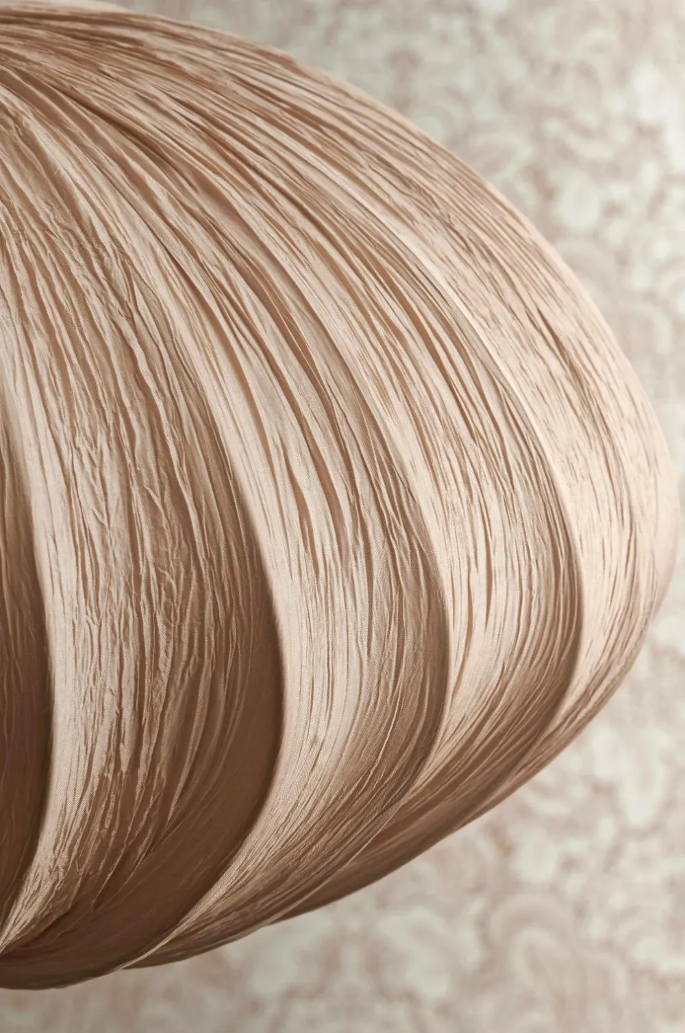 Loftlampe med skelet af metal og betræk af crepet tekstil. Baldakin af metal. Åbning i bund med metalring i antik messingfinish. Skærmens mål: Højde 25 cm, Ø 50 cm. Samlet højde fra loft ca. 130 cm, kan afkortes til ønsket højde. Stofledning, ledningslængde 1,2 m. Krogophæng. Sokkel E27. Pære medfølger ikke.