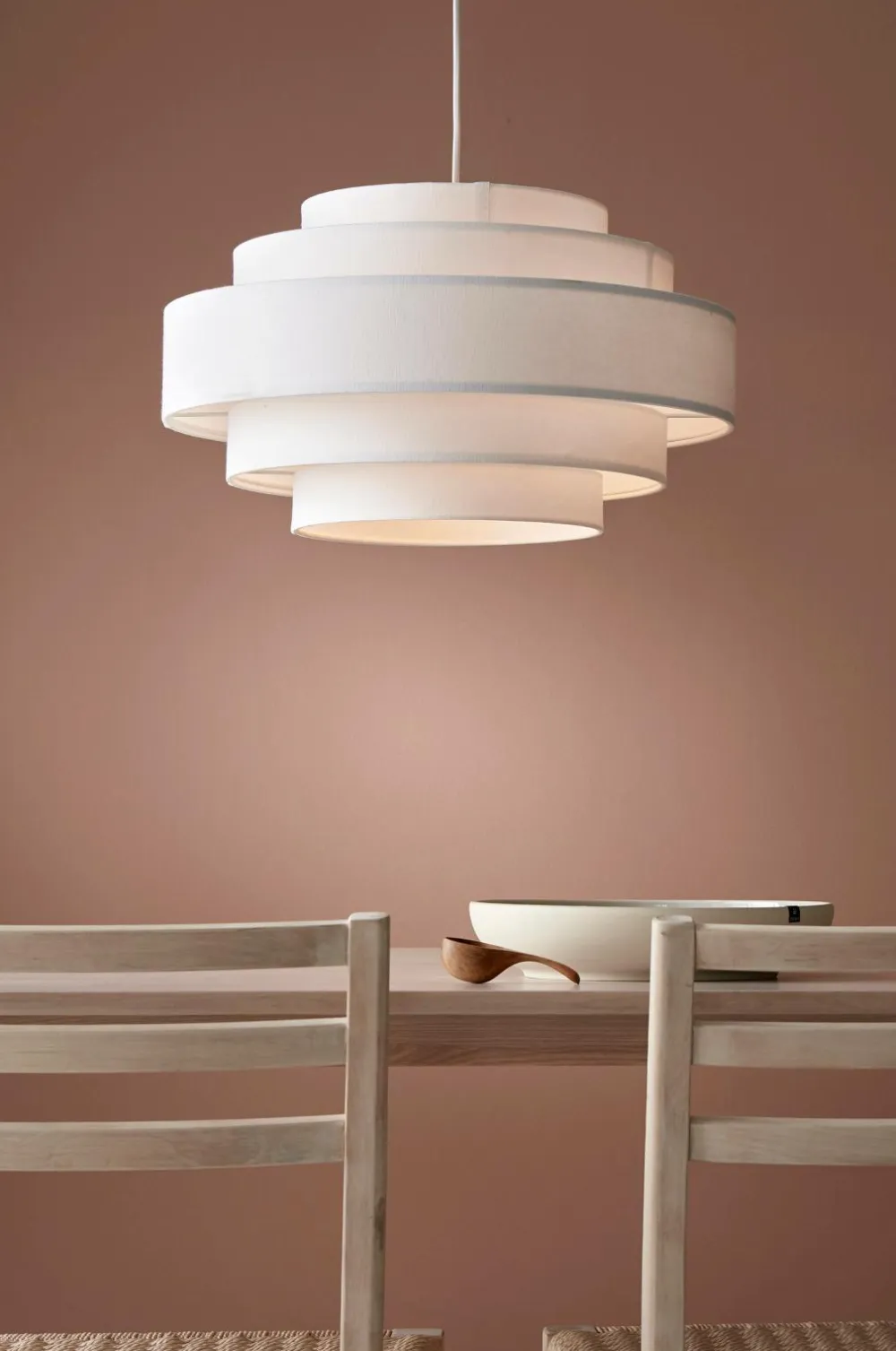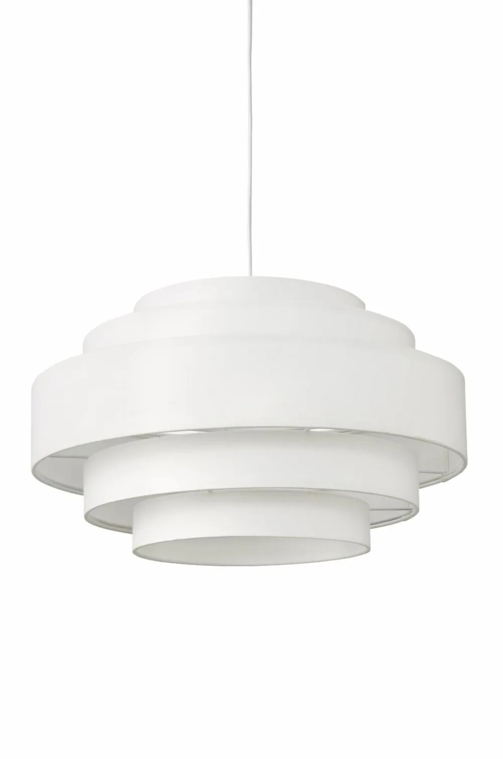 Loftlampe med skærm af bomuldstekstil i flere sektioner og forskellige størrelser. Baldakin af plast med øsken. Mål: Ø 50 cm, Totalhøjde: 150 cm hvoraf lampeskærmens højde er 29 cm. Stofledning, længde 120 cm. Stor sokkel E27. Maks. 5 W. Pære medfølger ikke.
