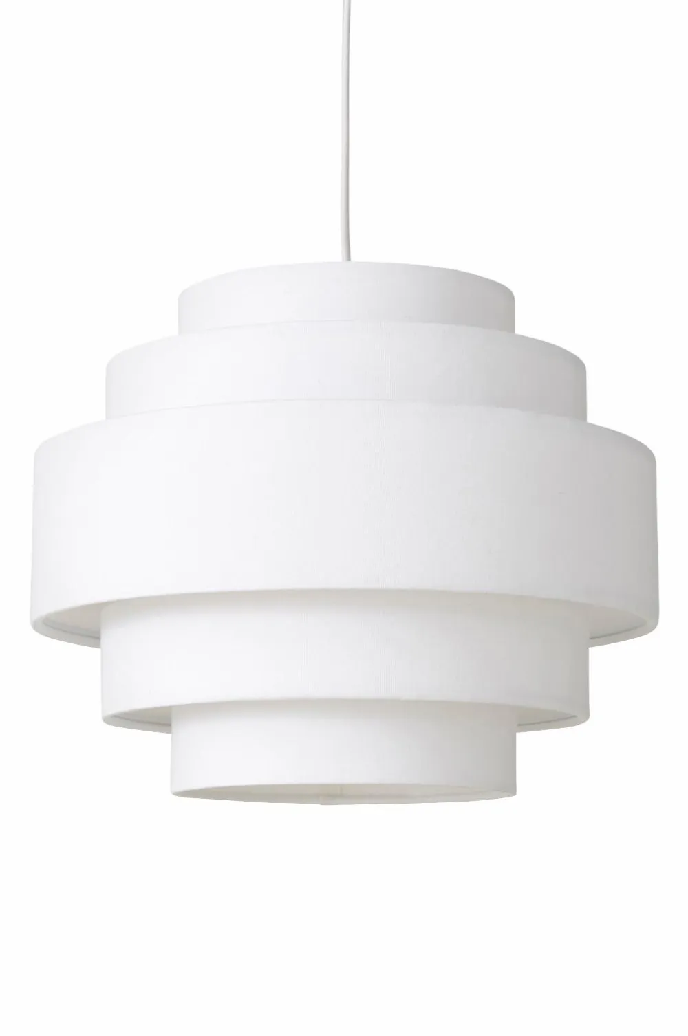 Loftlampe med skærm af tekstil i flere sektioner i forskellige størrelser, Ø ca. 35 cm. Højde 28 cm. Baldakin i plast med krogophæng og direkte kabelinstallation. Ledningslængde 120 cm.