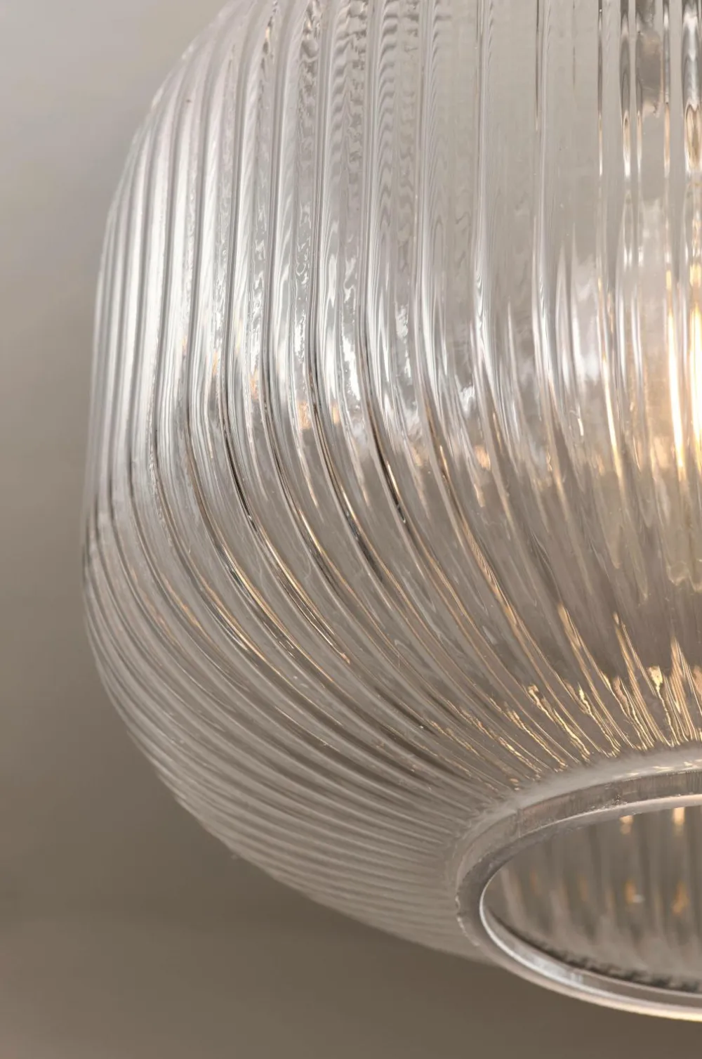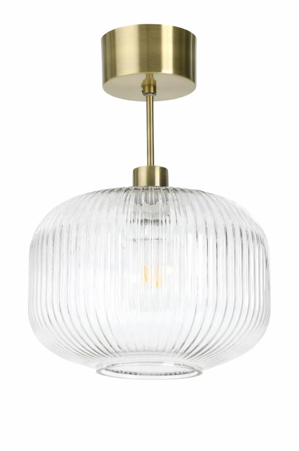 Loftlampe med afrundet glaskuppel med ribstruktur. Loftbeslag og detaljer i metal. Lampens samlede højde inklusive loftophæng ca. 45 cm. Mål på glaskuppel: Diameter 30 cm, højde 23 cm. Baldakin med krogophæng. Stor sokkel E27. Pære maks. 40 W. Pære medfølger ikke.