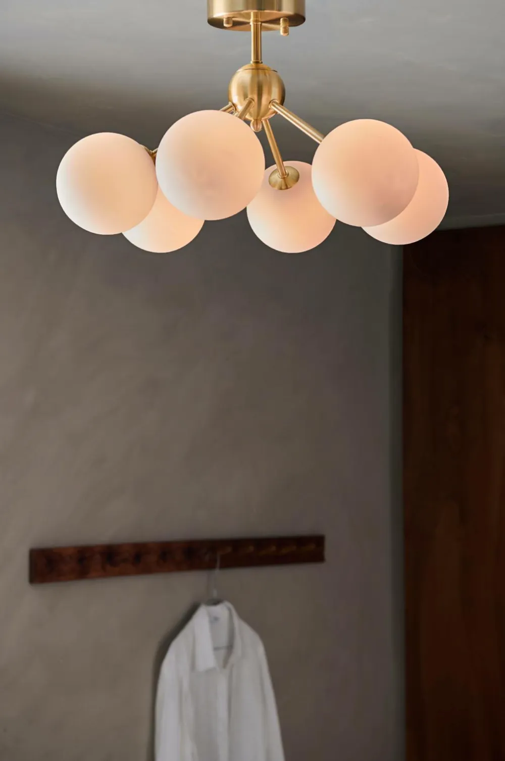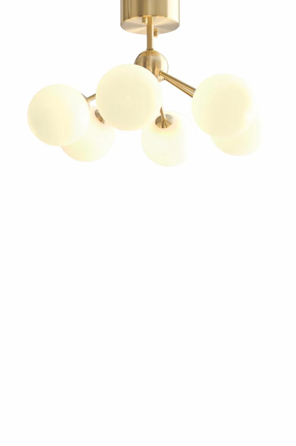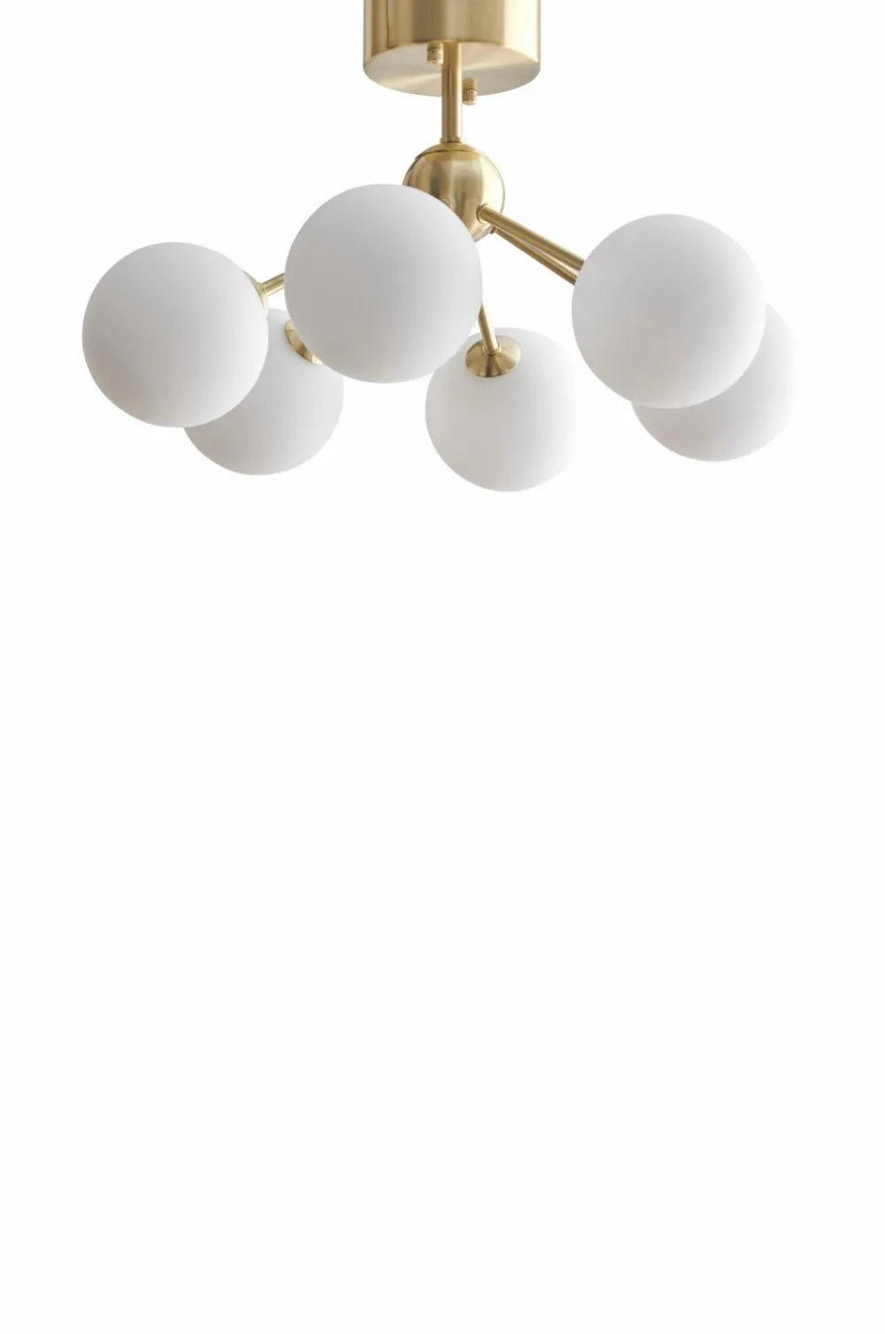 Loftplafond i messingfarvet metal eller pulverlakeret sort metal med 6 opalhvide glaskupler, som fastgøre/løsnes ved at skrue dem. Samlet mål på den monterede lampe: Højde 32 cm, Ø 50 cm. Diameter på glaskuplerne 12 cm. Baldakin af metal. Monteres med bøjleophæng. Sokkel 6xG9 LED maks. 18 W.