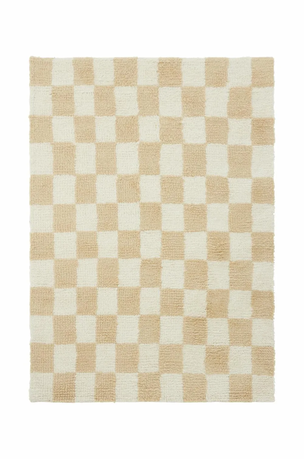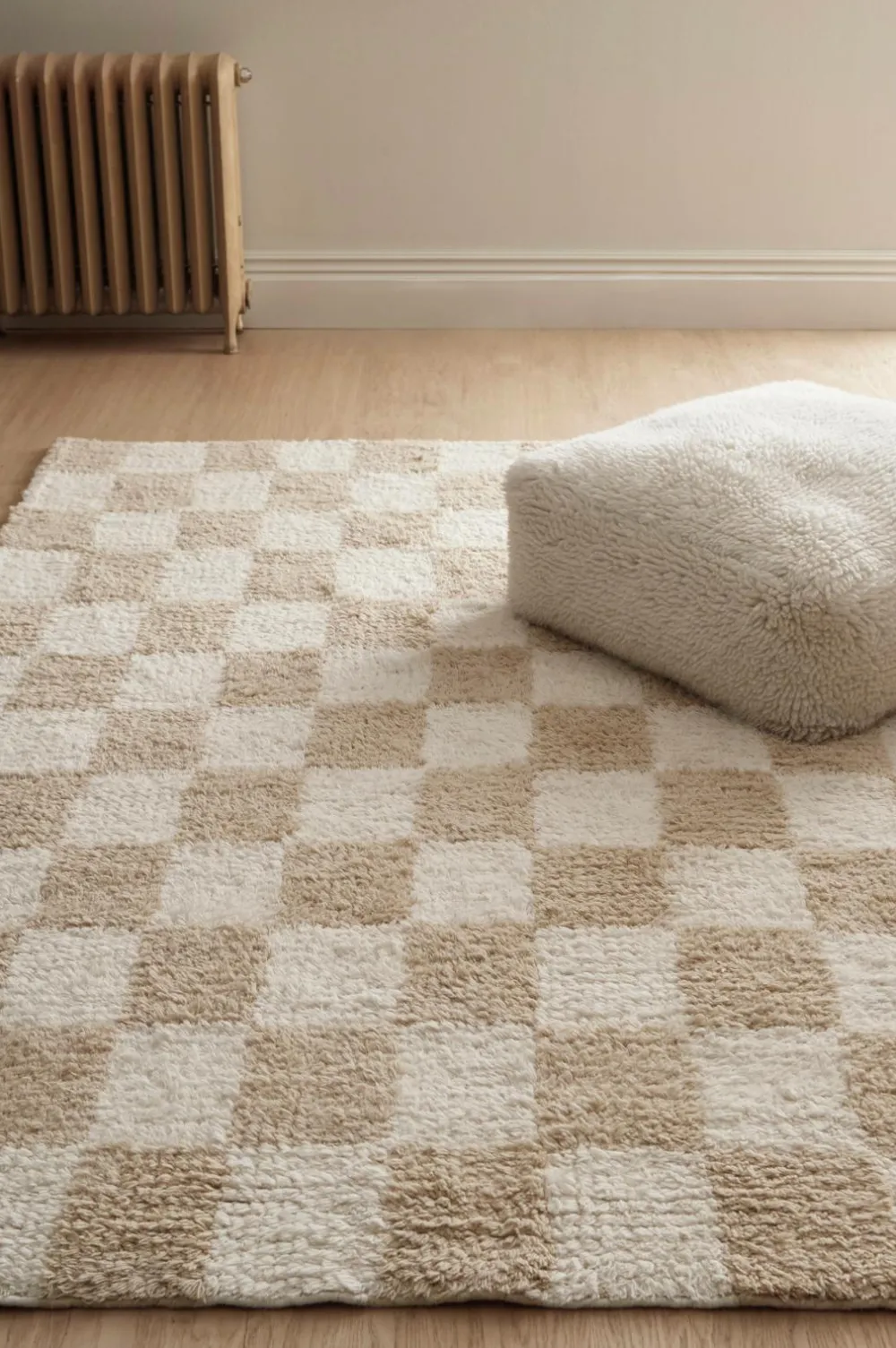 • Håndvævet ryatæppe i uld med kort, blød luv