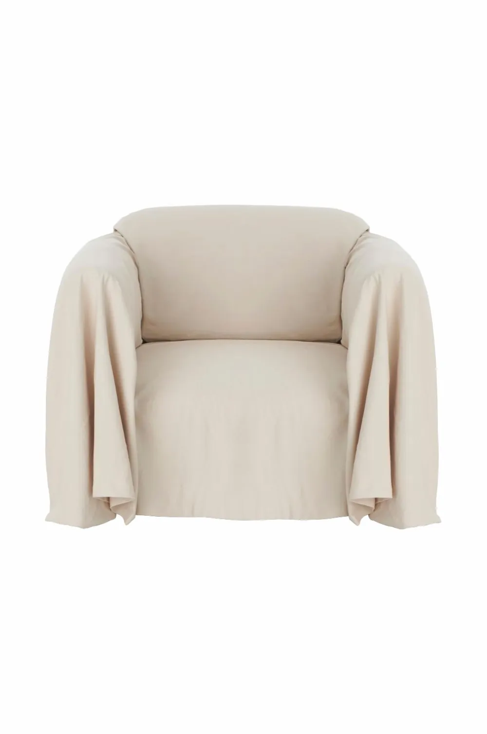 Stofbetræk i kraftig, blødvasket kvalitet. Et helt stykke stof, der draperes over lænestolen. Størrelse 290×260 cm.
