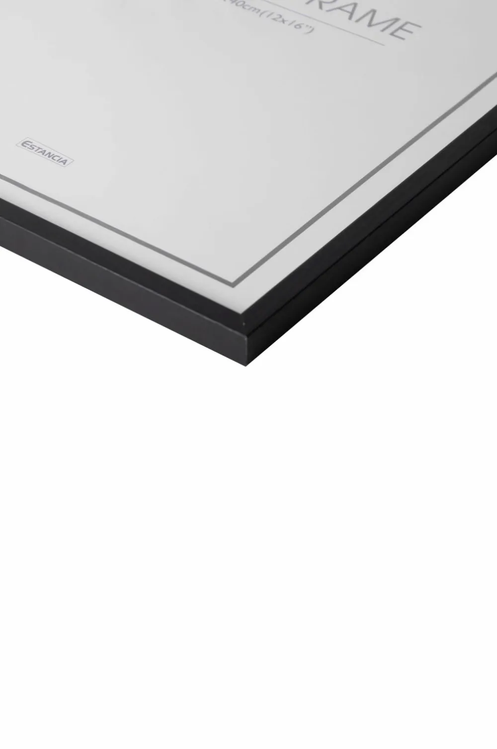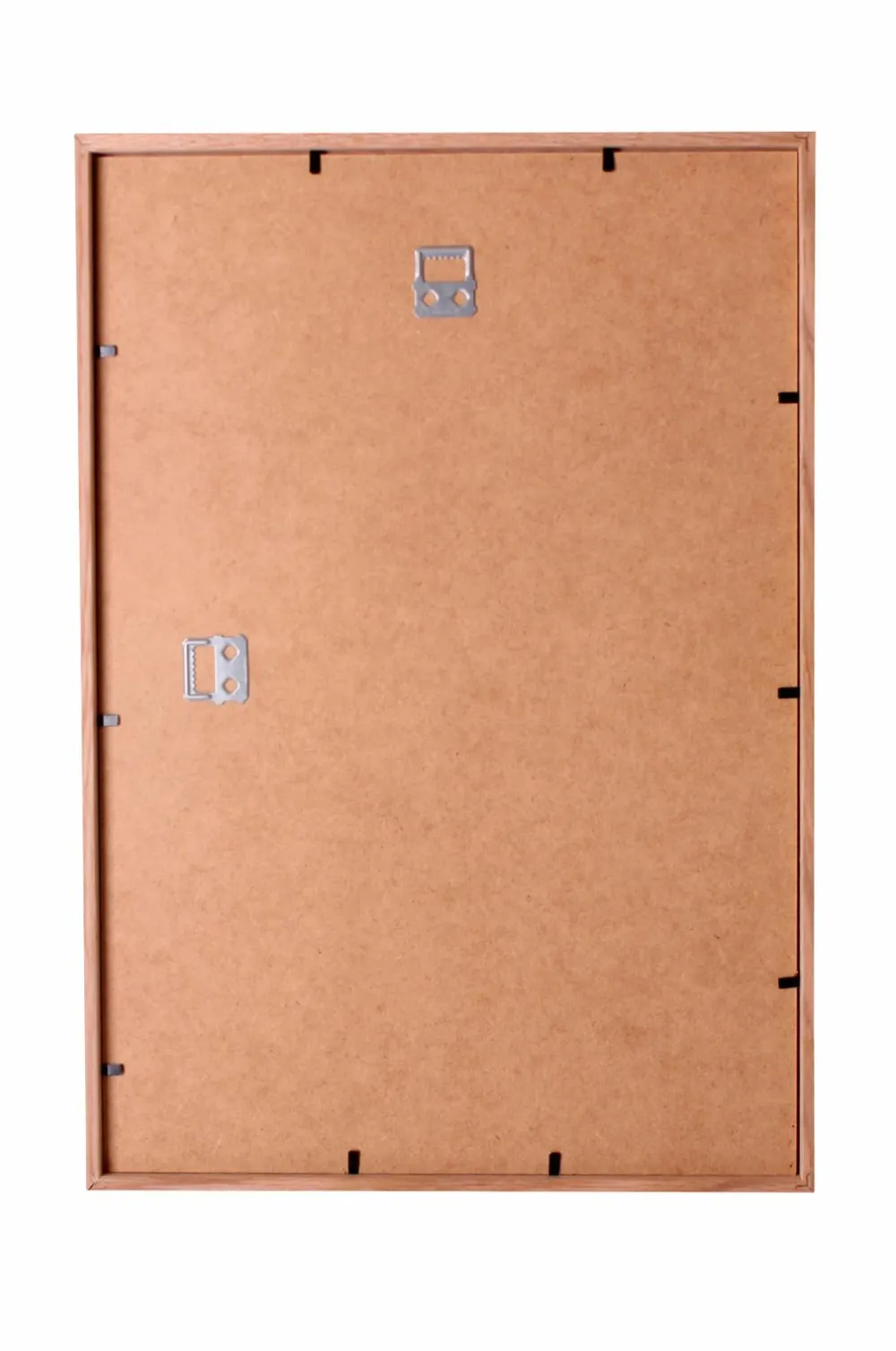 Ramme af træ. Listeprofilen er 12 mm bred og 18 mm dyb i stilrent design som passer til plakater i str. 30×40 cm. Beslagene på bagsiden giver mulighed for både lodret og vandret ophængning. Rammen leveres med brudsikkert krystalklart plexiglas hvilket giver rammen en lav vægt.