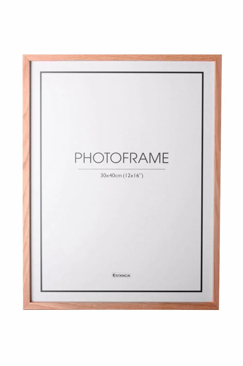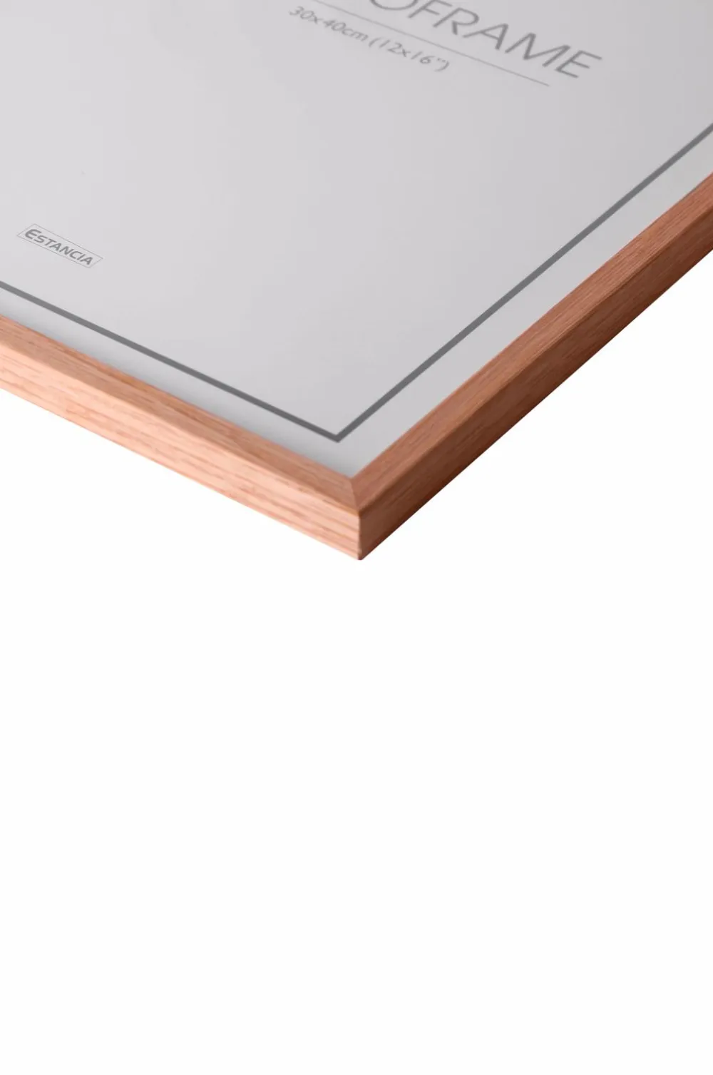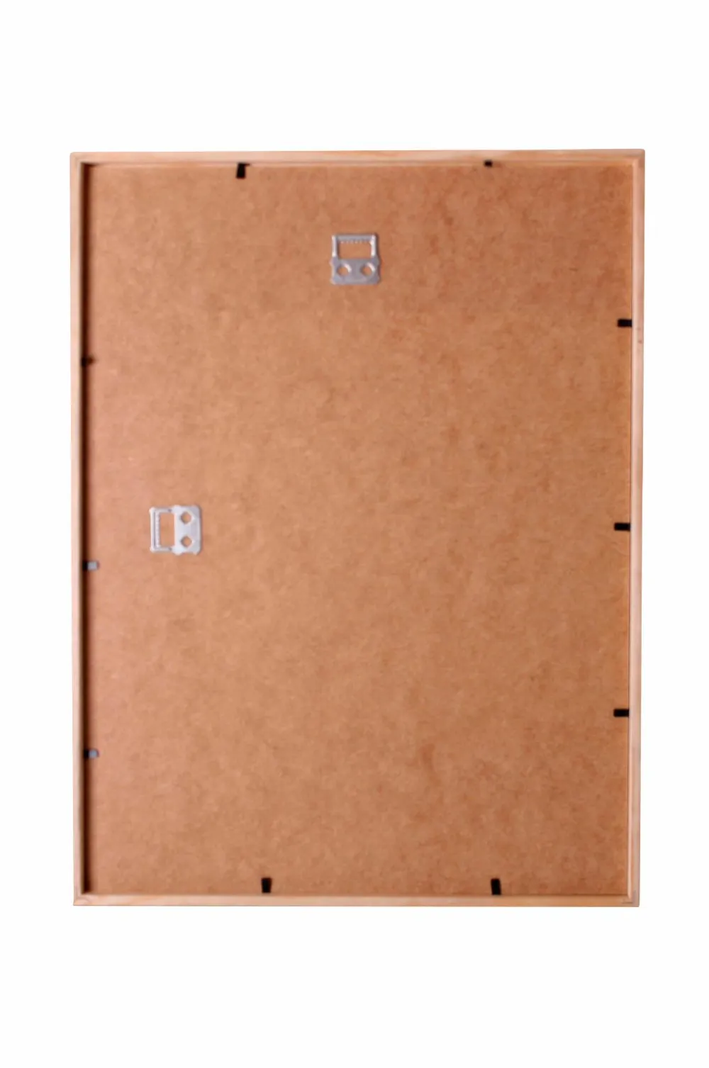 Ramme af træ. Listeprofilen er 12 mm bred og 18 mm dyb i stilrent design som passer til plakater i str. 30×40 cm. Beslagene på bagsiden giver mulighed for både lodret og vandret ophængning. Rammen leveres med brudsikkert krystalklart plexiglas hvilket giver rammen en lav vægt.