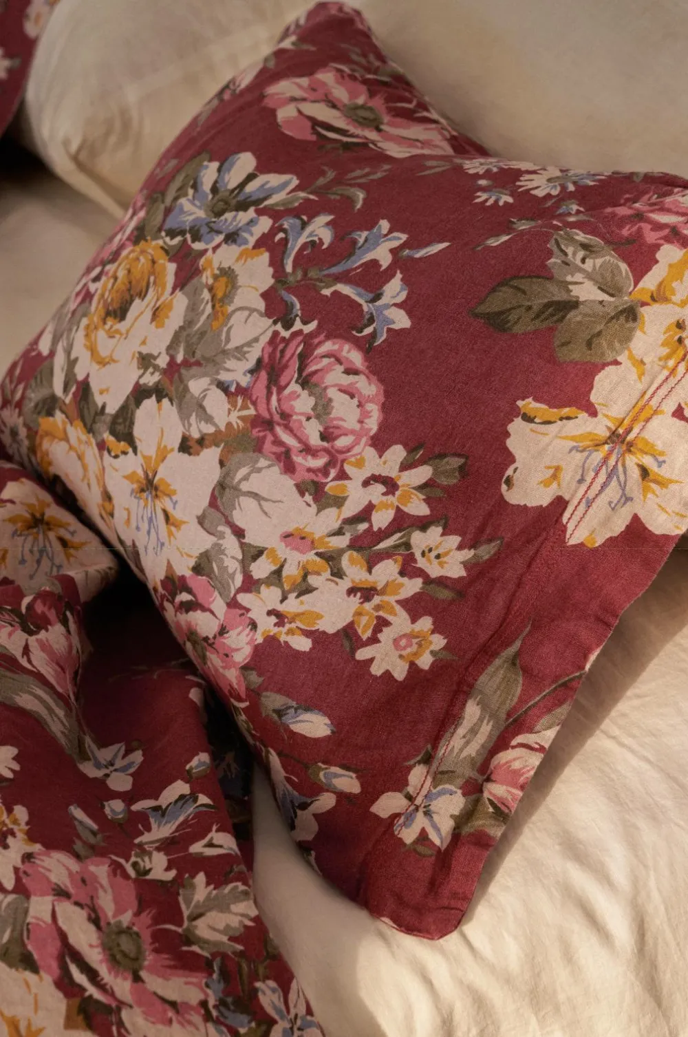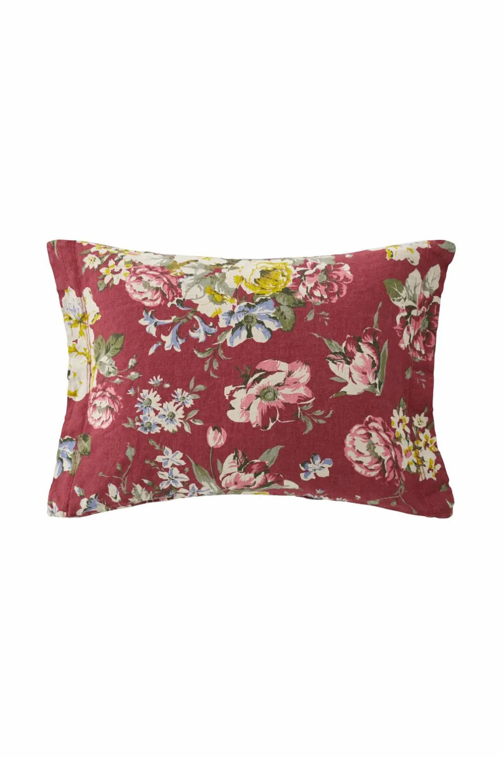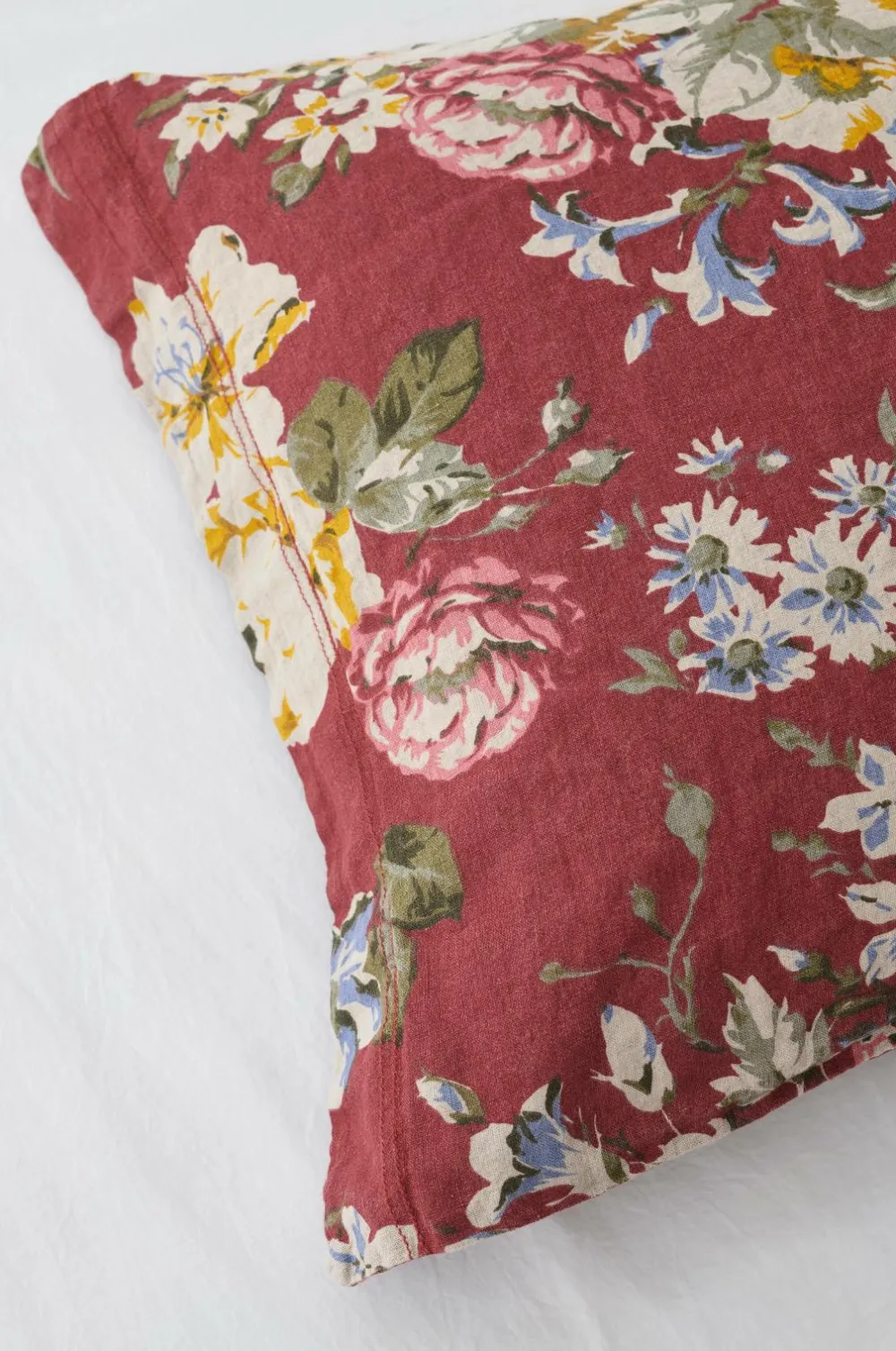 Pudebetræk i vintagevasket hørkvalitet af fransk hør med printet rosemønster på synlig lærredsbund. Str. 50×60 cm + 5 cm vinge på kortsiderne.