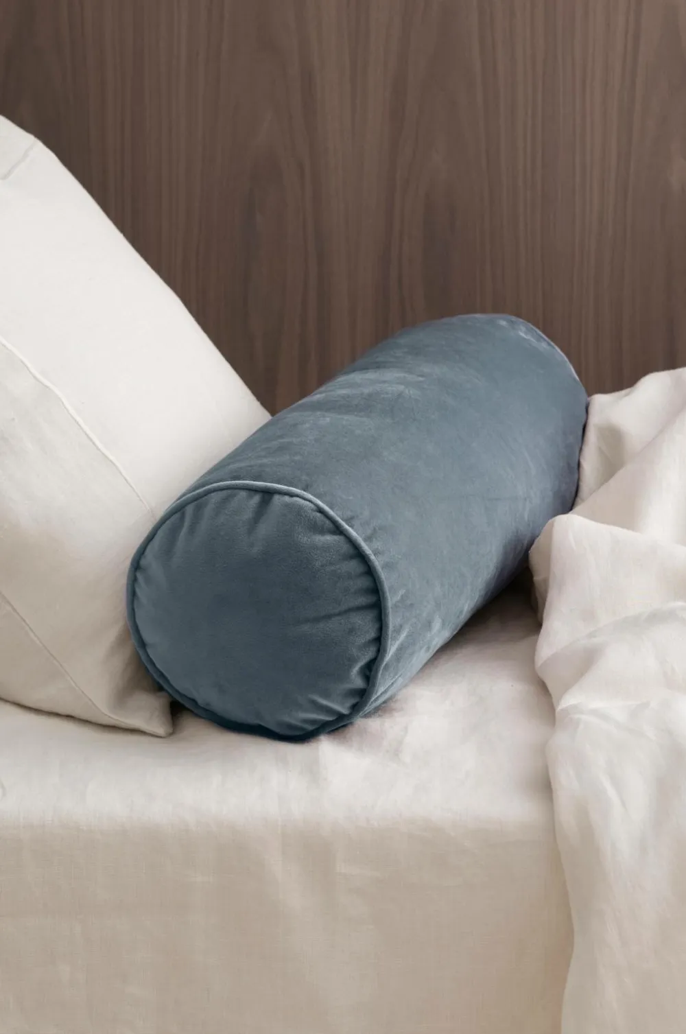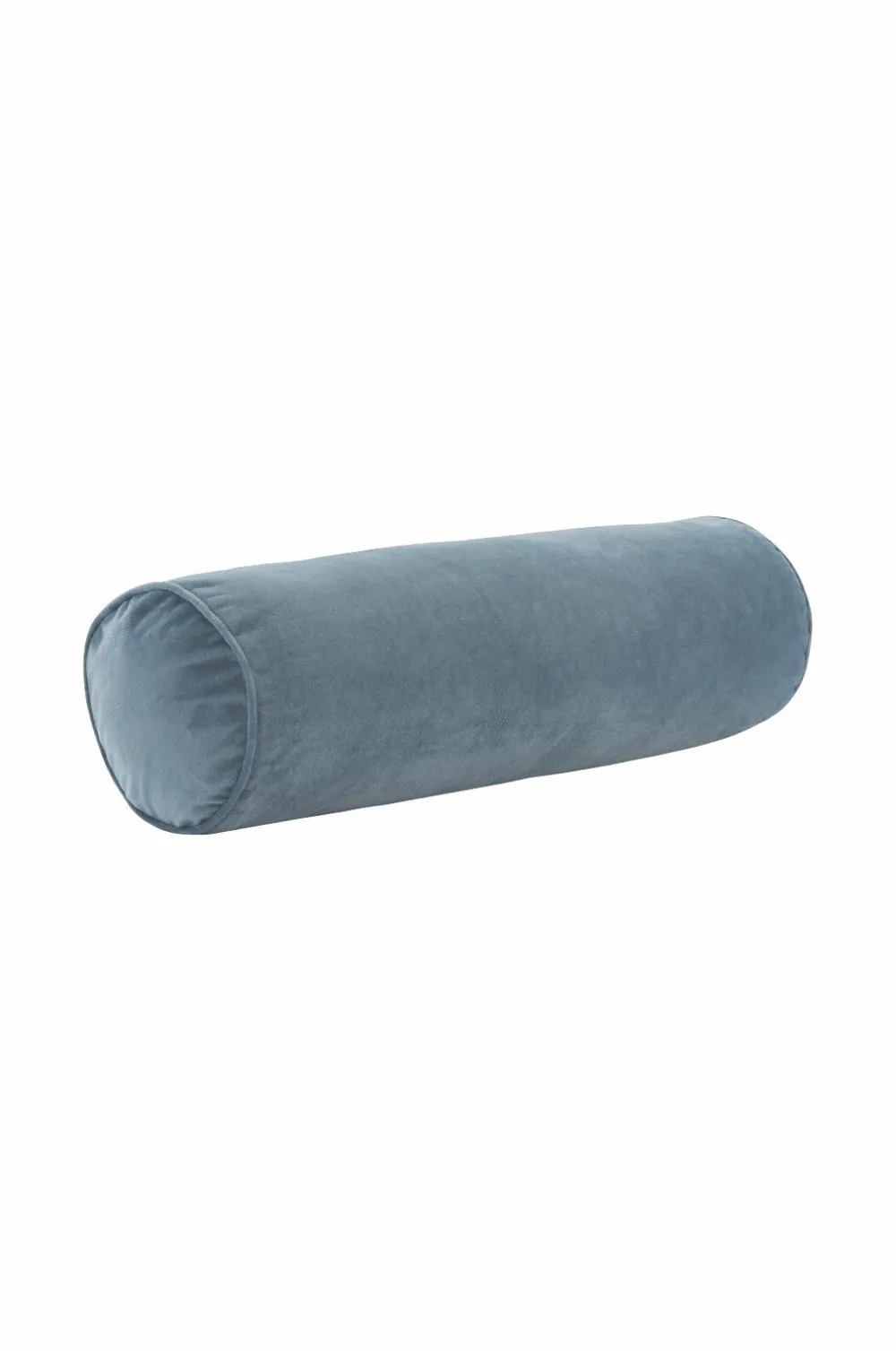 Cylinderformet pude i velour med monteringspude i polyester. Paspoleret kant i enderne. Af genindvundet polyester. Lynlås på undersiden. Bredde 55 cm, diameter 18 cm.