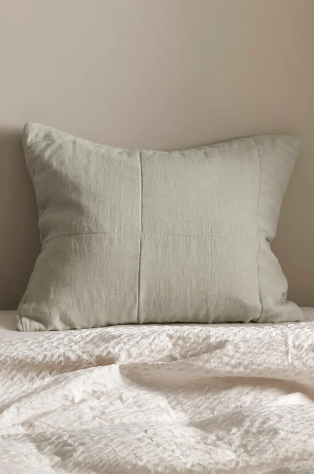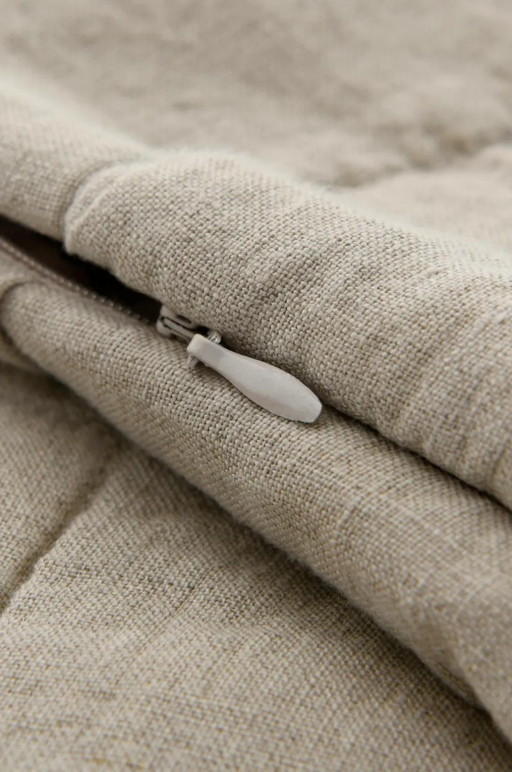 Let quiltet pudebetræk med forside i vasket hør. Bagside i bomuld. Lynlås. Str. 50×60 cm.