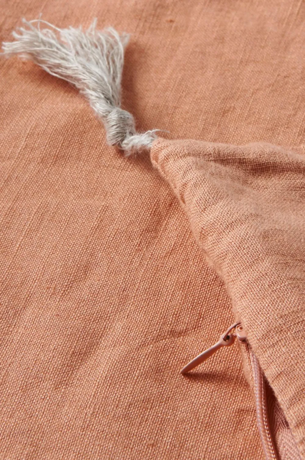 Siddehynde i blød vasket kvalitet af fransk hør med vintagelook og dekorative, håndsyede sting. Kvaste af hørgarn i alle hjørnerne. Skjult lynlås i bunden. Str. 50×50 cm.