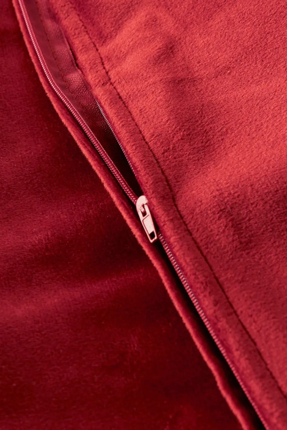 Pudebetræk af velour med fin glans. Af genindvundet polyester. Lynlås i bunden.