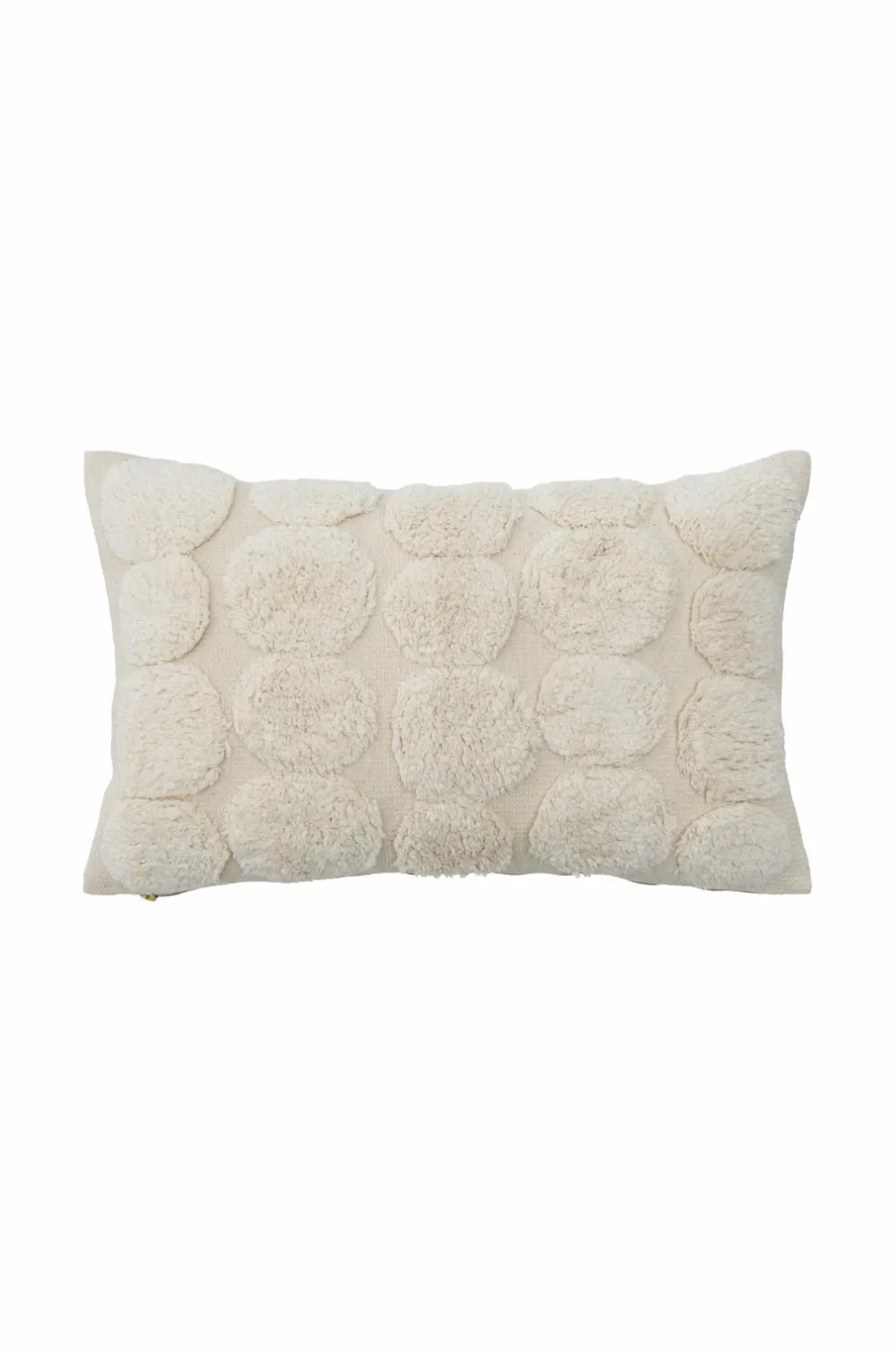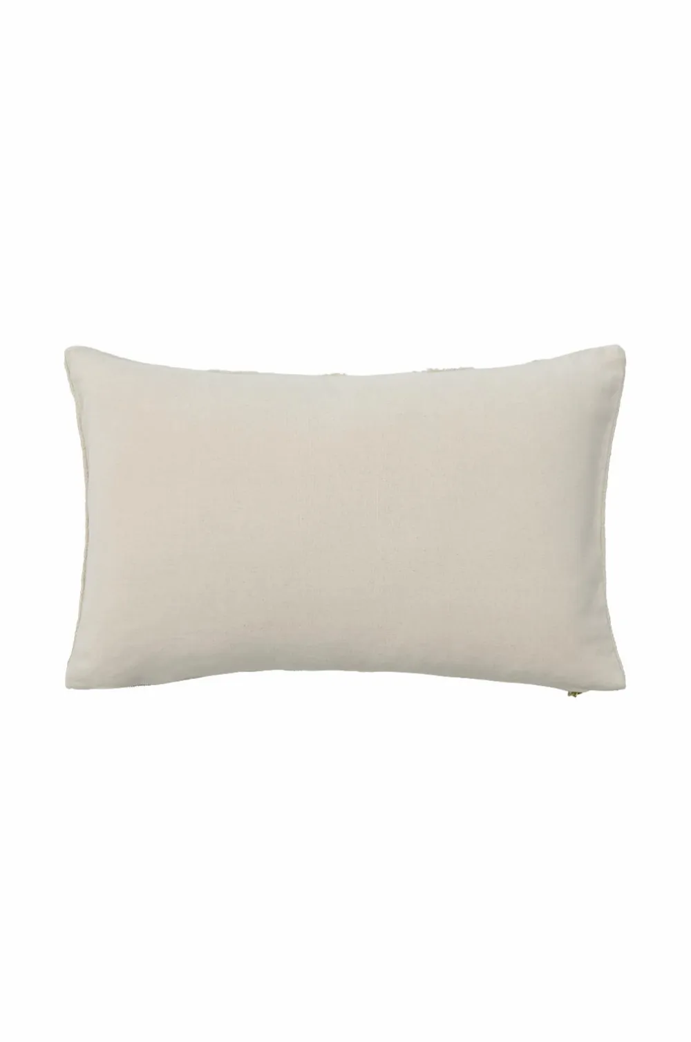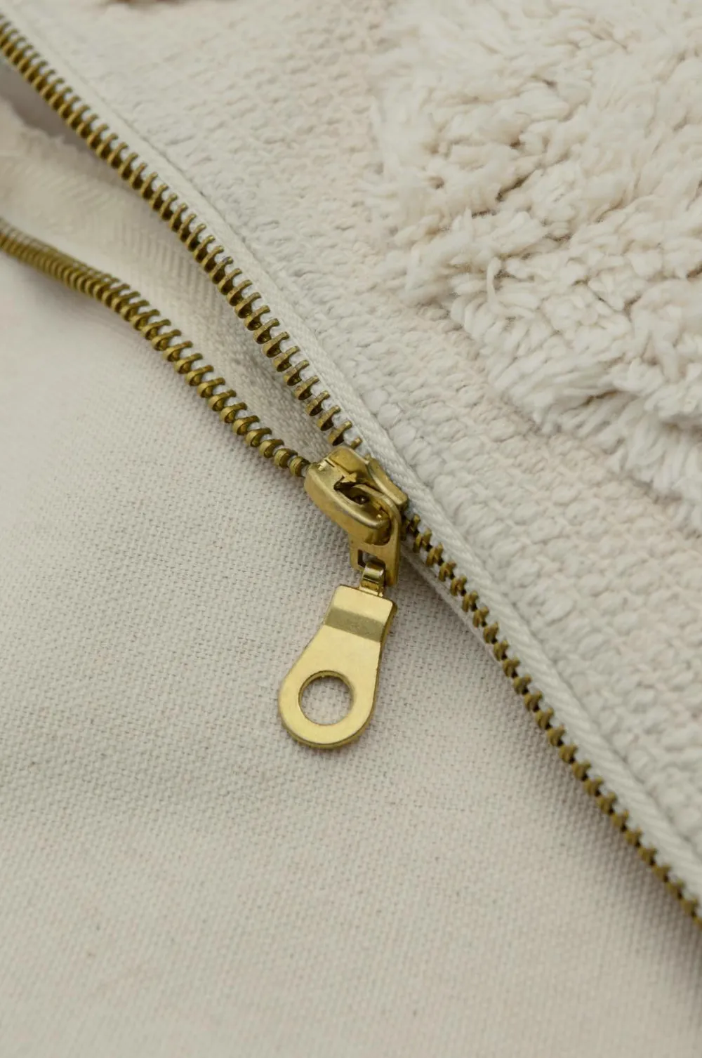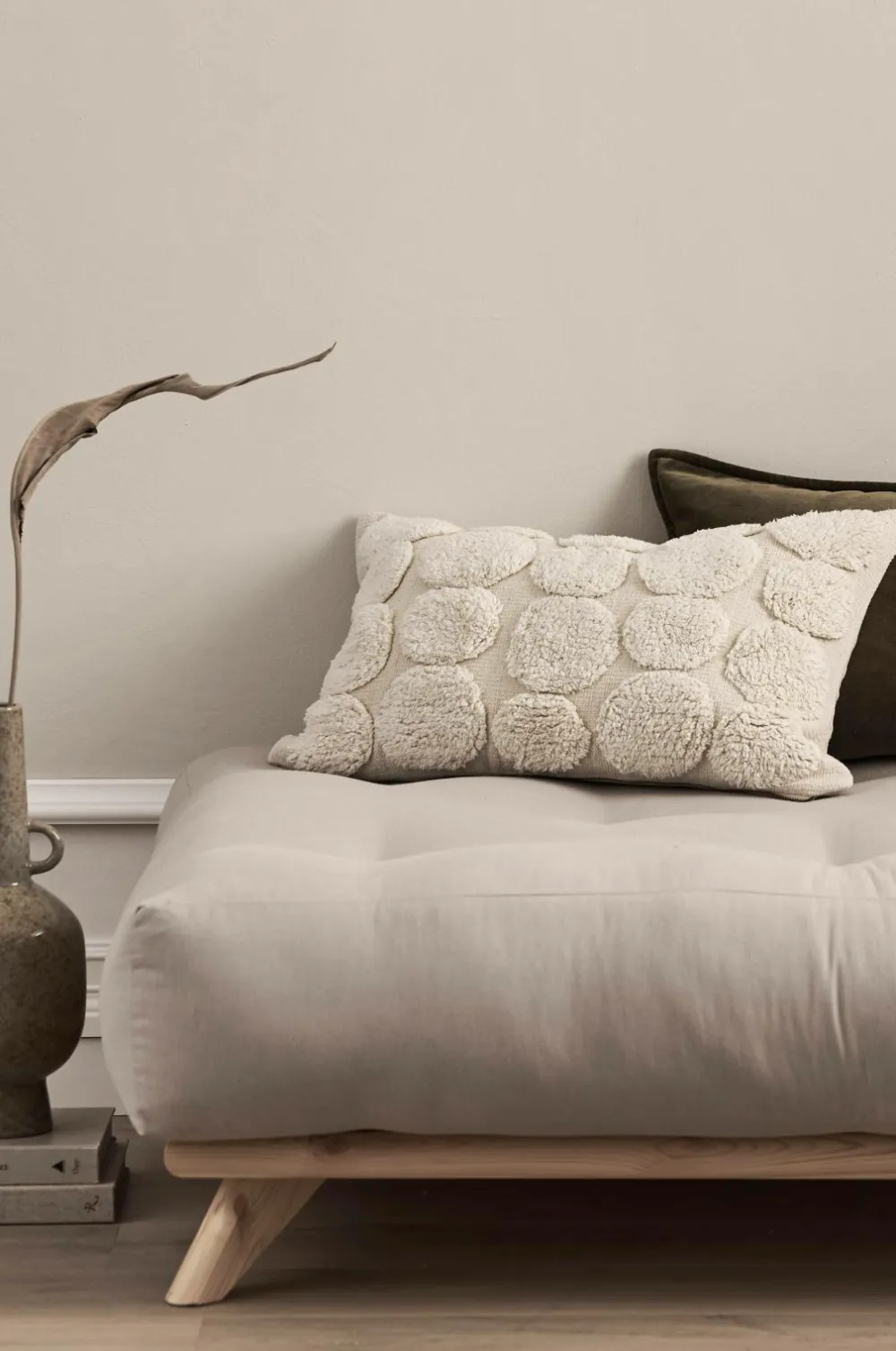 Pudebetræk i bomuld. Forsiden har et knyttet mønster på en lidt grovere, vævet kvalitet med let struktur. Ensfarvet bagside i kraftig halvpanama med frøskaller. Metallynlås i bunden.