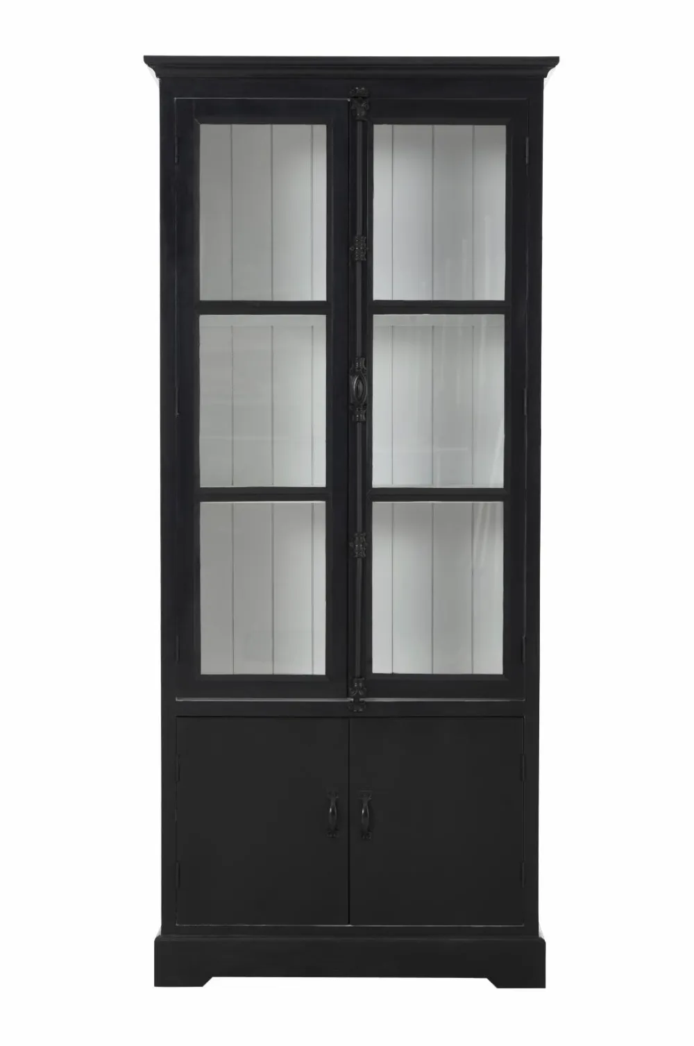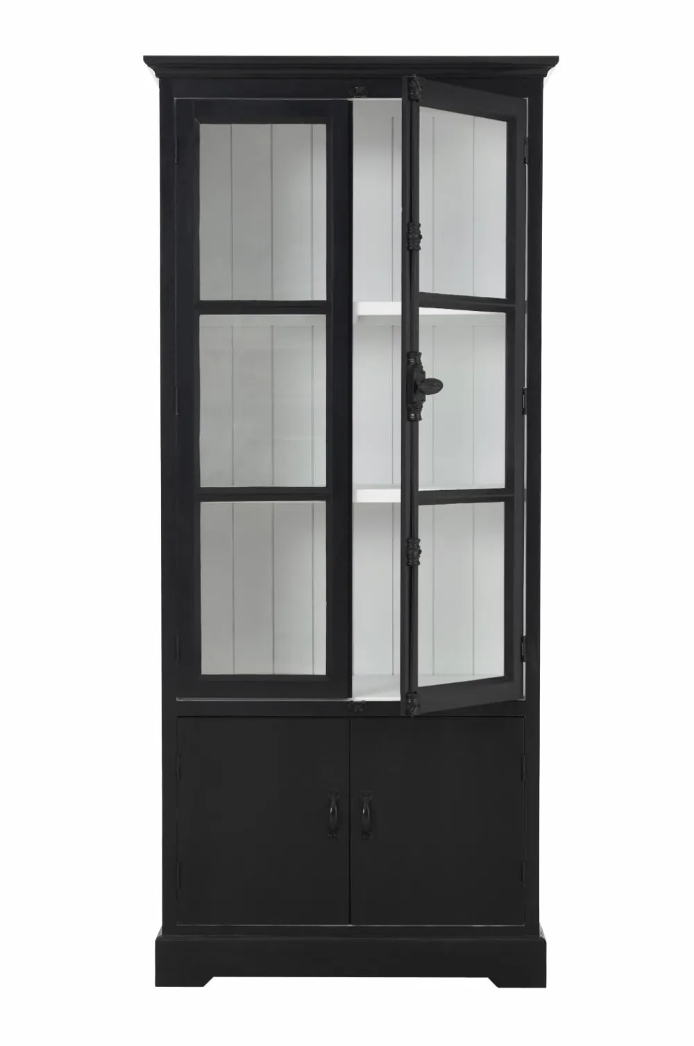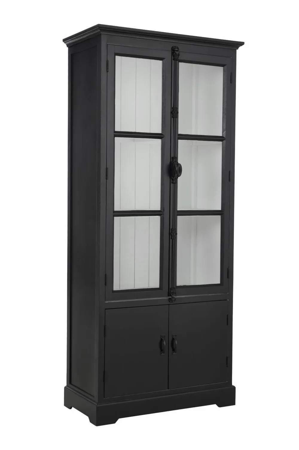 Skab med vitrinelåger og drejehåndtag. Bagstykke og bund af gran. Sidepaneler, overdel og hylder af MDF. Låger af MDF og glas, tykkelse 3 mm. 2 faste hylder af træ. Underskab uden hylder. Højde 180 cm. Dybde 40 cm. Bredde 80 cm. Maksimal belastning pr. hylde 20 kg. Lev. monteret.