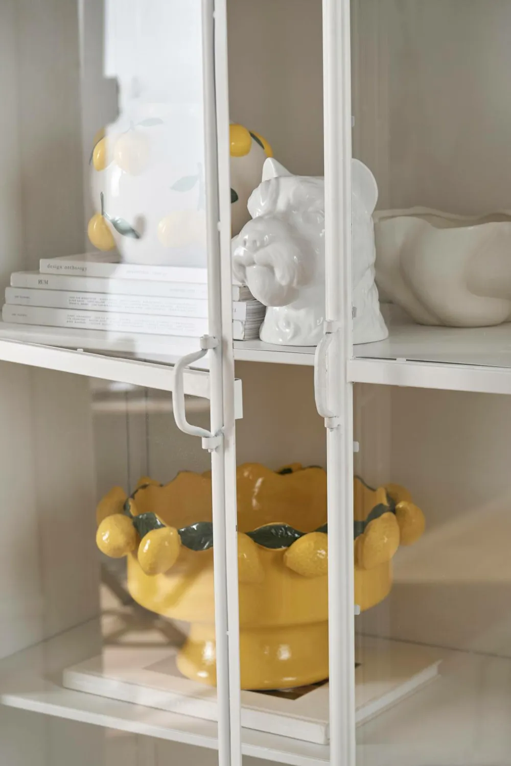 Hvælvet skab i metal. To låger med metalramme og hærdet, klart glas. Lågerne har magnetstop. 4 faste hylder i metal. Maks. vægt 10 kg/hylde. Hul på bagsiden til montering på væggen. Mål: Bredde 100 cm, højde 197 cm, dybde 40 cm. Benhøjde 26,5 cm. Hyldens indvendige mål 37 cm x 97 cm. Ca. 37 cm mellem hylderne. Leveres samlet.