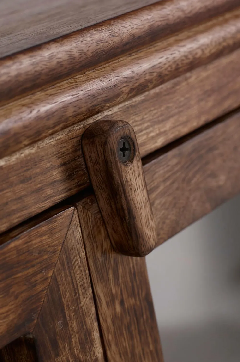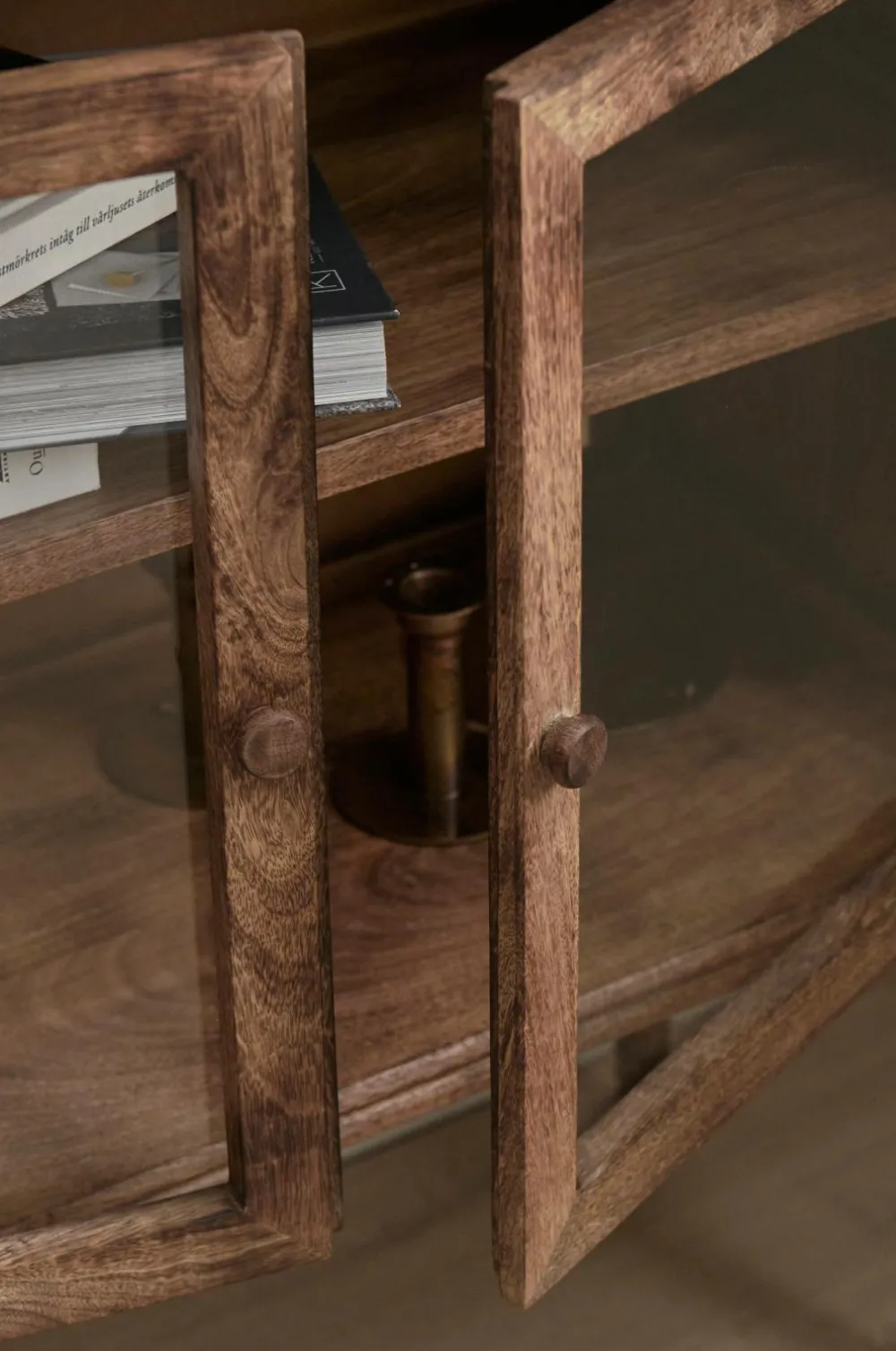 Letplaceret skænk af mangotræ. To vitrinedøre med glaslåger, træhåndtag og en dekorativ udvendig, drejelig dørstopper som holder døren lukket. Skabet har en fast hylde, højde på begge sider af hyldefladen 20 cm. Total mål: Højde 80 cm, bredde 80 cm, dybde 31 cm. Benhøjde 30 cm. Maks. belastning: 10 kg ovenfor og 10 kg på hver hylde (i alt 30 kg). Leveres monteret (benene skrues først på ved leveringen). Vægt 16 kg.