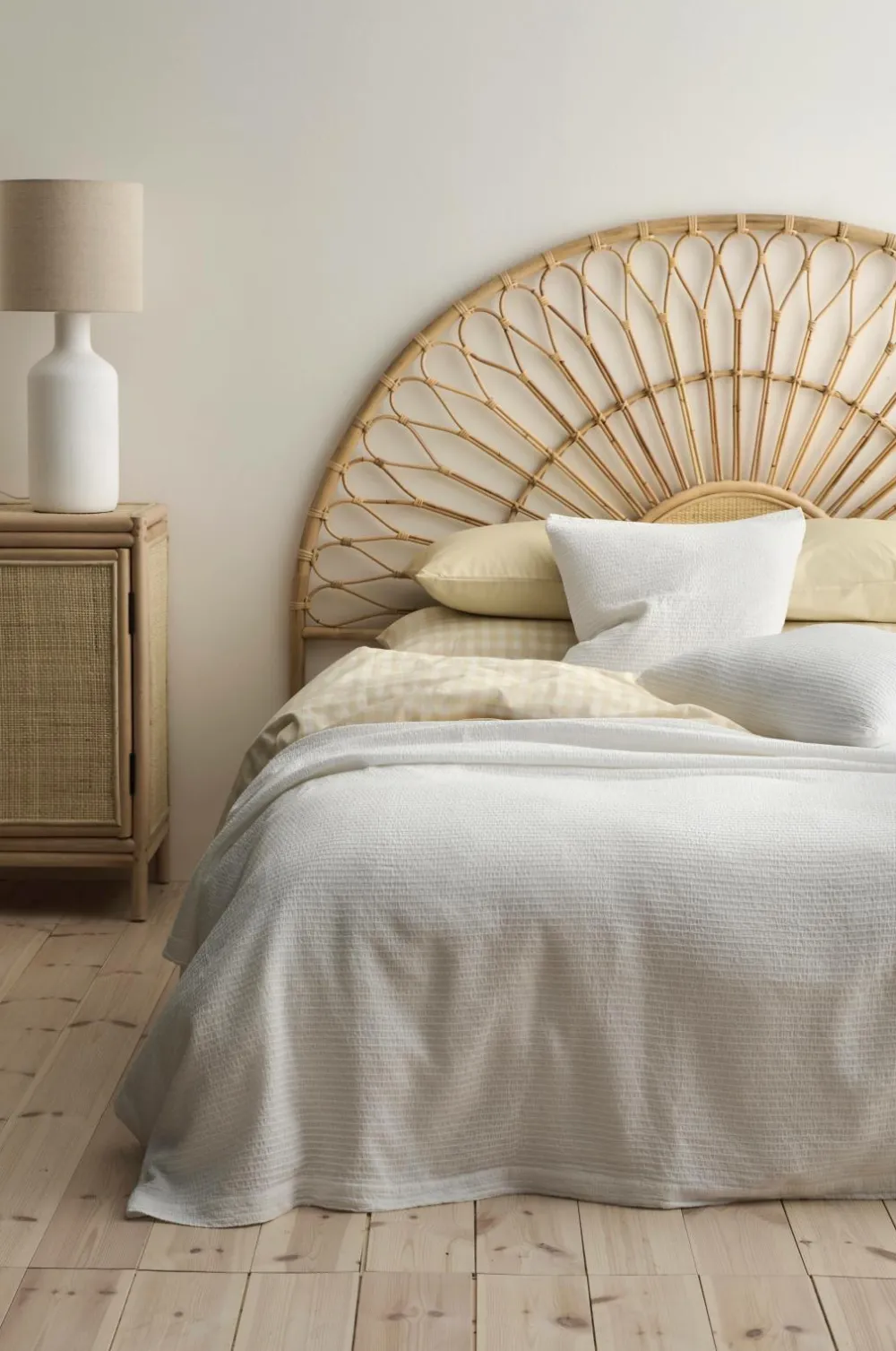Hovedgavl i rotting og plywood. Gavlen stilles på gulvet. Frihøjde under møbel 33 cm. Leveres samlet.