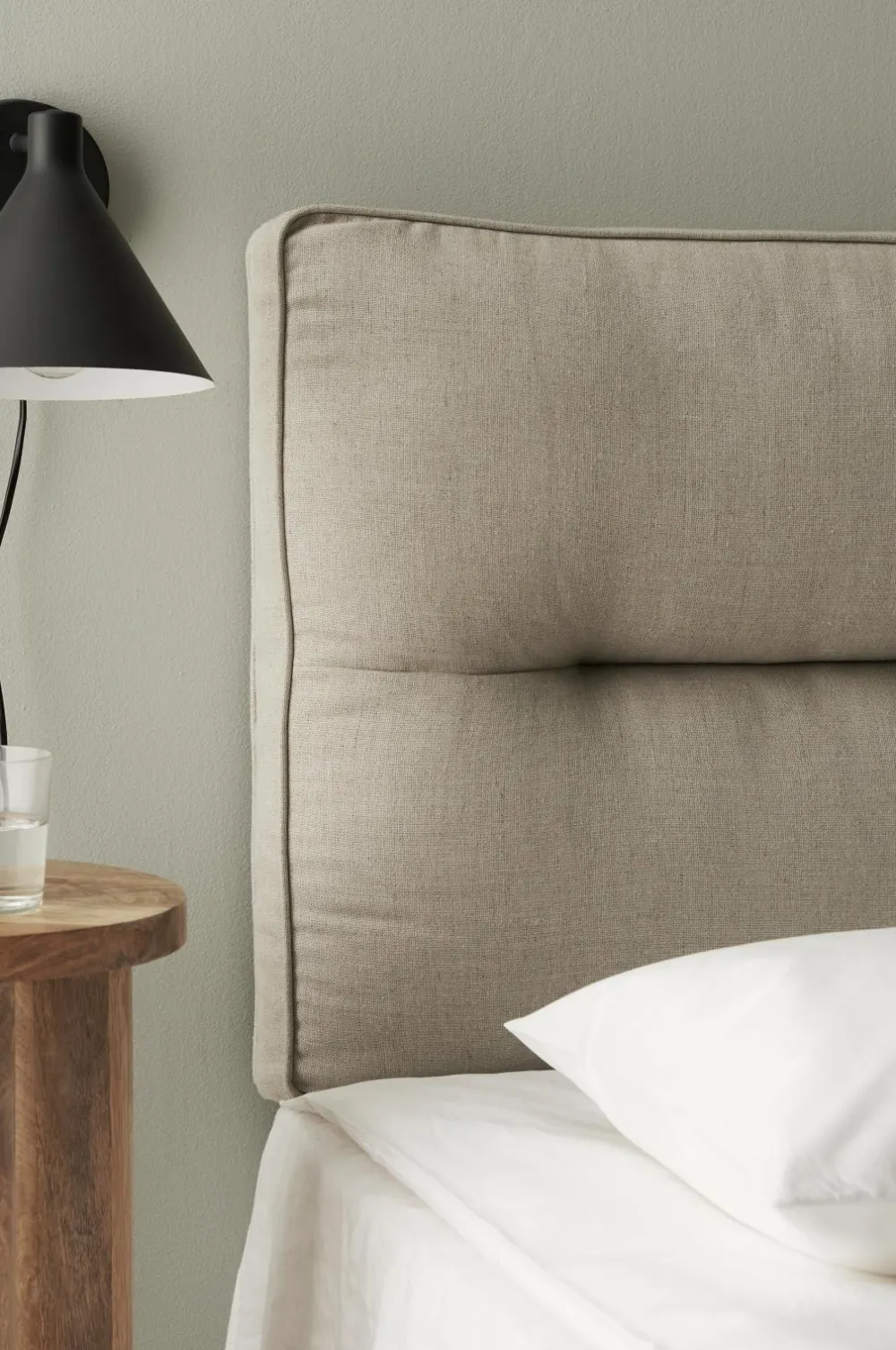 Sengegavl som hænges op på væggen. Betræk af 100% hør og skumfyld. Bredde 180 cm, højde 60 cm, dybde 16 cm.