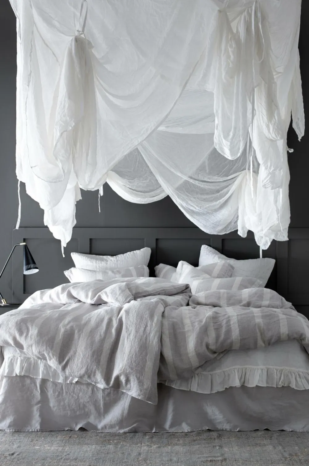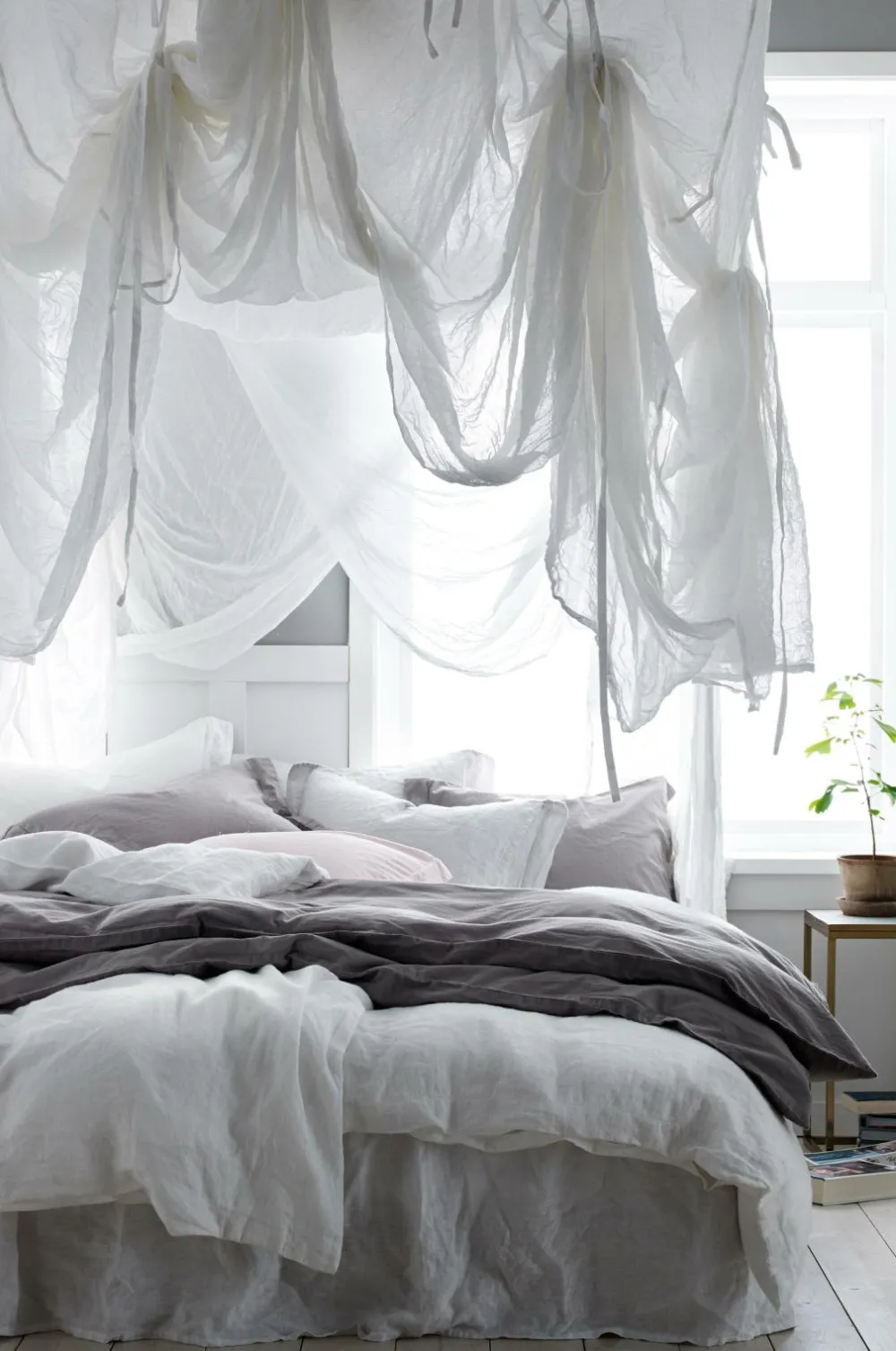 Sengehimmel i hvidt, luftigt, transparent bomuldsstof. Firkantet model med bånd i hvert hjørne som du bruger til at sætte sengehimlen fast med. Der følger nogle bånd med, så du kan binde stoffet på forskellige måder. Str. 200x200x250 cm.