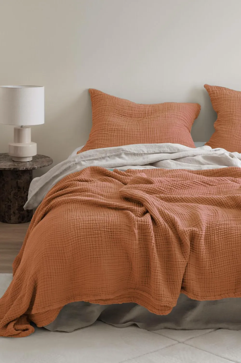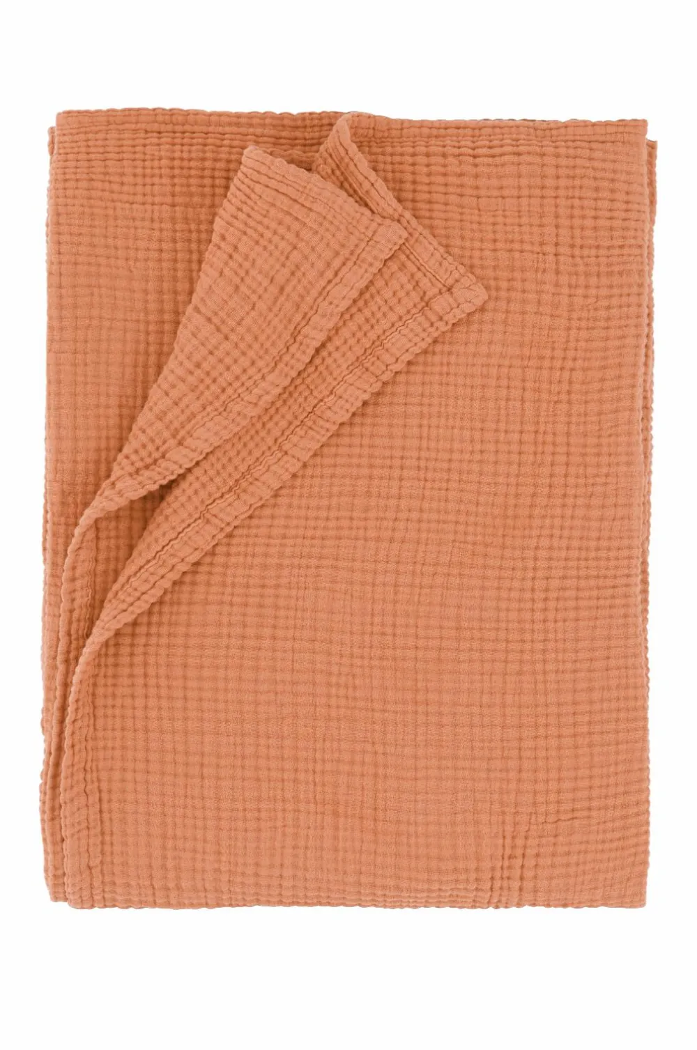Sengetæppe af økologisk bomuldsmuslin i 4 lag. Sømmede kanter. Leveres rullet.