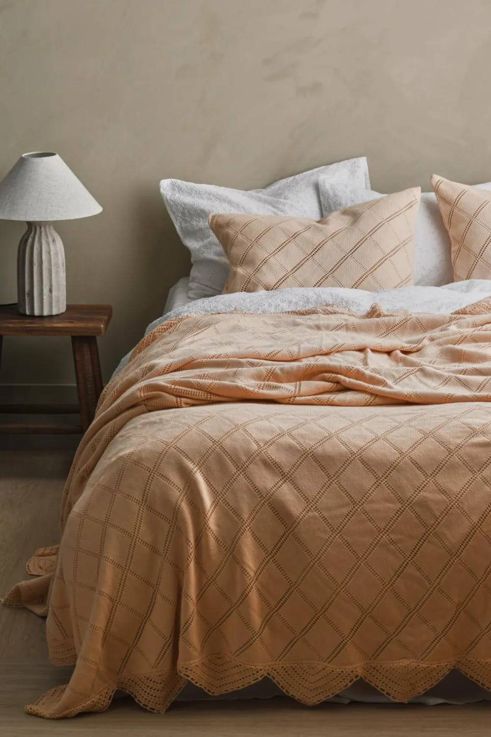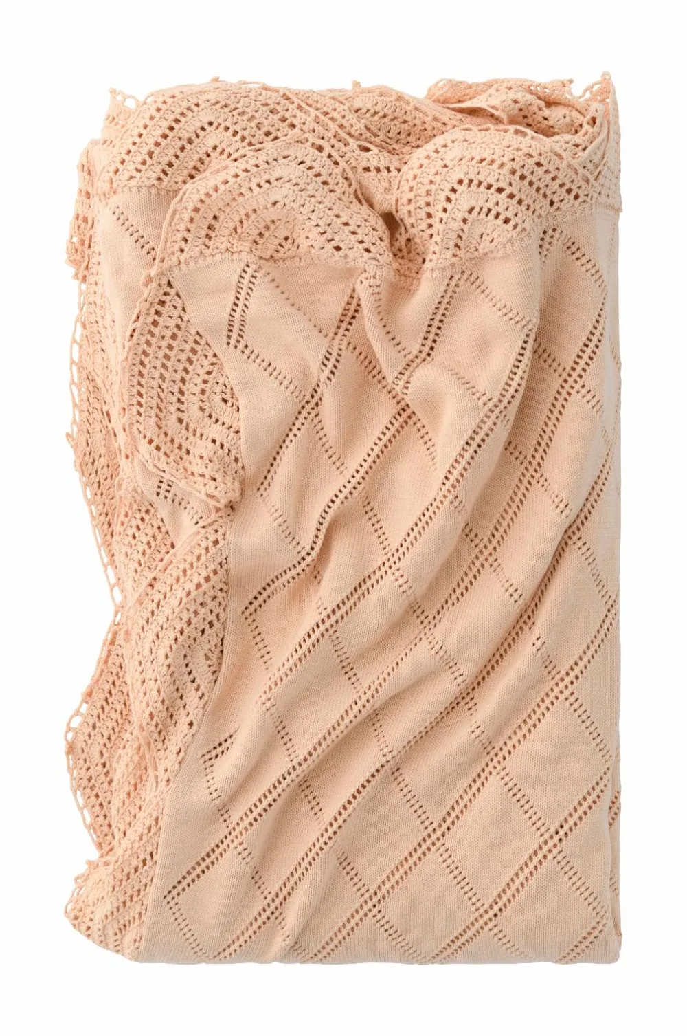 Sengetæppe i vasket bomuldskvalitet med hæklet kant rundt om og broderet mønster.