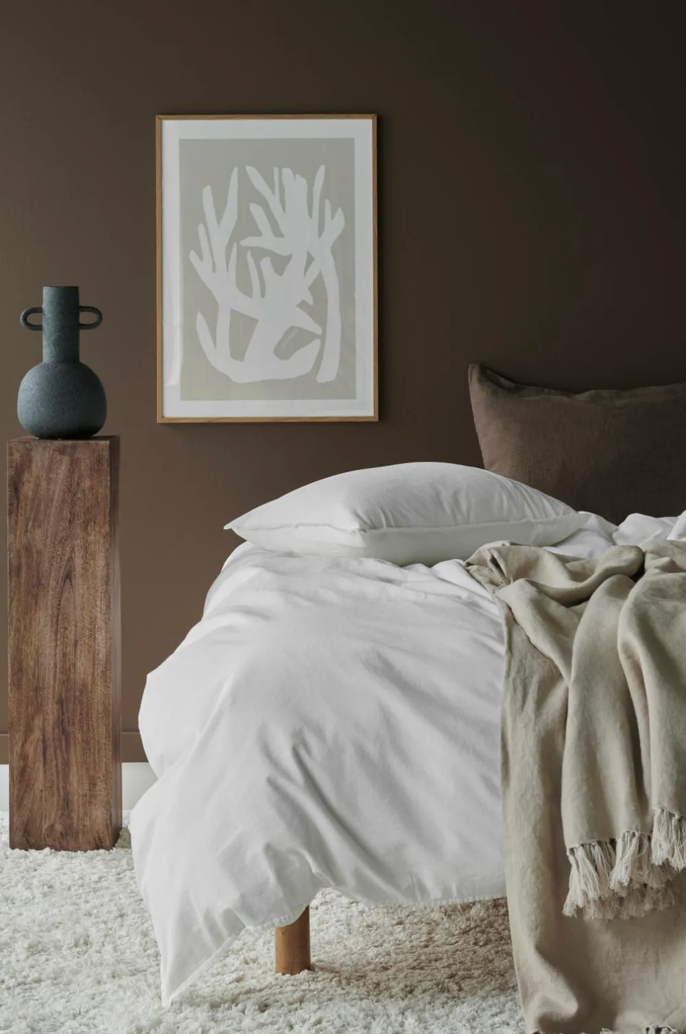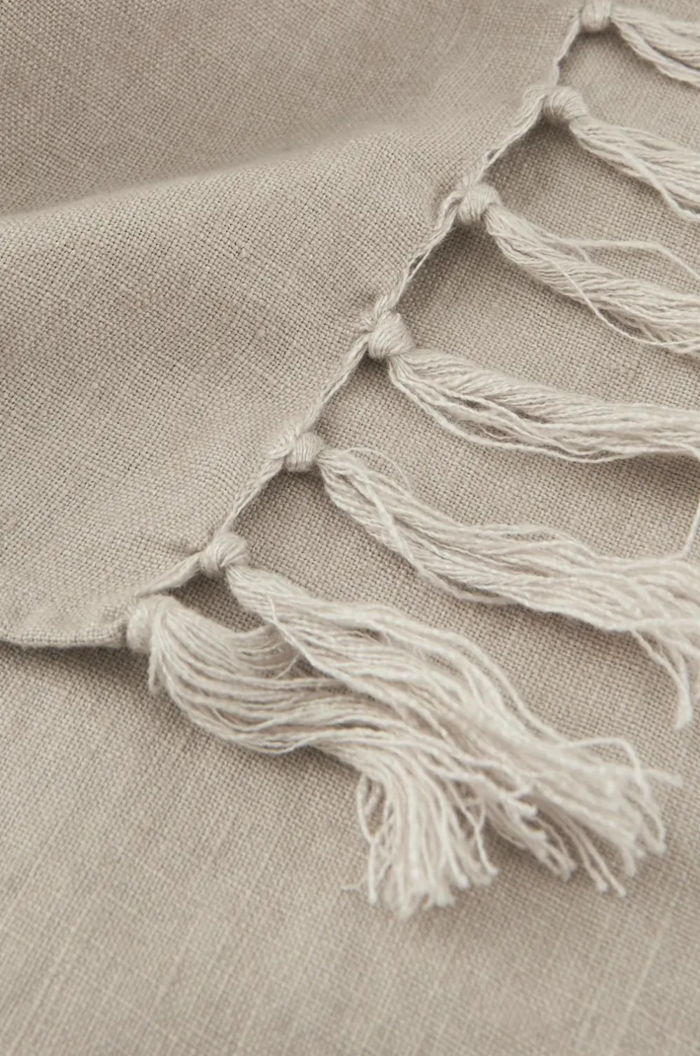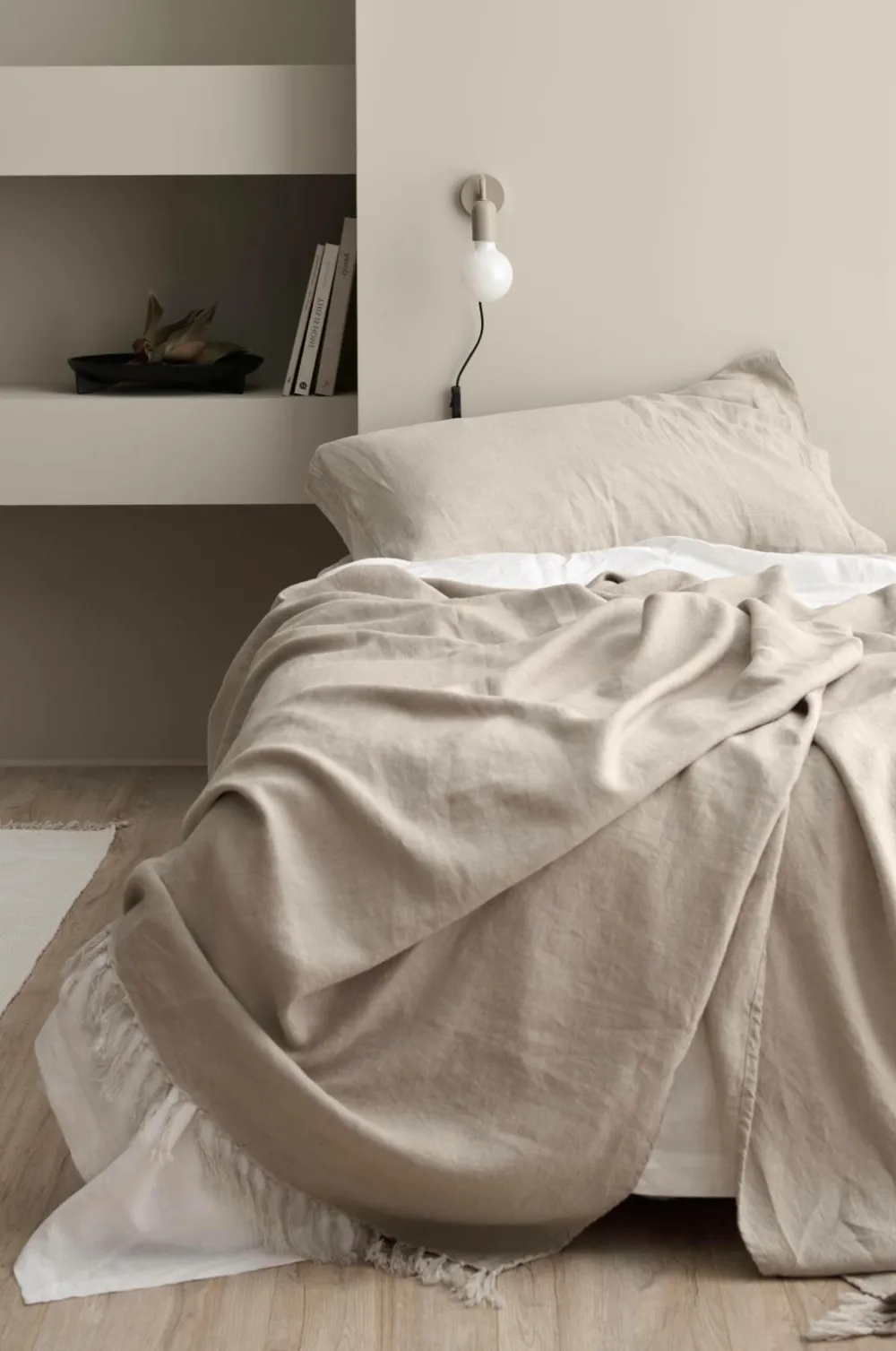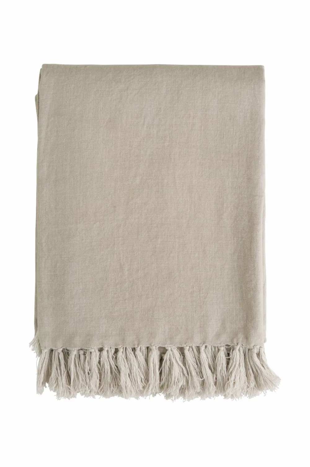 Sengetæppe af vasket, fransk hør i kraftig kvalitet med frynser på to sider. Kan også anvendes som plaid.