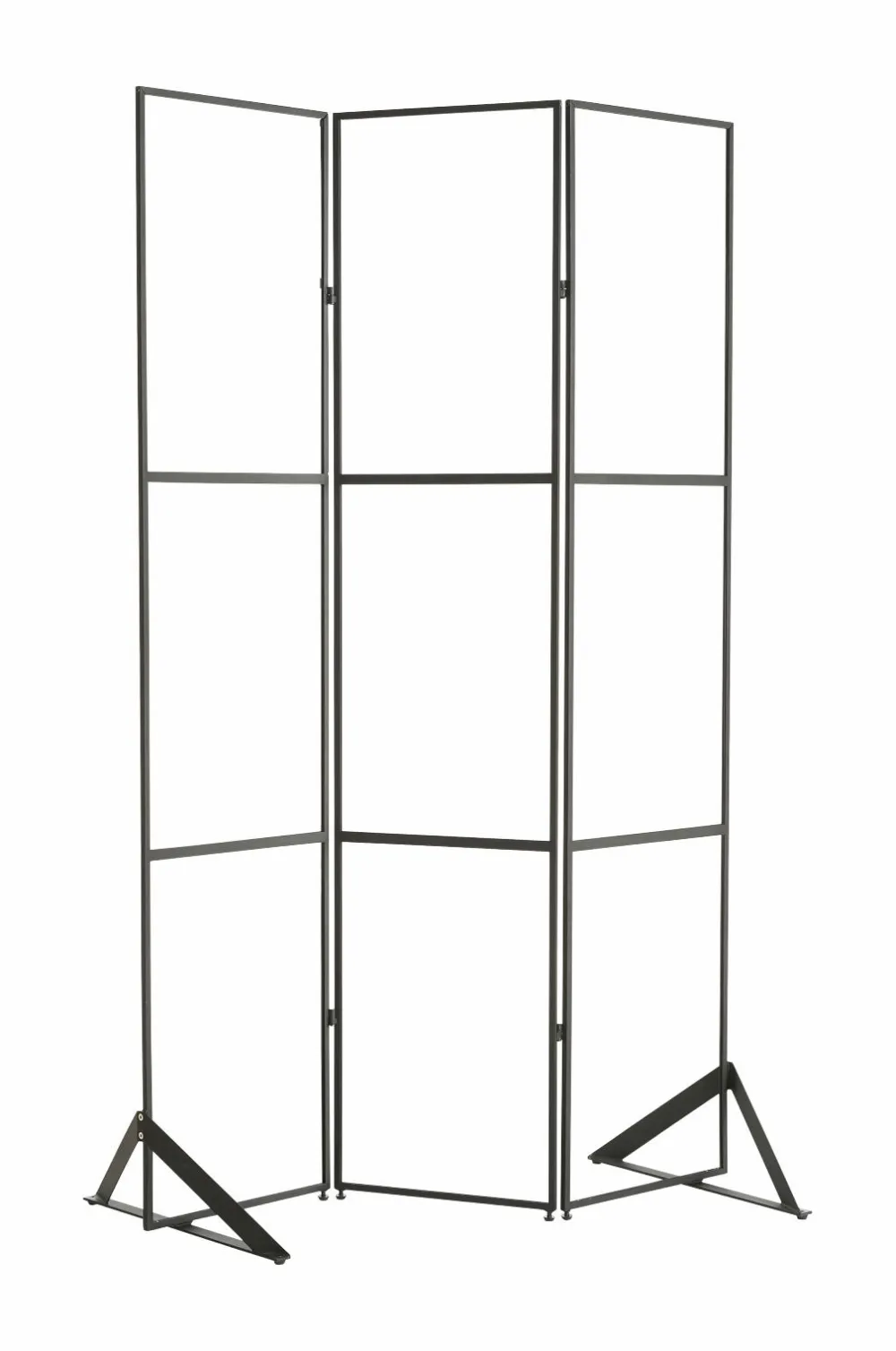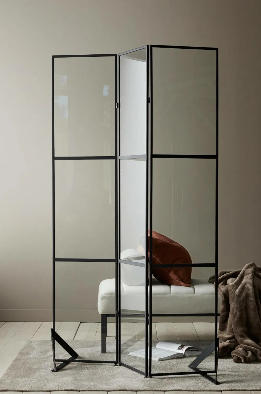 Skærmvæg/rumdeler i industrielt look med 3 sammenfoldelige dele. Ramme af pulverlakeret metal med hærdet klart glas. Ben af metal. Totalmål: Bredde 120 cm, højde 180 cm, dybde 1,2 cm. Bredde på hver del 40 cm. Lev. usamlet.