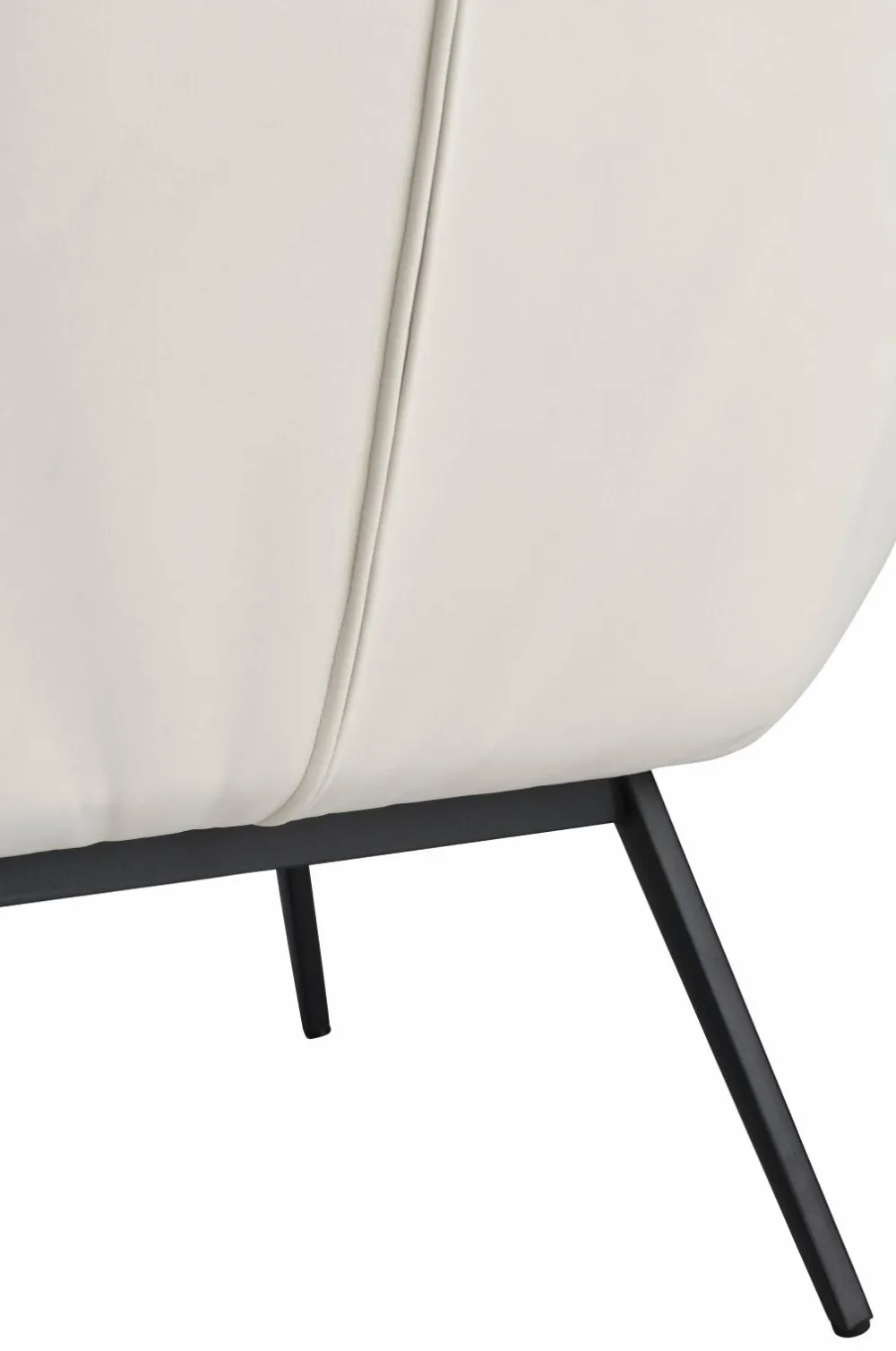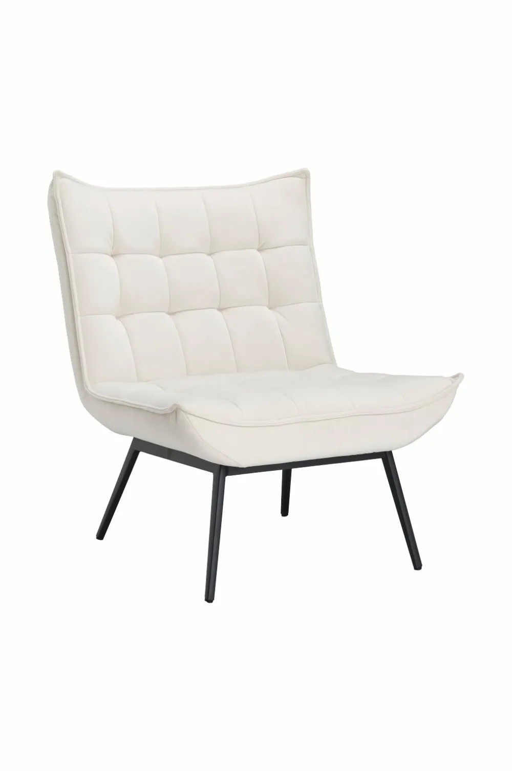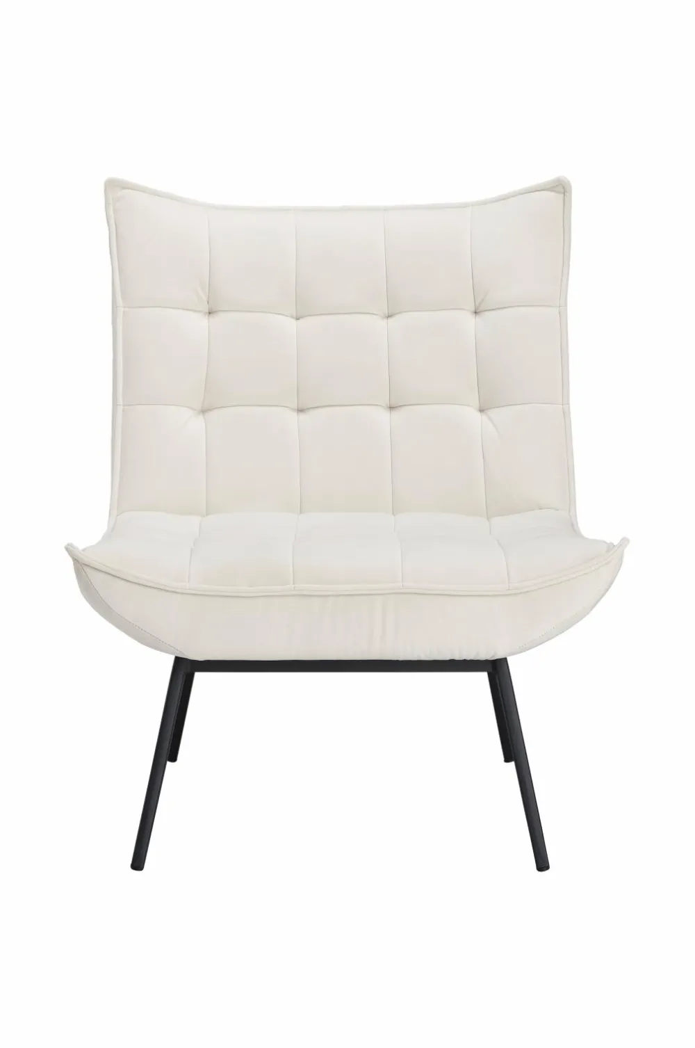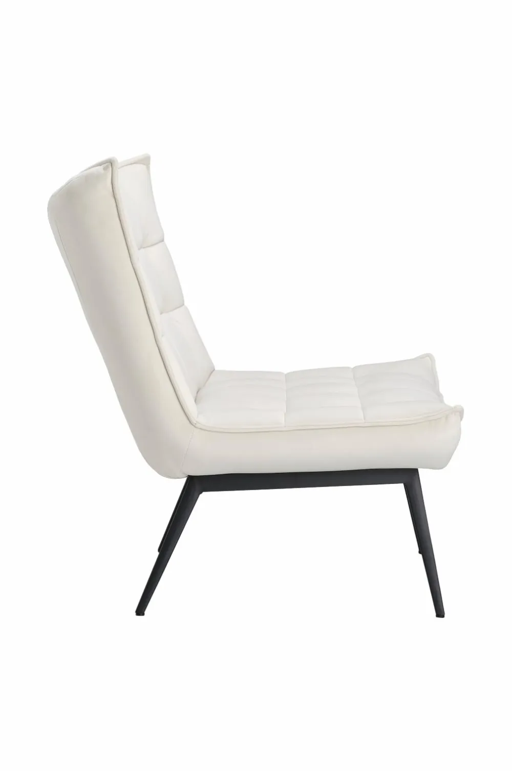 Lænestol med paspoleret kant rundt om. Indfældninger, der danner et dekorativt ternet mønster. Skumfyld. Ben af metal. Lettere samling.