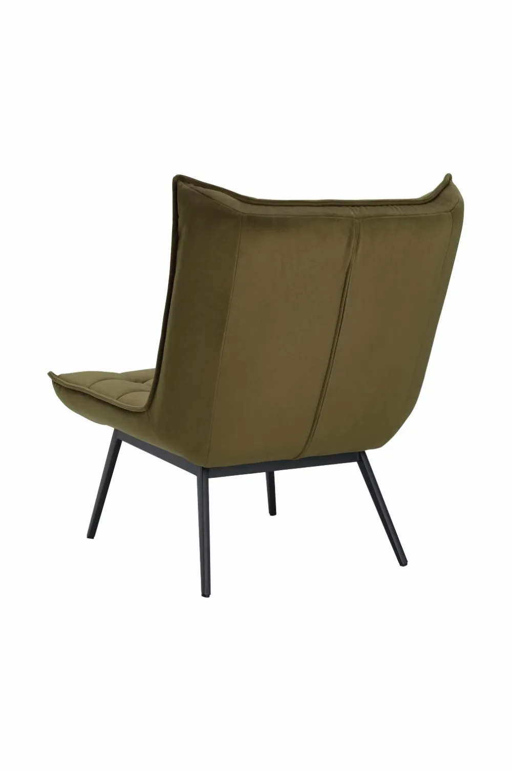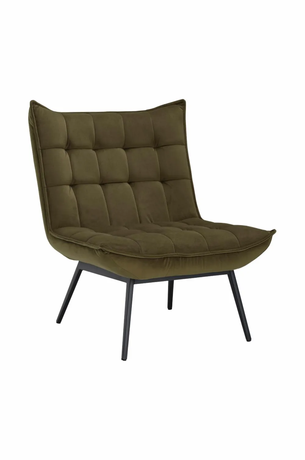 Lænestol med paspoleret kant rundt om. Indfældninger, der danner et dekorativt ternet mønster. Skumfyld. Ben af metal. Lettere samling.