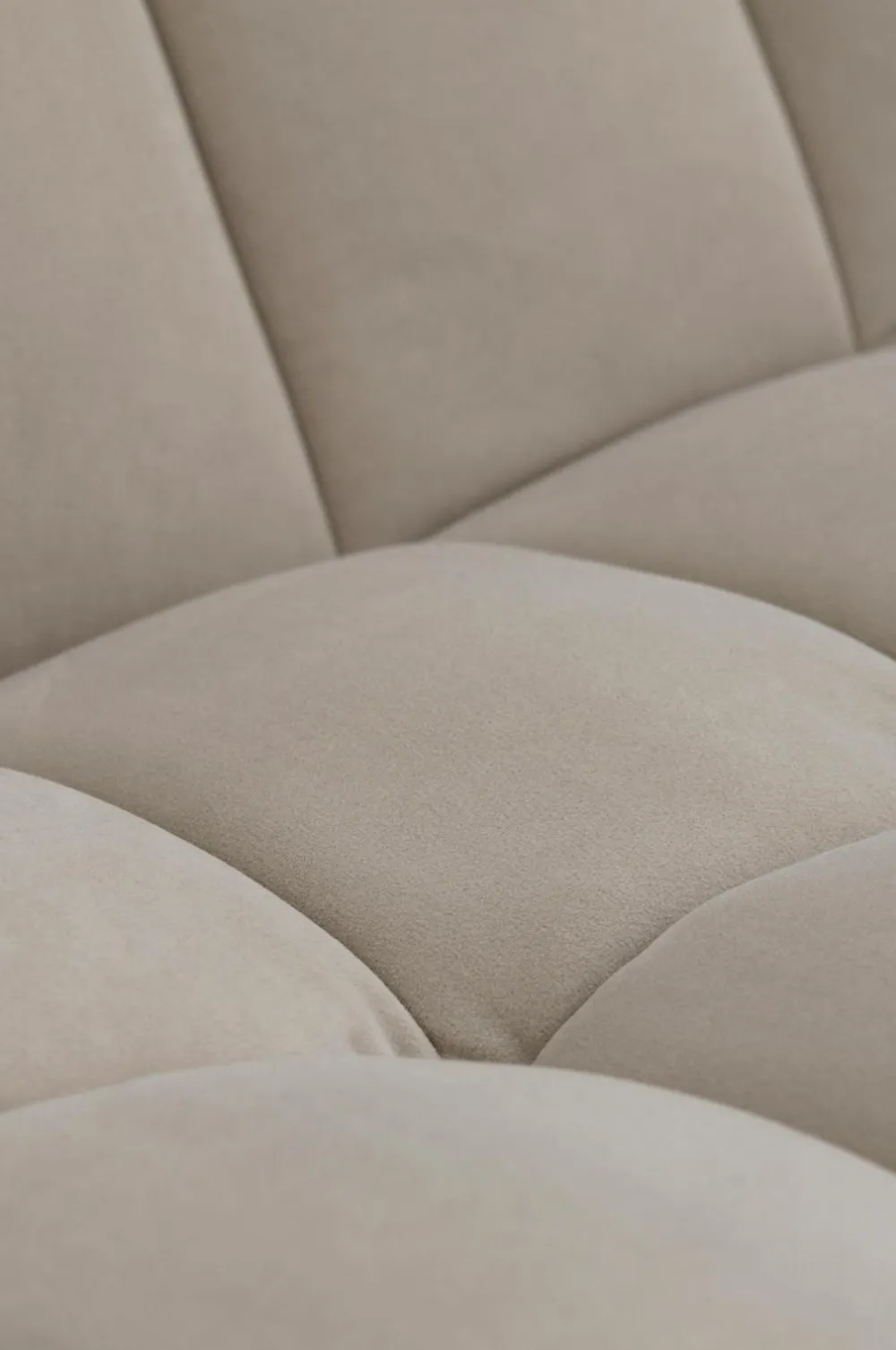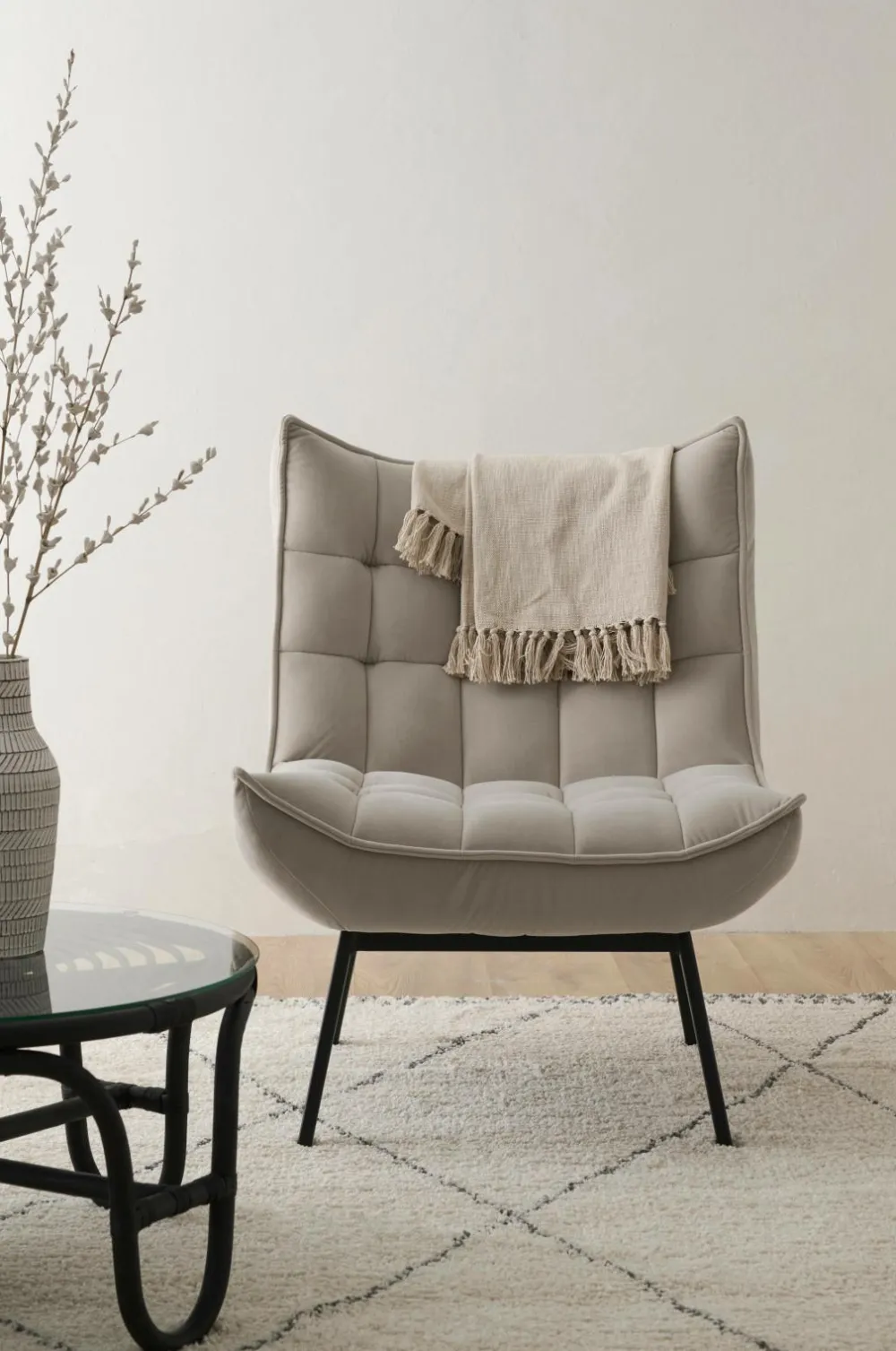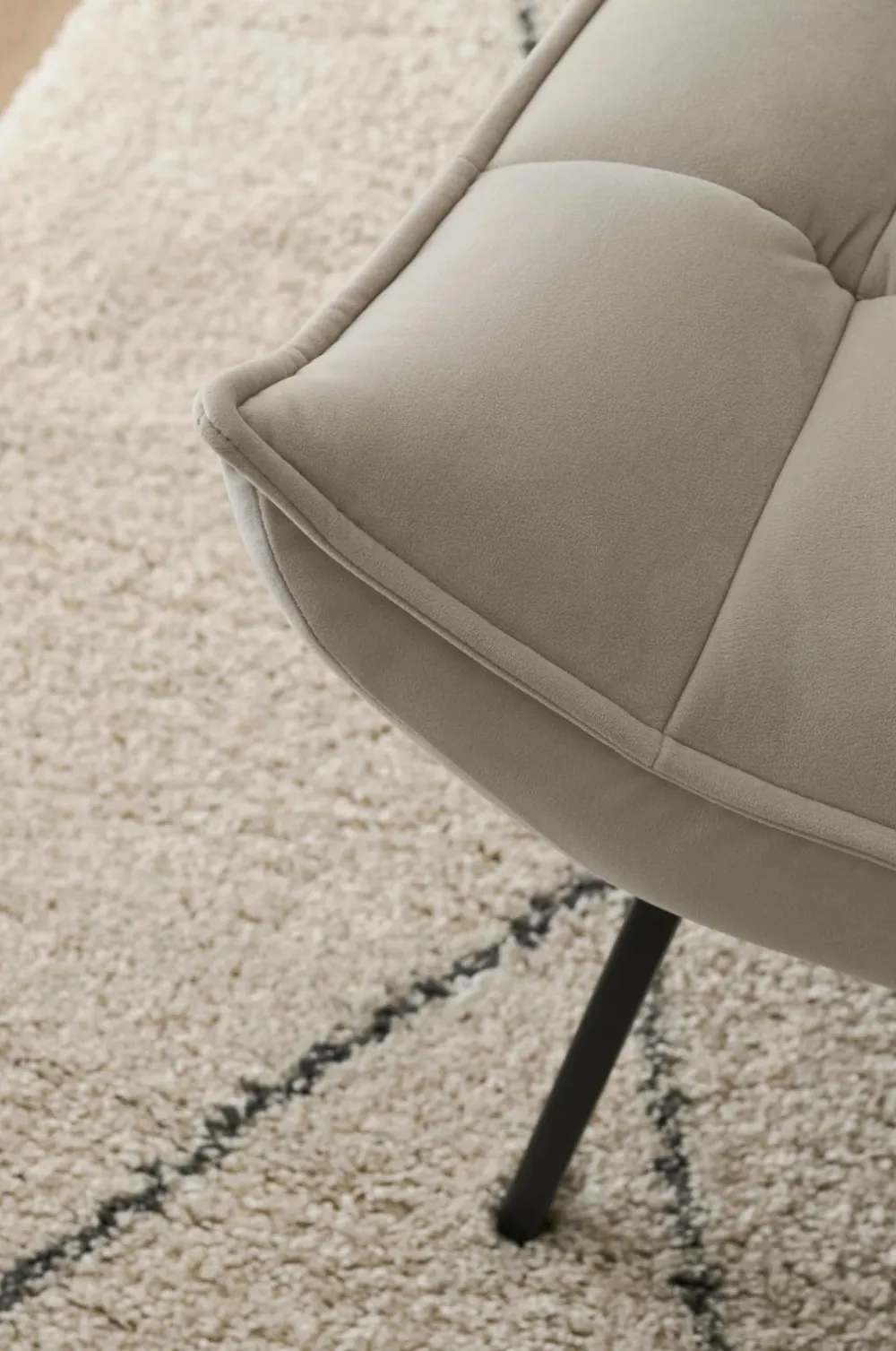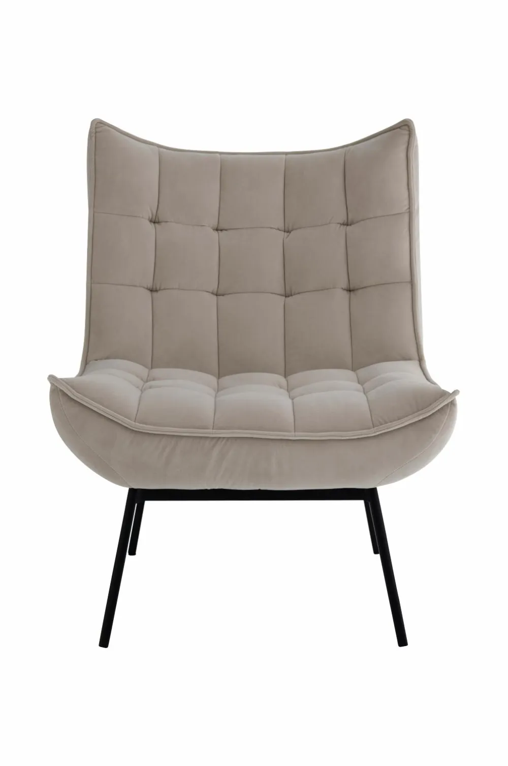 Lænestol med paspoleret kant rundt om. Indfældninger, der danner et dekorativt ternet mønster. Skumfyld. Ben af metal. Lettere samling.