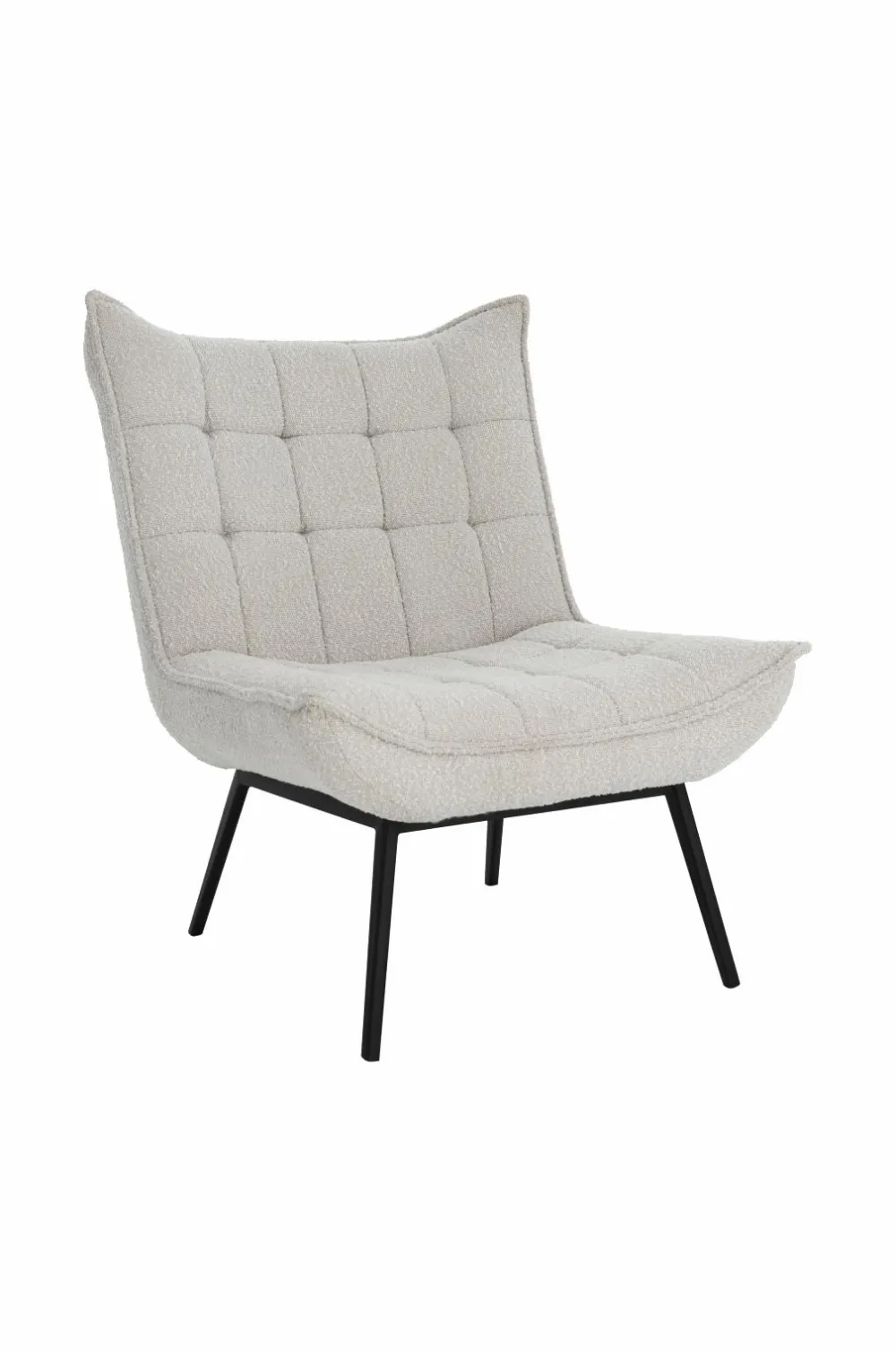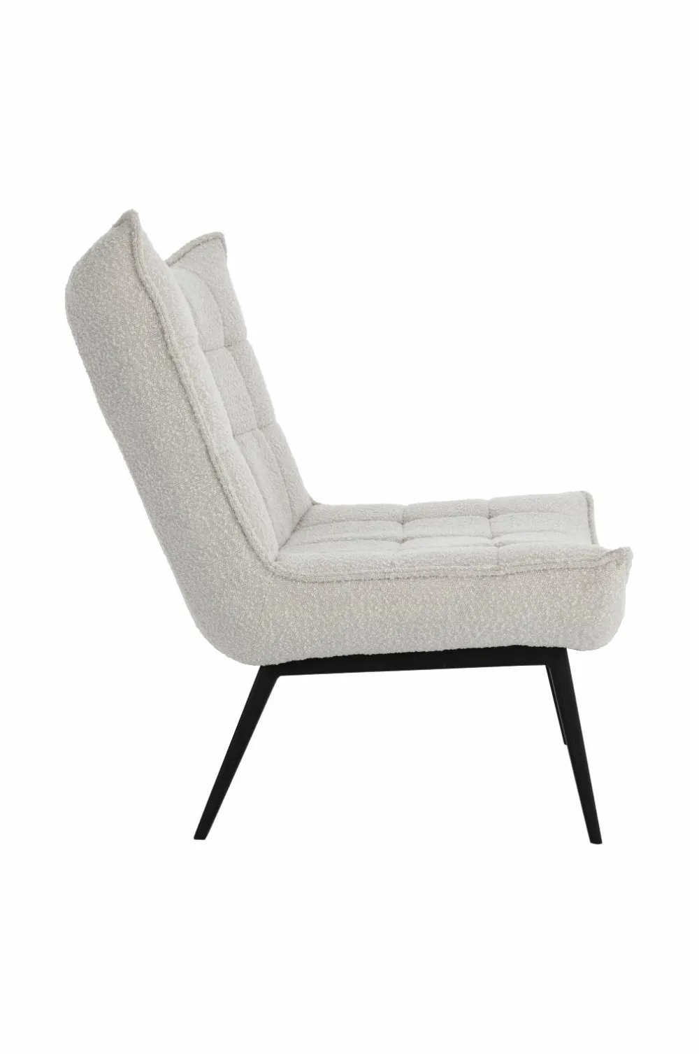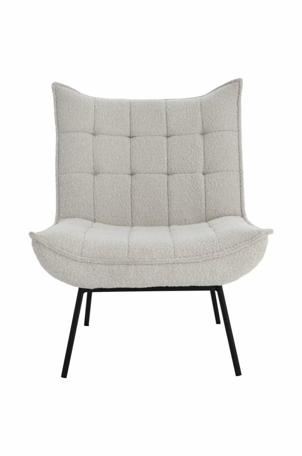 Lænestol med paspoleret kant rundt om. Betræk i bouclé med indfældninger, der danner et dekorativt ternet mønster. Skumfyld. Ben af metal. Lettere samling.